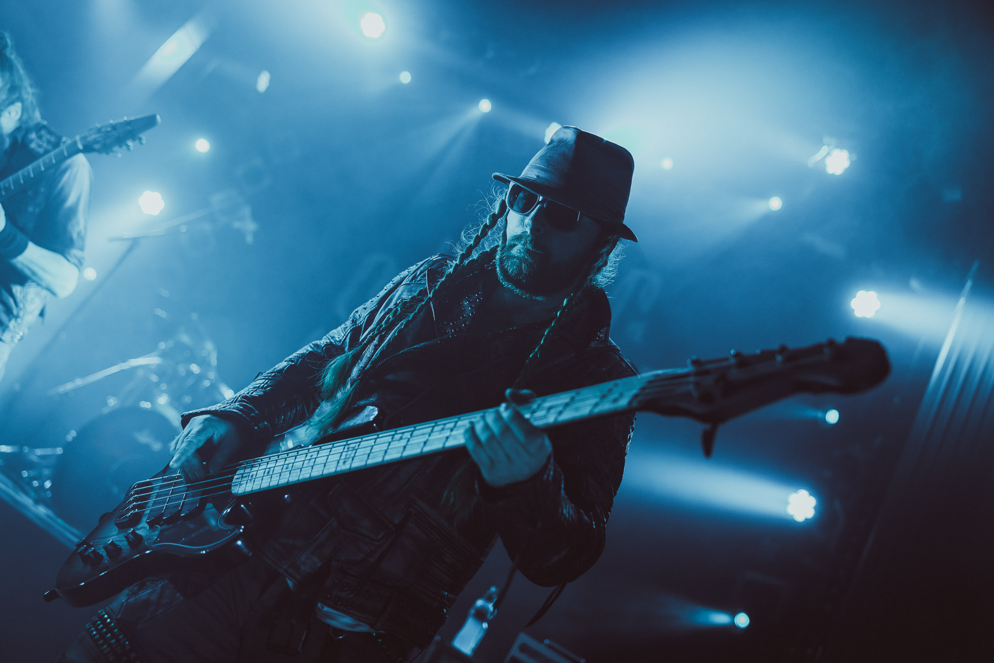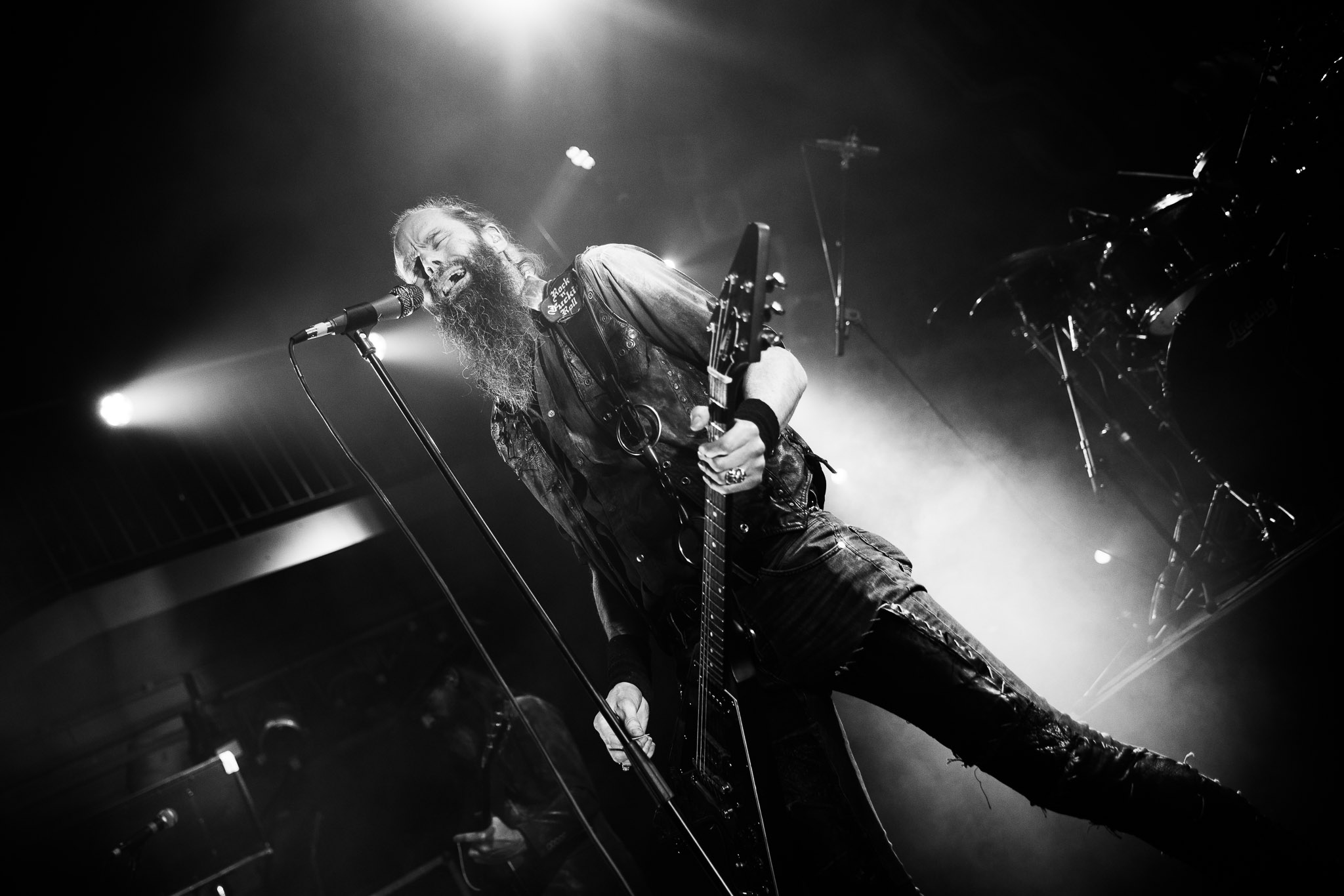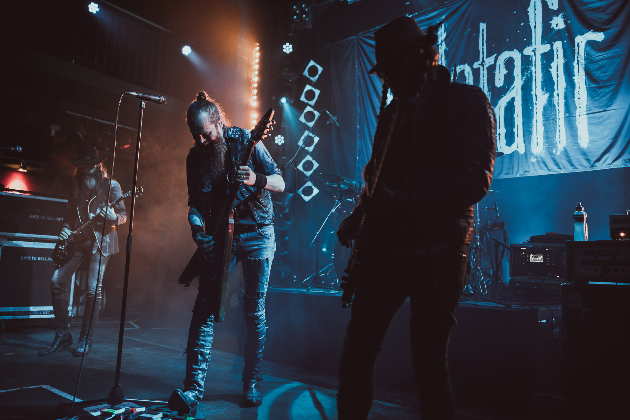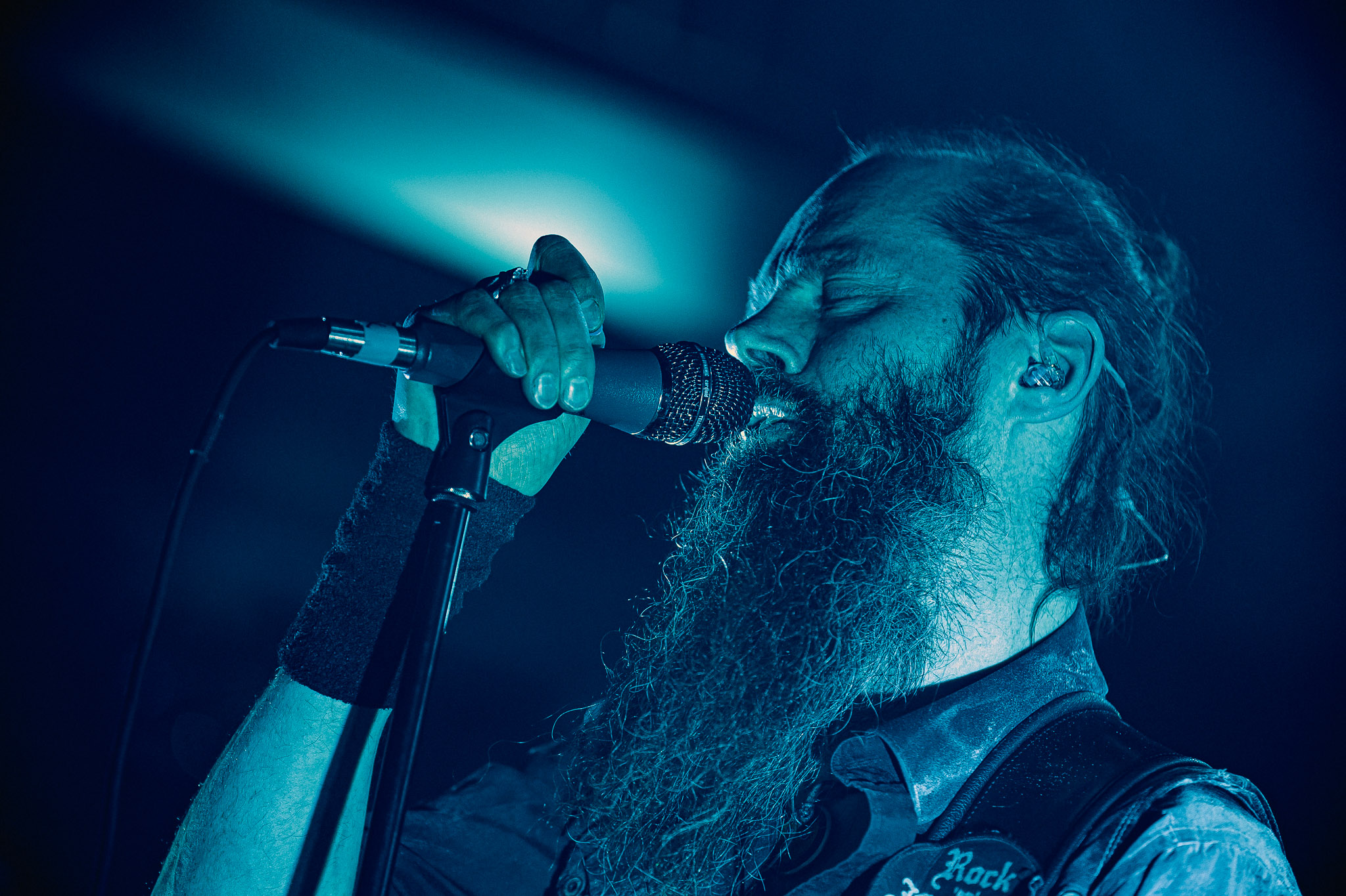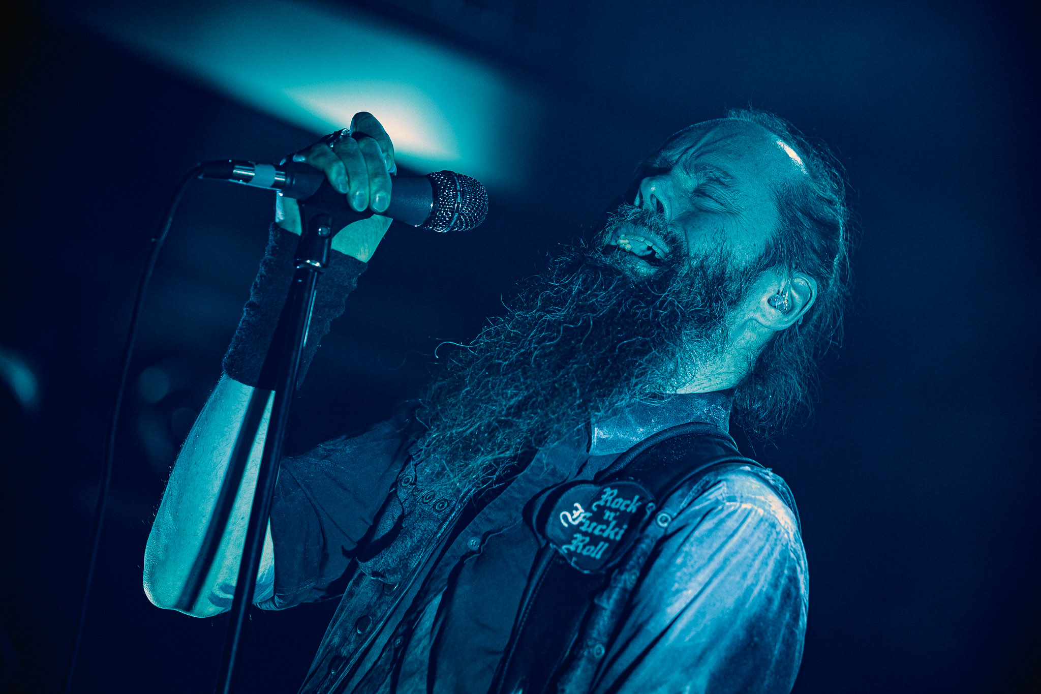 Nach kurzer Umbaupause kündigt das Backtrog die mächtigen Solstafir an. Zudem steht bereits Aðalbjörns Gitarre rechts an der Bühne, „Náttfari wird als Intro gespielt. Die Band braucht keine weitere große Einführung oder Vorstellung. Mit deren Betreten der Bühne beginnt das Publikum mit voller Begeisterung mitzugehen. Charisma und absolute Bühnenpräsenz werden hier lehrfilmmäßig dargeboten. Ich habe die Isländer schon ein paar Mal live erleben dürfen, doch dieser Auftritt sollte die bisherigen Live Darbietungen in den Schatten stellen. Mit „Nattmal“ und „Köld“ geht es hinein in den isländischen Abend. SOLSTAFIR zeigen eindrucksvoll, dass es keiner vieler Worte braucht, um das Publikum zu lenken. Sänger Aðalbjörn schafft es mit einfachen Gesten, das Publikum zur völligen Ruhe zu bringen, als einige Zuschauer in den ruhigen Parts das Schreien anfingen. Ein weiteres Highlight des Abends ist wohl der Geburtstag von Sæþór Maríus Sæþórsson. Mit gewohnt minimalistischer Gestik nimmt er die Glückwünsche des Publikums an.