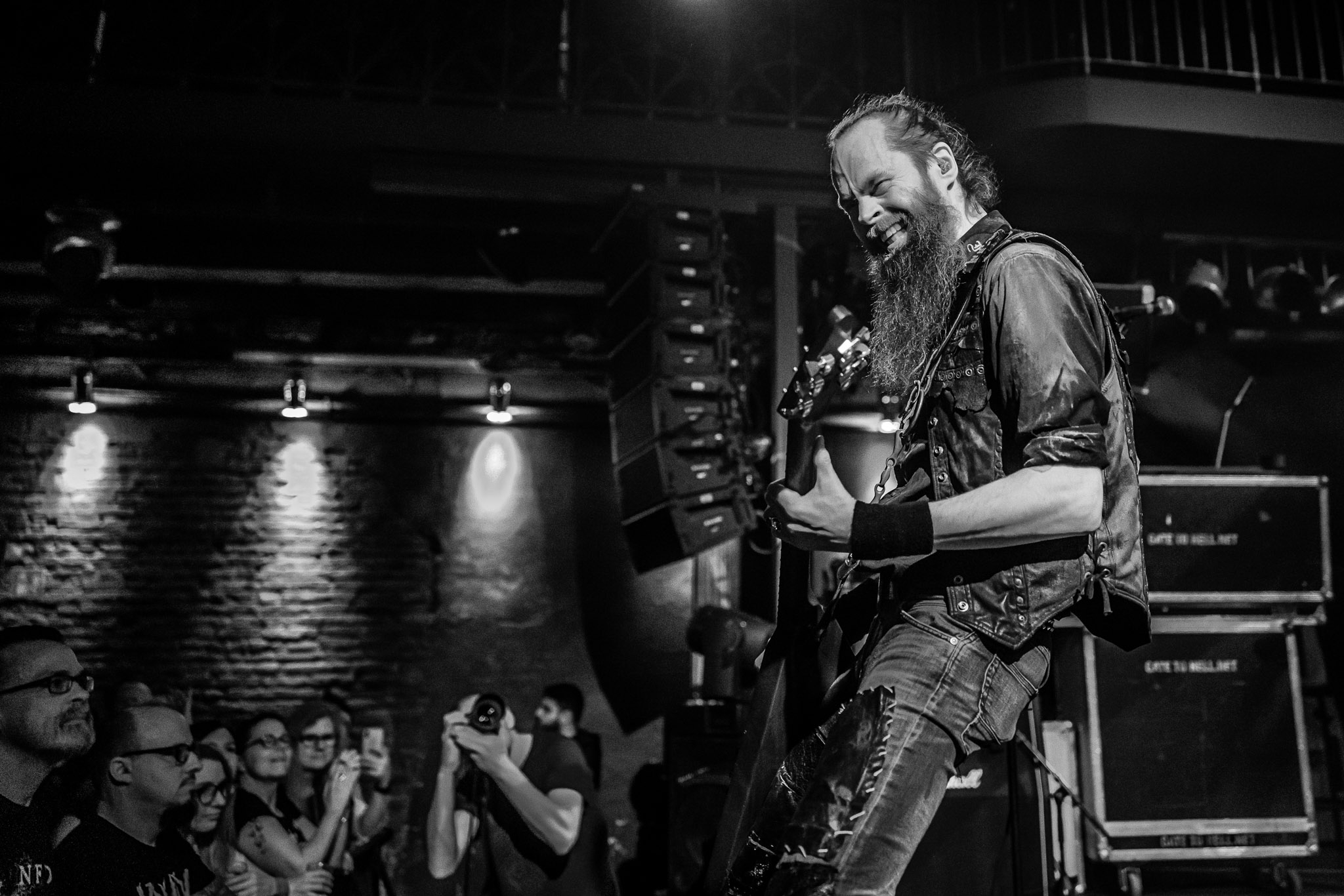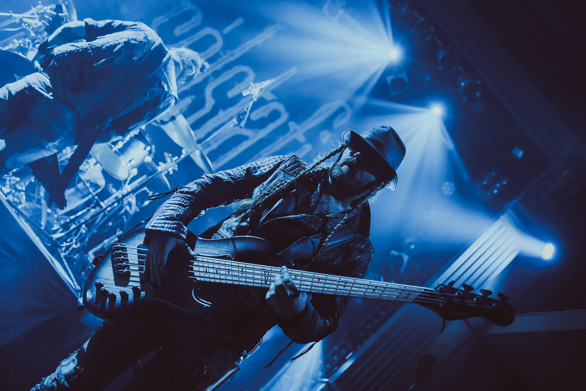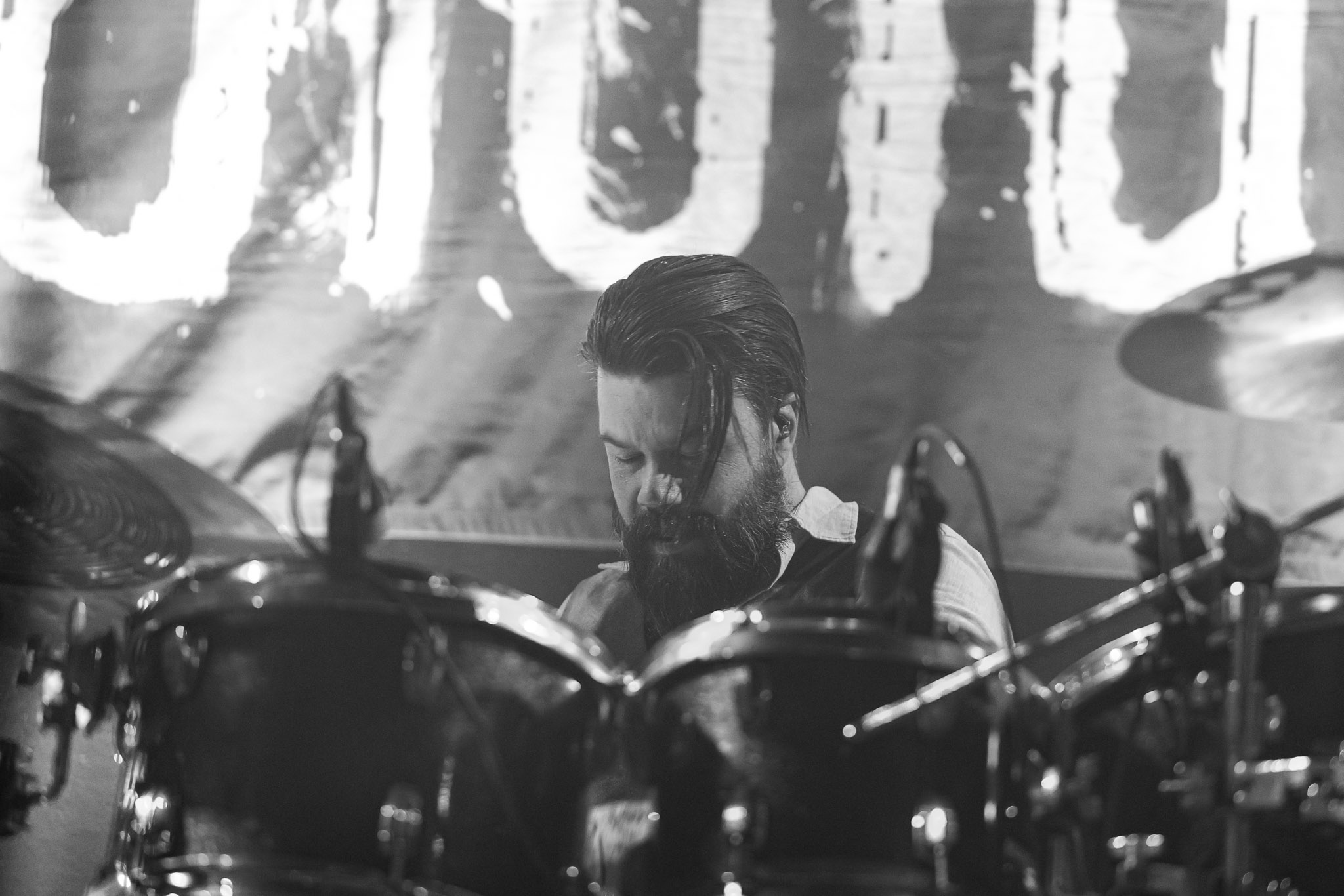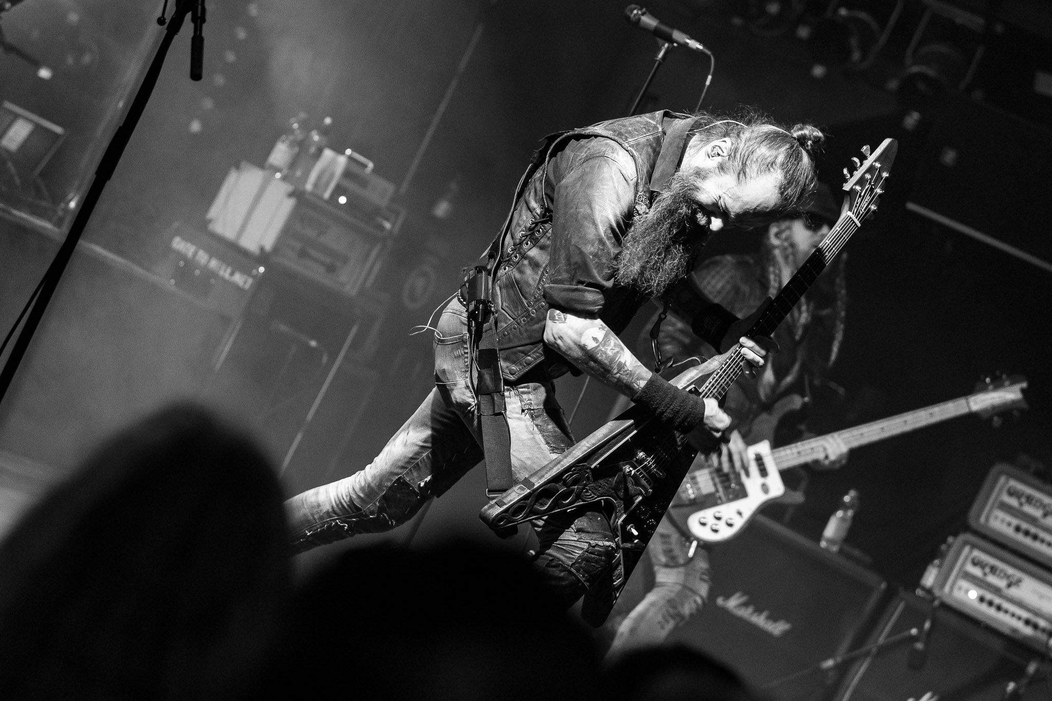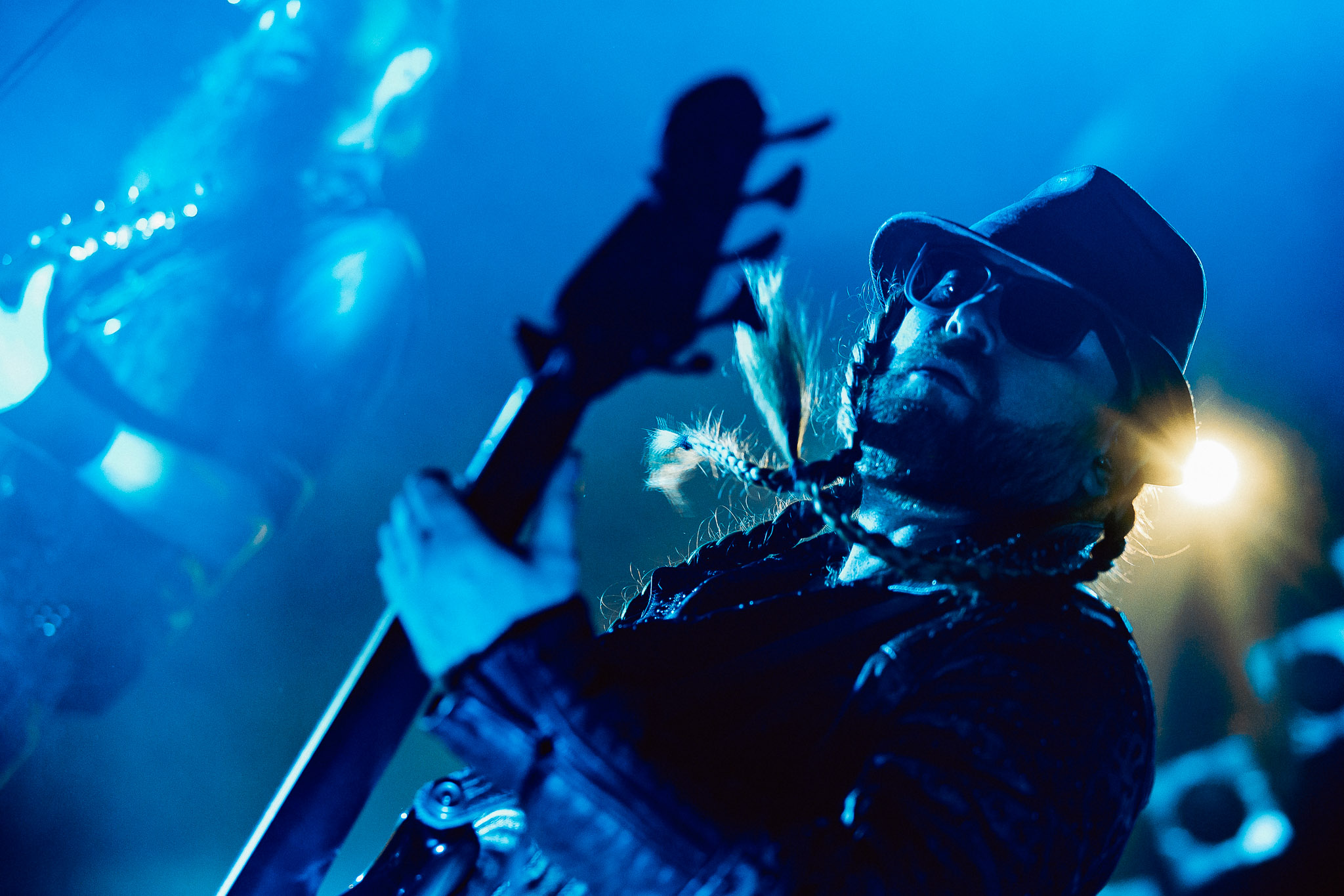 Nach kurzer Umbaupause kündigt das Backtrog die mächtigen Solstafir an. Zudem steht bereits Aðalbjörns Gitarre rechts an der Bühne, „Náttfari wird als Intro gespielt. Die Band braucht keine weitere große Einführung oder Vorstellung. Mit deren Betreten der Bühne beginnt das Publikum mit voller Begeisterung mitzugehen. Charisma und absolute Bühnenpräsenz werden hier lehrfilmmäßig dargeboten. Ich habe die Isländer schon ein paar Mal live erleben dürfen, doch dieser Auftritt sollte die bisherigen Live Darbietungen in den Schatten stellen. Mit „Nattmal“ und „Köld“ geht es hinein in den isländischen Abend. SOLSTAFIR zeigen eindrucksvoll, dass es keiner vieler Worte braucht, um das Publikum zu lenken. Sänger Aðalbjörn schafft es mit einfachen Gesten, das Publikum zur völligen Ruhe zu bringen, als einige Zuschauer in den ruhigen Parts das Schreien anfingen. Ein weiteres Highlight des Abends ist wohl der Geburtstag von Sæþór Maríus Sæþórsson. Mit gewohnt minimalistischer Gestik nimmt er die Glückwünsche des Publikums an.