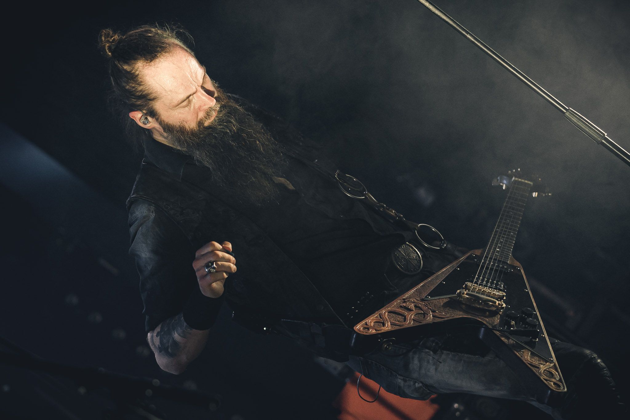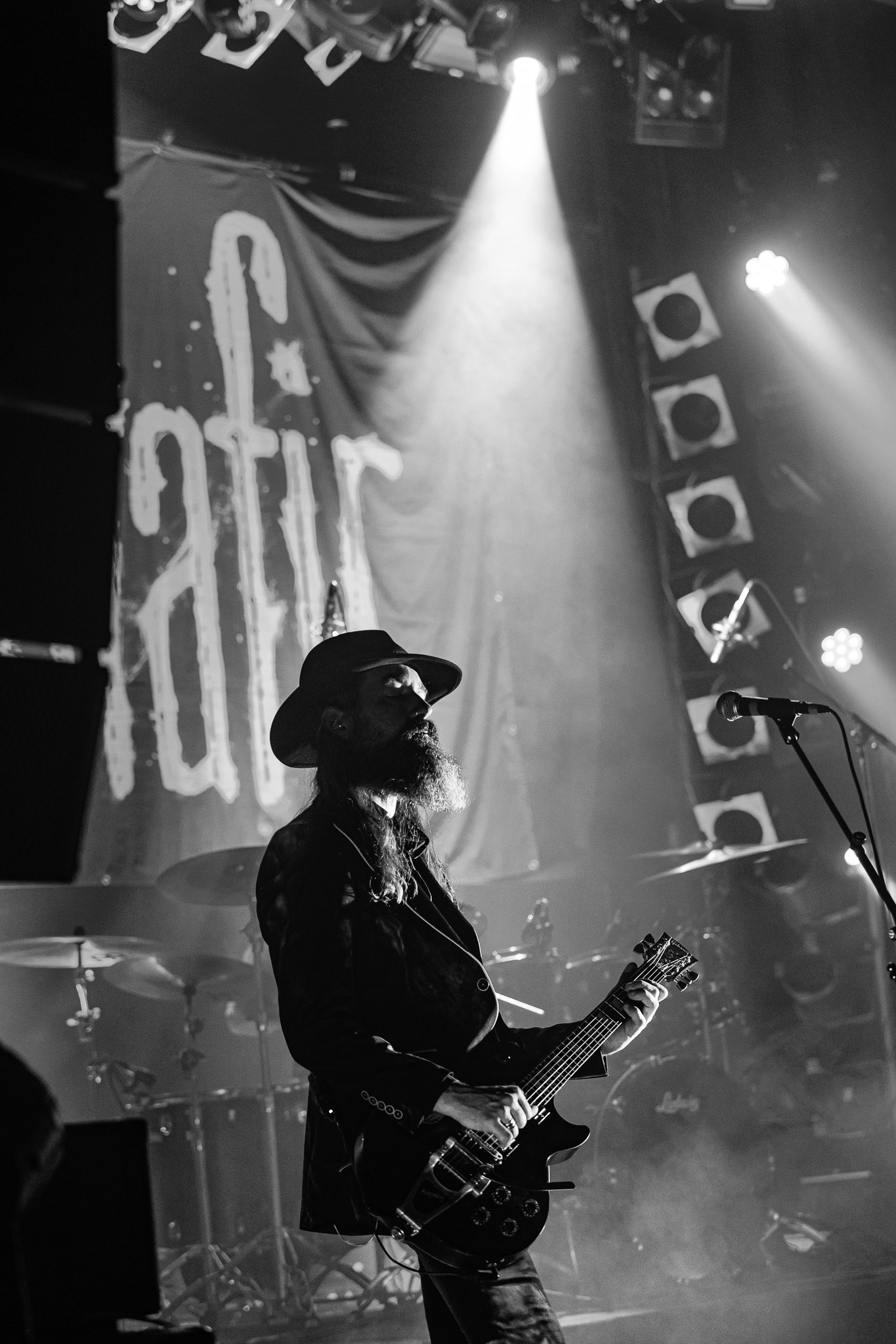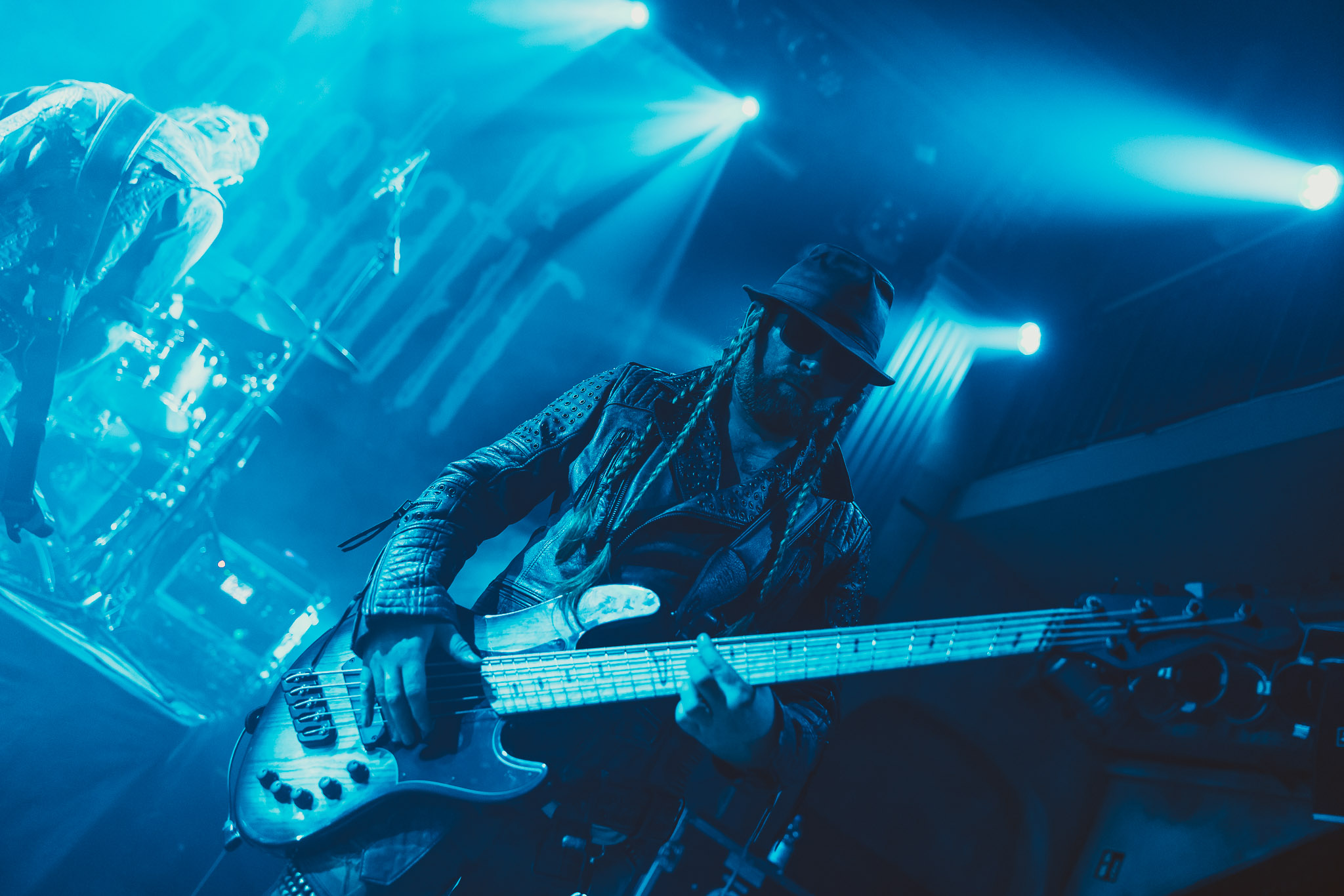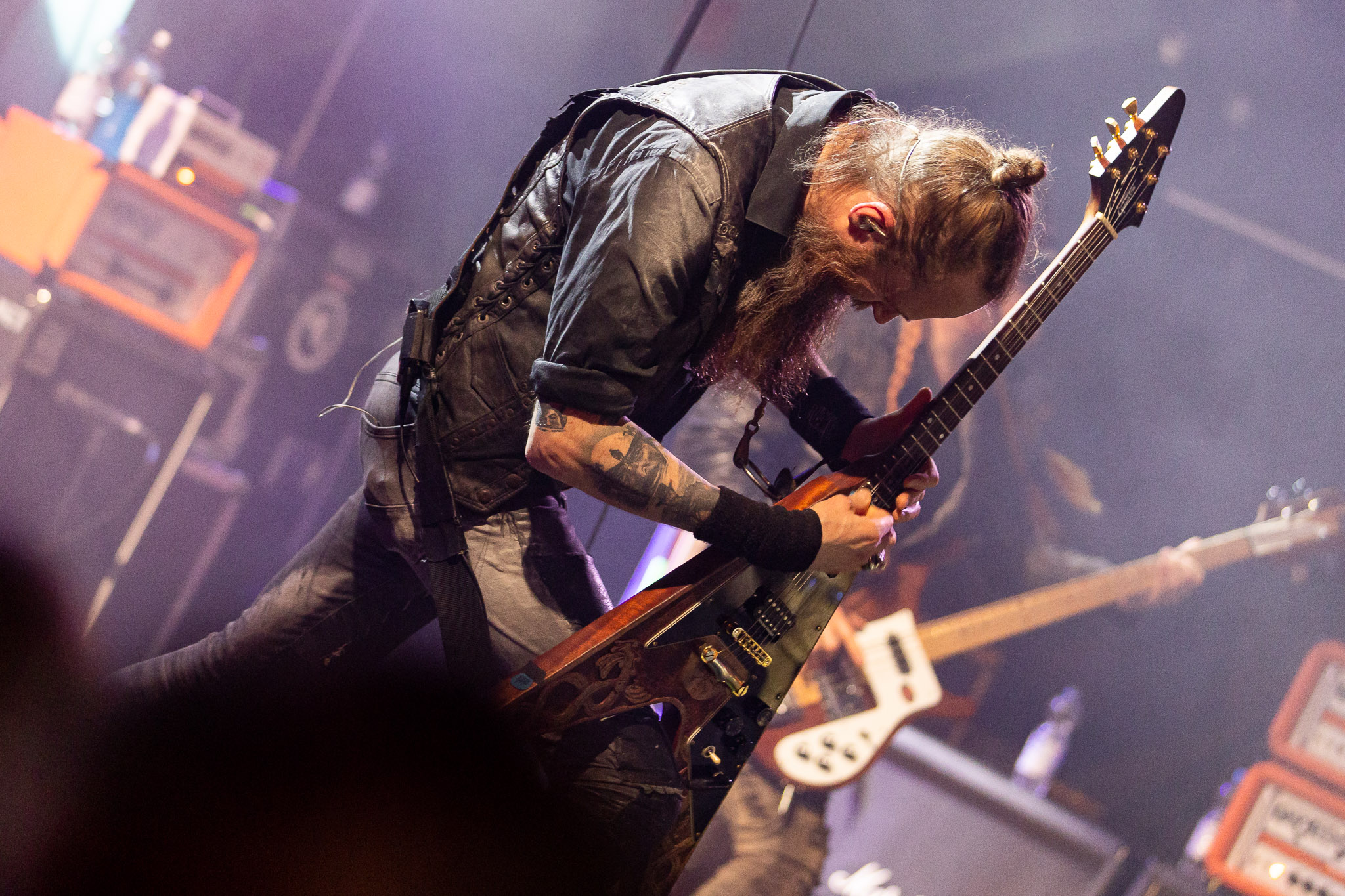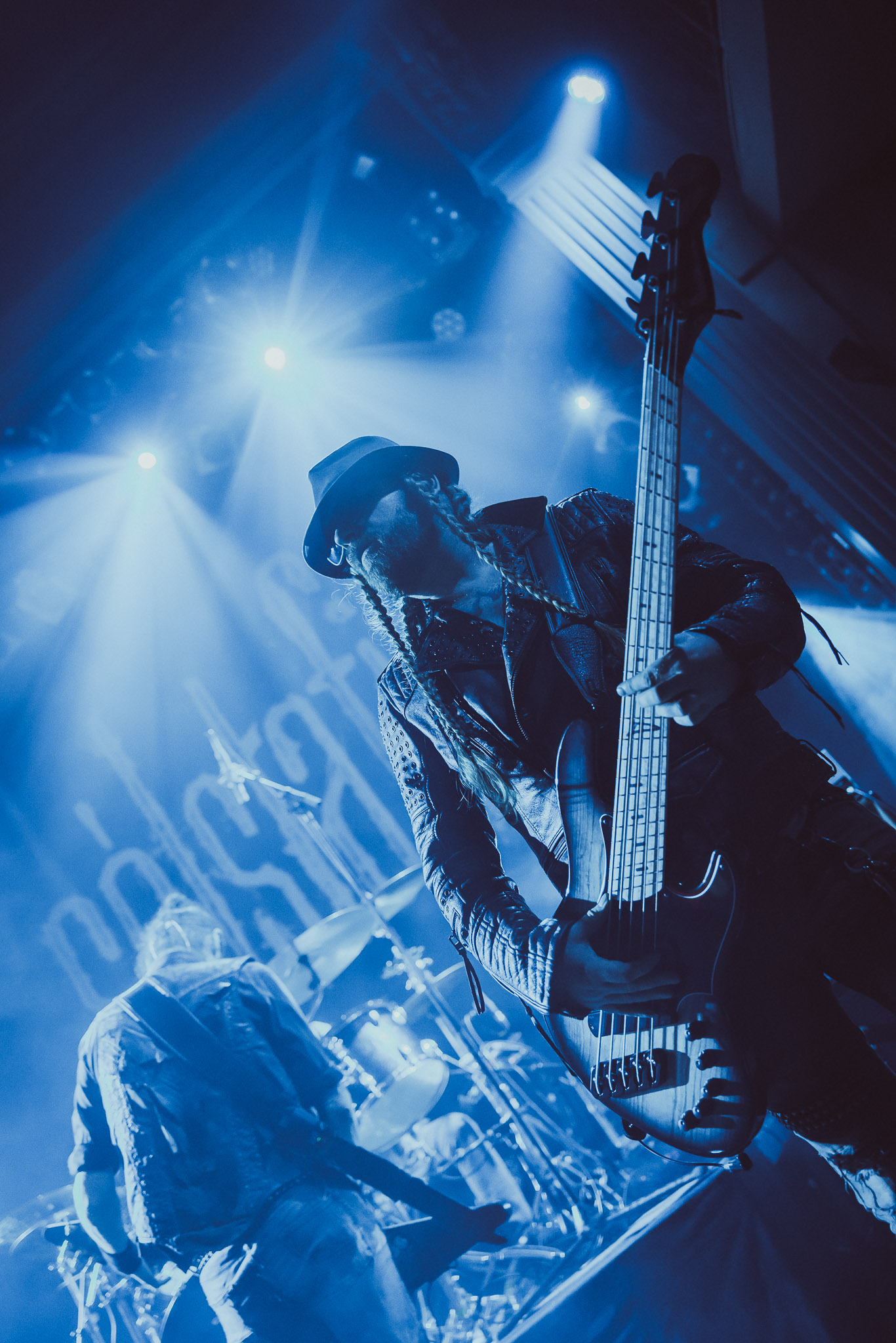 Nach kurzer Umbaupause kündigt das Backtrog die mächtigen Solstafir an. Zudem steht bereits Aðalbjörns Gitarre rechts an der Bühne, „Náttfari wird als Intro gespielt. Die Band braucht keine weitere große Einführung oder Vorstellung. Mit deren Betreten der Bühne beginnt das Publikum mit voller Begeisterung mitzugehen. Charisma und absolute Bühnenpräsenz werden hier lehrfilmmäßig dargeboten. Ich habe die Isländer schon ein paar Mal live erleben dürfen, doch dieser Auftritt sollte die bisherigen Live Darbietungen in den Schatten stellen. Mit „Nattmal“ und „Köld“ geht es hinein in den isländischen Abend. SOLSTAFIR zeigen eindrucksvoll, dass es keiner vieler Worte braucht, um das Publikum zu lenken. Sänger Aðalbjörn schafft es mit einfachen Gesten, das Publikum zur völligen Ruhe zu bringen, als einige Zuschauer in den ruhigen Parts das Schreien anfingen. Ein weiteres Highlight des Abends ist wohl der Geburtstag von Sæþór Maríus Sæþórsson. Mit gewohnt minimalistischer Gestik nimmt er die Glückwünsche des Publikums an.