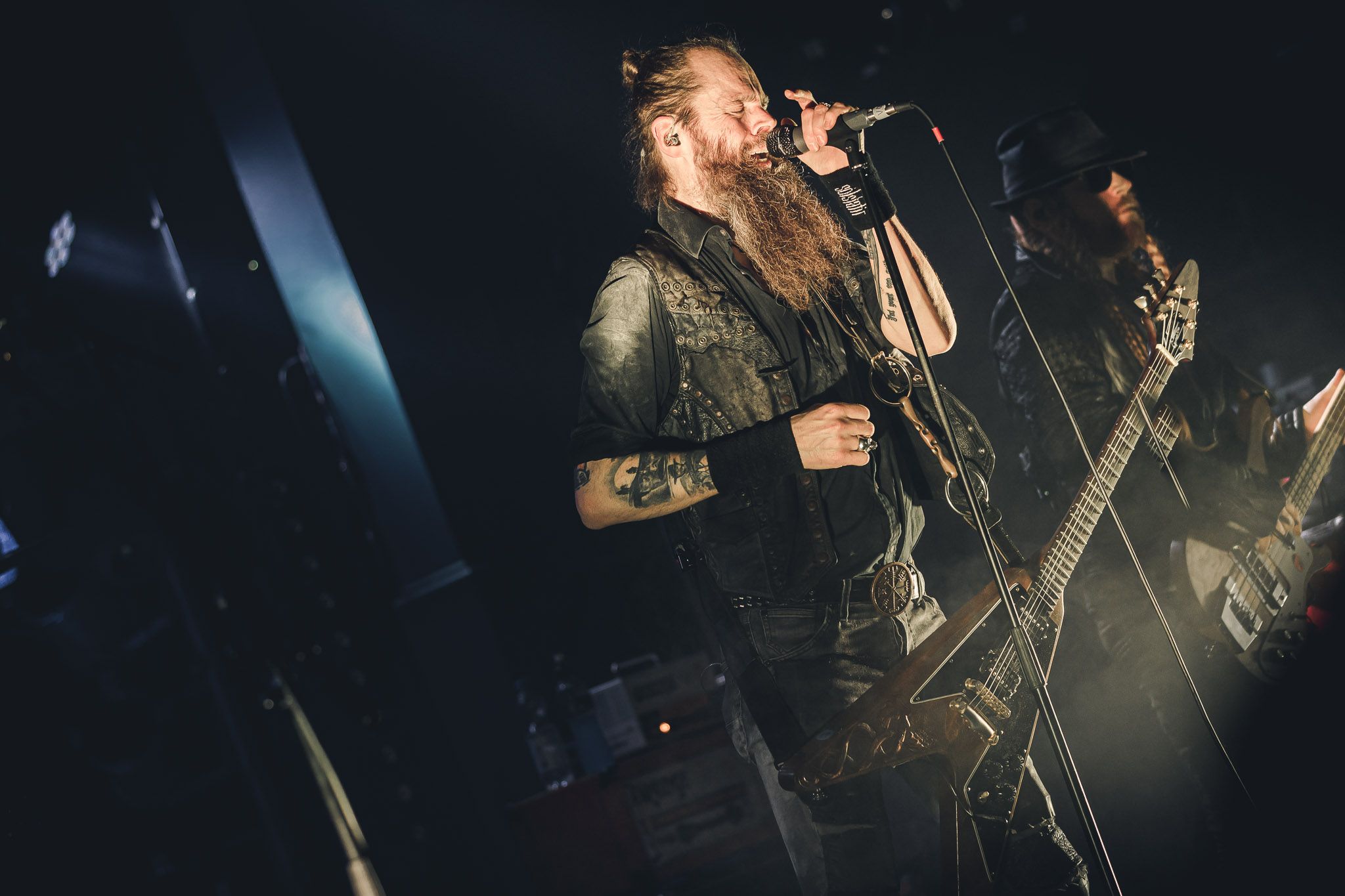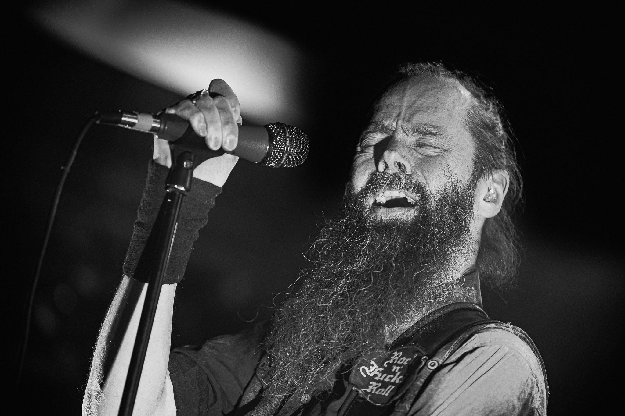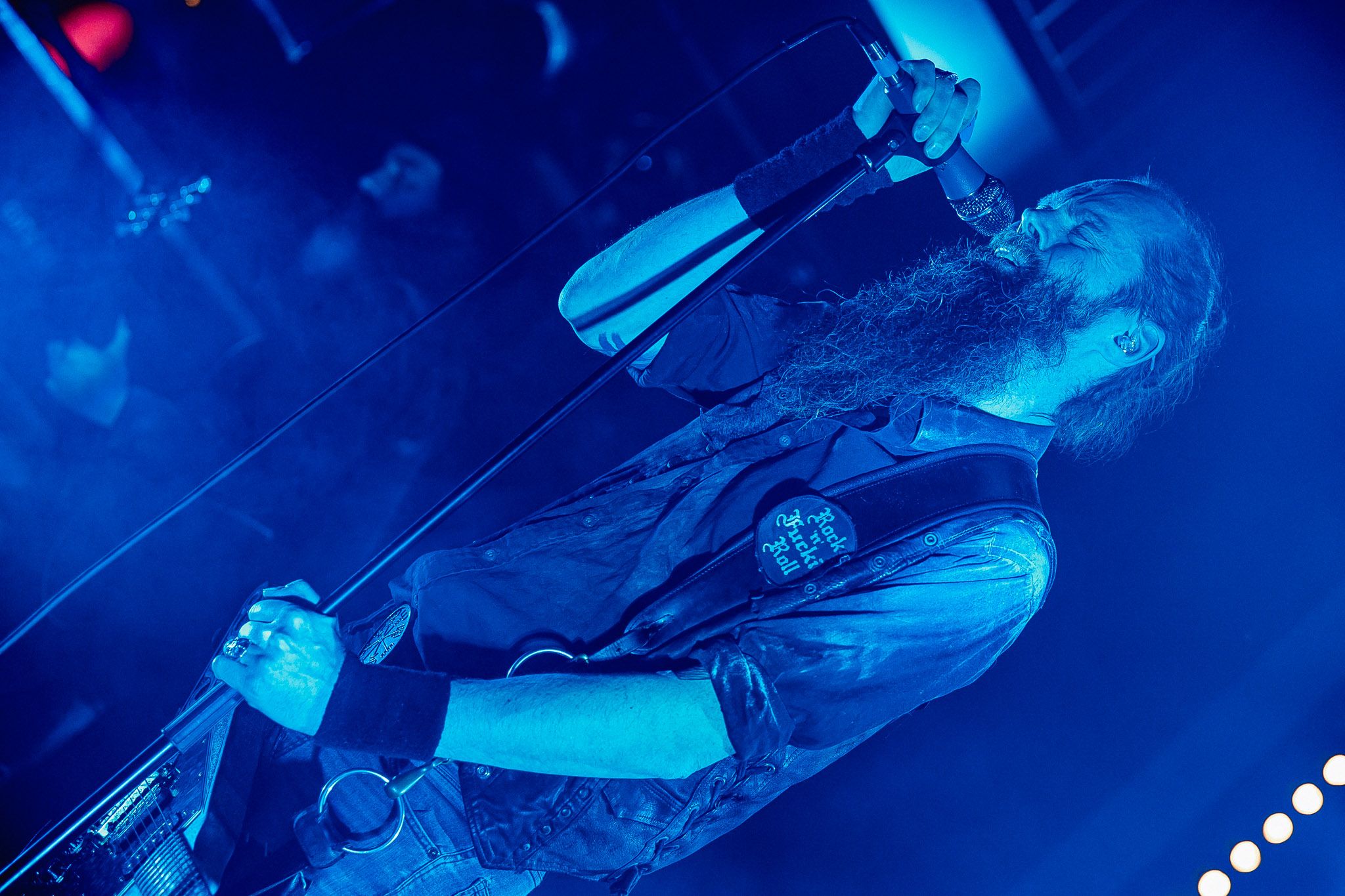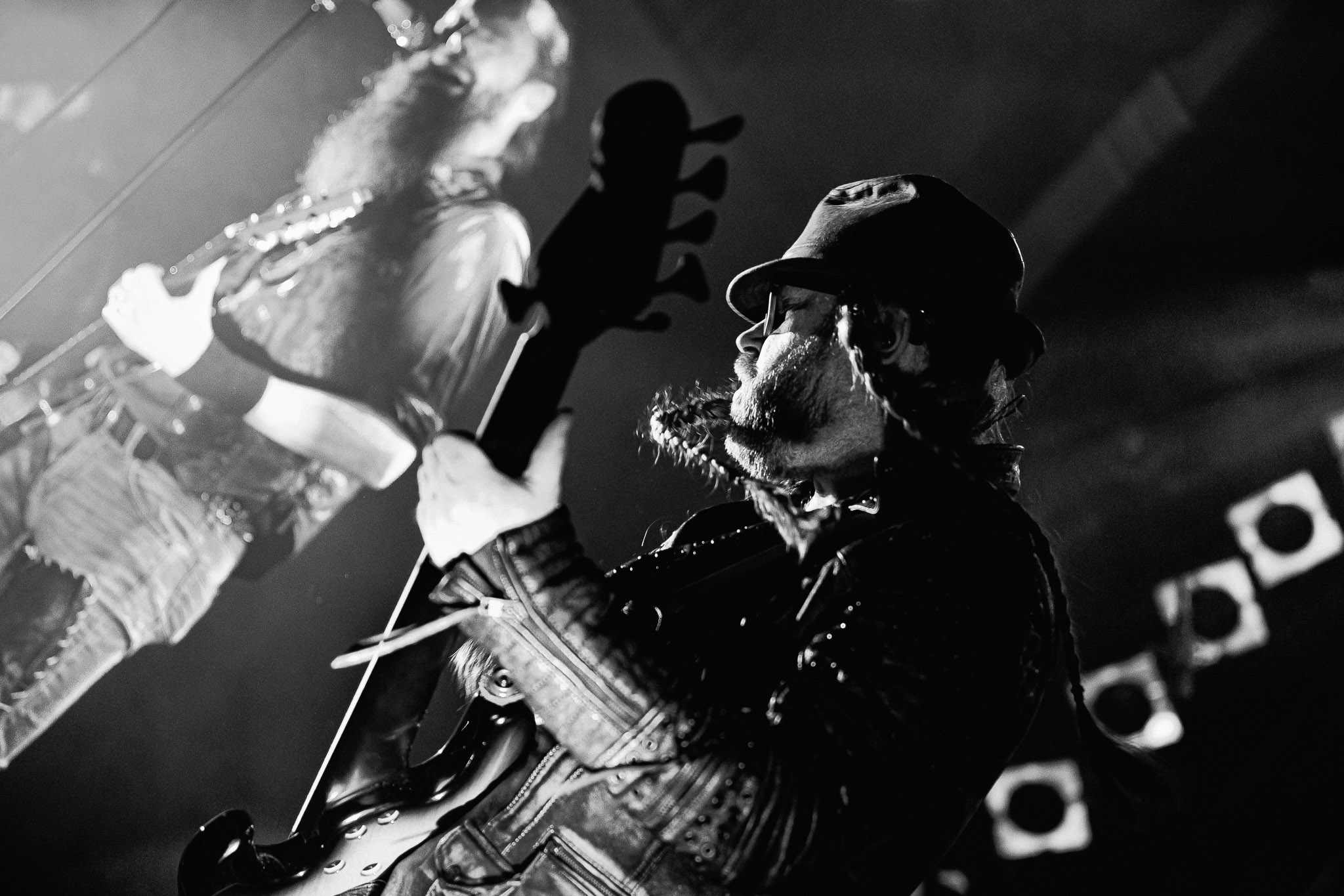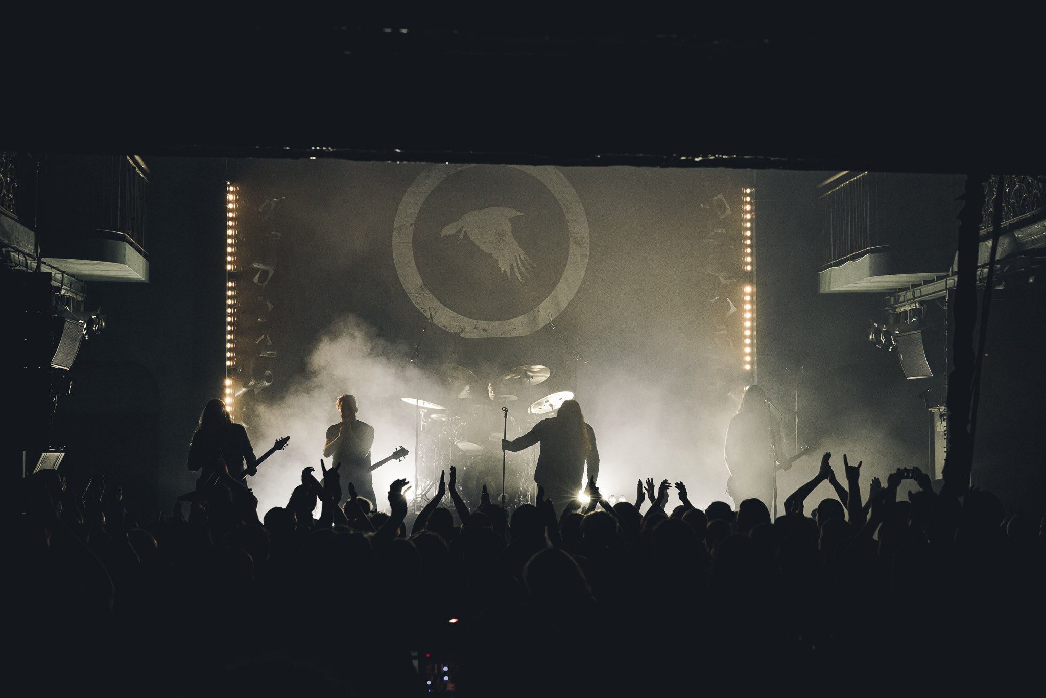 Nach kurzer Umbaupause kündigt das Backtrog die mächtigen Solstafir an. Zudem steht bereits Aðalbjörns Gitarre rechts an der Bühne, „Náttfari wird als Intro gespielt. Die Band braucht keine weitere große Einführung oder Vorstellung. Mit deren Betreten der Bühne beginnt das Publikum mit voller Begeisterung mitzugehen. Charisma und absolute Bühnenpräsenz werden hier lehrfilmmäßig dargeboten. Ich habe die Isländer schon ein paar Mal live erleben dürfen, doch dieser Auftritt sollte die bisherigen Live Darbietungen in den Schatten stellen. Mit „Nattmal“ und „Köld“ geht es hinein in den isländischen Abend. SOLSTAFIR zeigen eindrucksvoll, dass es keiner vieler Worte braucht, um das Publikum zu lenken. Sänger Aðalbjörn schafft es mit einfachen Gesten, das Publikum zur völligen Ruhe zu bringen, als einige Zuschauer in den ruhigen Parts das Schreien anfingen. Ein weiteres Highlight des Abends ist wohl der Geburtstag von Sæþór Maríus Sæþórsson. Mit gewohnt minimalistischer Gestik nimmt er die Glückwünsche des Publikums an.