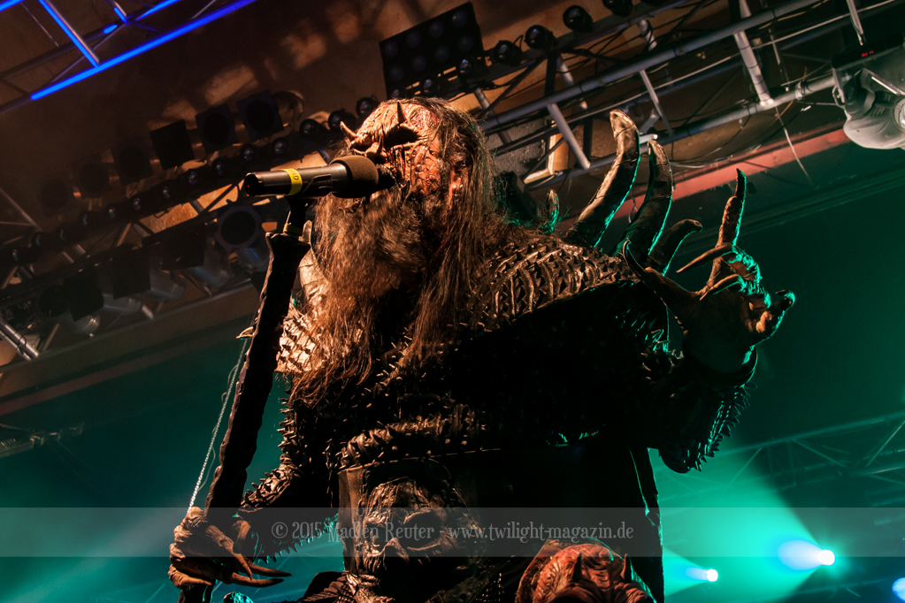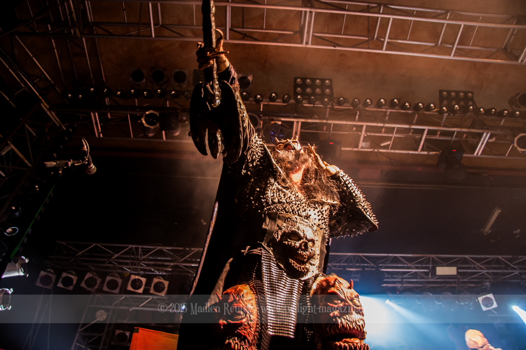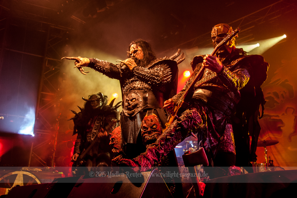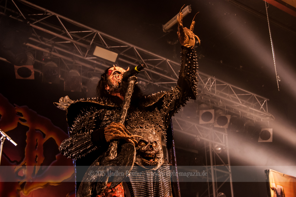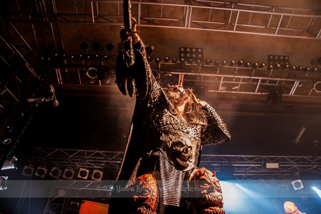 Dann wurde es auch schon Zeit für LORDI. Das Licht ging aus und „God Of Thunder“ hallte aus den Boxen. Kurz darauf betrat das freundliche Kabinenpersonal die Bühne, angeführt von einer Stewardess, die auf der Bühne eine kurze Sicherheitseinweisung gab. Mit „Nailed By The Hammer Of Frankenstein“ legte die Monstertruppe dann direkt mit einem genialen Stimmungsmacher los. Nicht nur die Band nutzte die Power dieses Songs aus, sondern auch das Publikum lässt sich in dessen Bann ziehen. Den Eurovision-Hit „Hard Rock Hallelujah“ brachten sie bereits als Drittes. Aber bei einer derart starken Setlist sei ihnen das erlaubt. Über den gesamten Abend war der Sound absolut spitzenmäßig, lediglich das Keyboard war etwas zu leise. Nebst wuchtigem Sound durften sich die Besucher auch über eine geniale Lichtshow freuen, die eine bombastische Stimmung erzeugte. Allerdings wurde die Setlist ein wenig gekürzt, und so flogen „Man Skin Boots“ und „Sir, Mr. Presideath, Sir!“ aus dem Programm. Schade um Letzteren, da dieser einfach auf die Bühne gehört hätte. Während „It Snows In Hell“ hat es dann kurzzeitig wirklich geschneit und bei „Hell Sent In The Clowns“ wurden die ersten Reihen von monströsen Clowns mit Kunstblut übergossen.