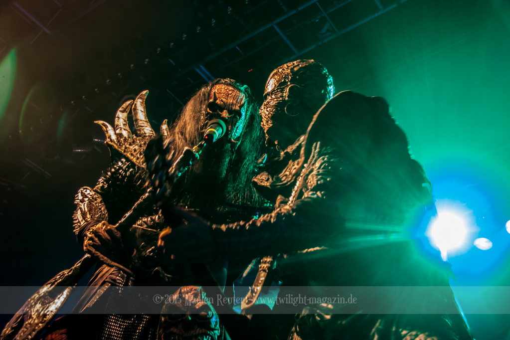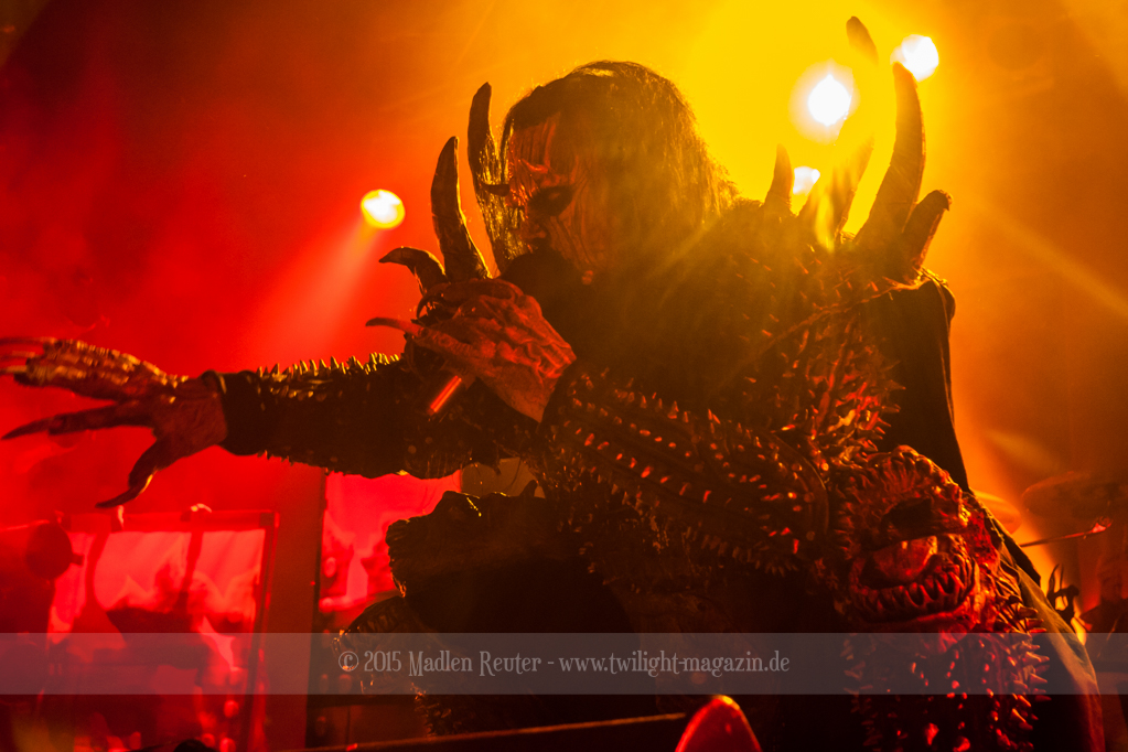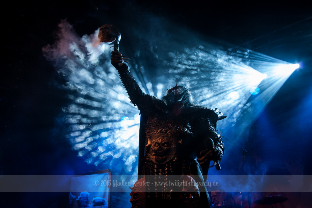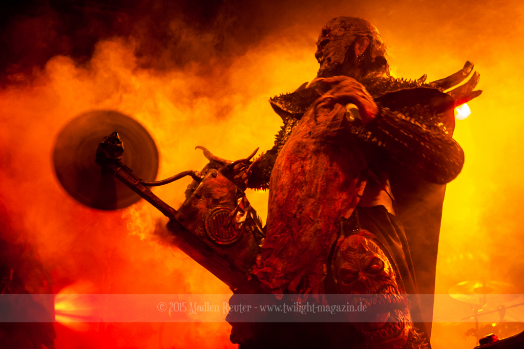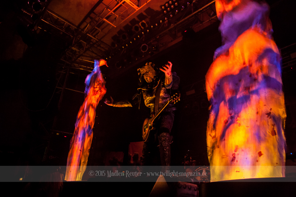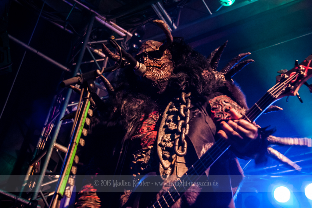 Dann wurde es auch schon Zeit für LORDI. Das Licht ging aus und „God Of Thunder“ hallte aus den Boxen. Kurz darauf betrat das freundliche Kabinenpersonal die Bühne, angeführt von einer Stewardess, die auf der Bühne eine kurze Sicherheitseinweisung gab. Mit „Nailed By The Hammer Of Frankenstein“ legte die Monstertruppe dann direkt mit einem genialen Stimmungsmacher los. Nicht nur die Band nutzte die Power dieses Songs aus, sondern auch das Publikum lässt sich in dessen Bann ziehen. Den Eurovision-Hit „Hard Rock Hallelujah“ brachten sie bereits als Drittes. Aber bei einer derart starken Setlist sei ihnen das erlaubt. Über den gesamten Abend war der Sound absolut spitzenmäßig, lediglich das Keyboard war etwas zu leise. Nebst wuchtigem Sound durften sich die Besucher auch über eine geniale Lichtshow freuen, die eine bombastische Stimmung erzeugte. Allerdings wurde die Setlist ein wenig gekürzt, und so flogen „Man Skin Boots“ und „Sir, Mr. Presideath, Sir!“ aus dem Programm. Schade um Letzteren, da dieser einfach auf die Bühne gehört hätte. Während „It Snows In Hell“ hat es dann kurzzeitig wirklich geschneit und bei „Hell Sent In The Clowns“ wurden die ersten Reihen von monströsen Clowns mit Kunstblut übergossen.