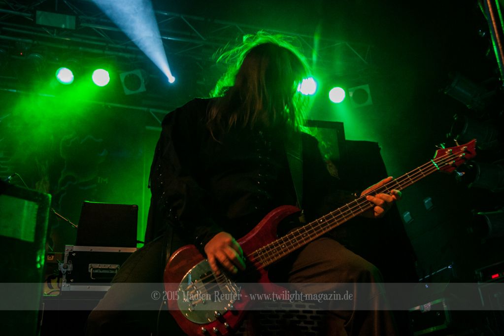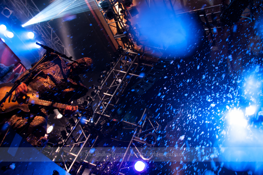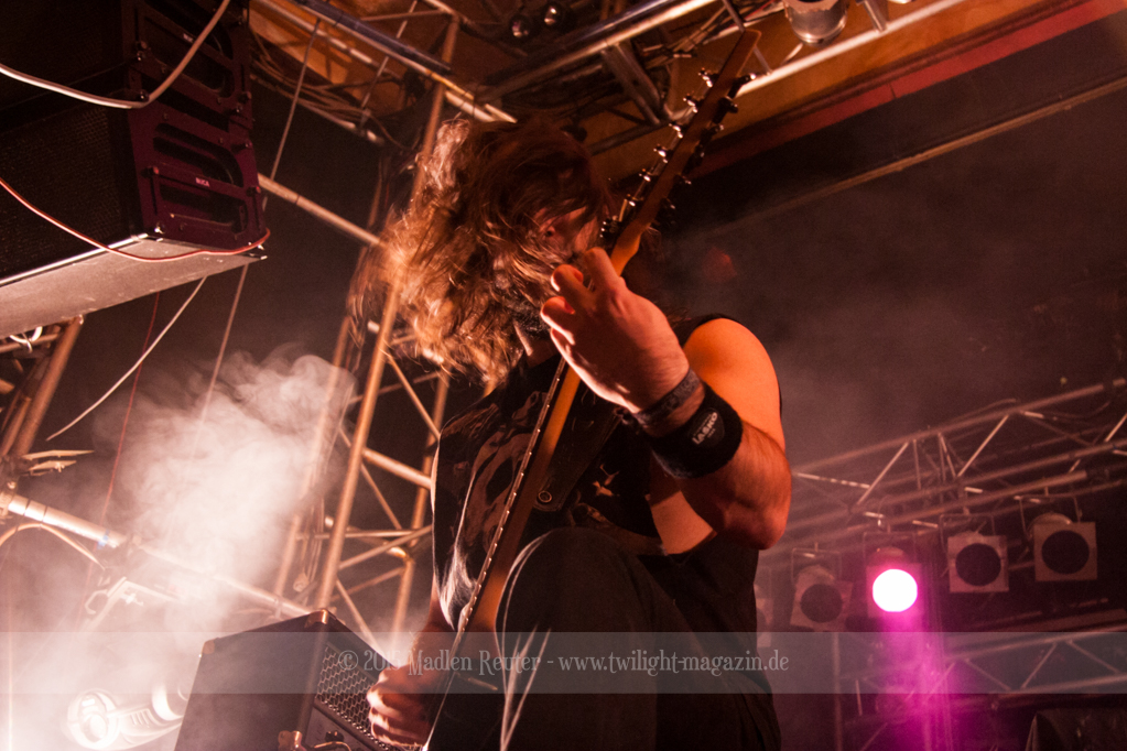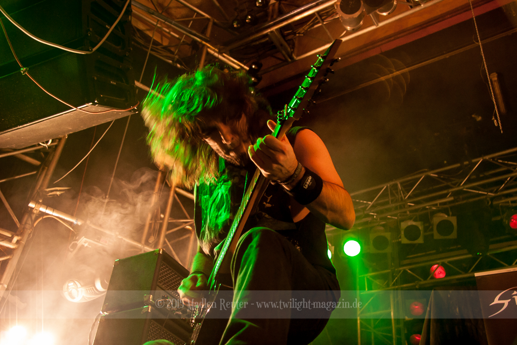 Den Anfang machten die Italiener von SINHERESY. Leider konnten sie mit keinem guten Sound aufwarten. Die Drums waren viel zu übersteuert und darunter hatte der Gesang gelitten. Hier war dies besonders fatal, da die Sängerin auch so schon eine relativ gebrechliche Stimme zu haben scheint. Und wären da nicht diese vielen, seltsamen Tempowechsel innerhalb der Songs, könnte die Band eigentlich ganz nett sein. Aber in jedem Fall schien die Band Spaß gehabt zu haben und sie bemühten sich sehr um Interaktion mit dem Publikum. Aber irgendwie wollte der Funke nicht so recht überspringen. Auch das Licht während ihrem Auftritt war nicht wirklich berauschend – alles ziemlich dunkel und nicht gerade fotografenfreundlich. Insgesamt machte die Band einen noch recht unerfahrenen Eindruck, was die, eher mittelmäßige, Performance erklären würde. Ganz warm wurde ich mit dieser Truppe einfach nicht, auch dem Rest des Publikums schien es ähnlich zu gehen.