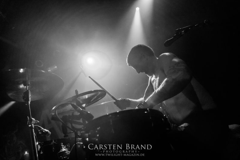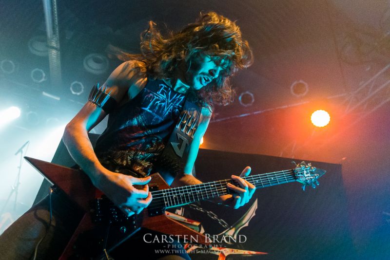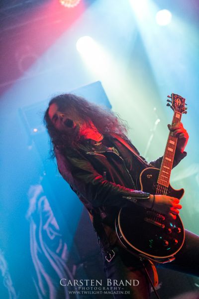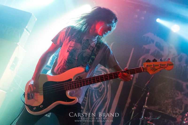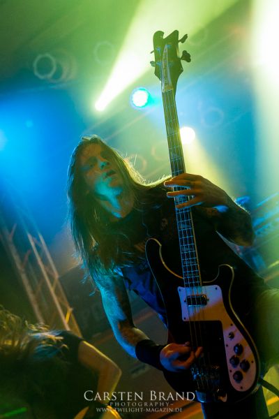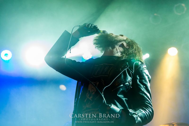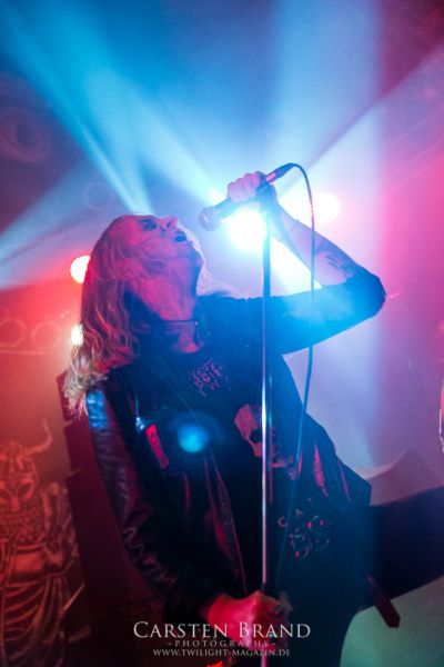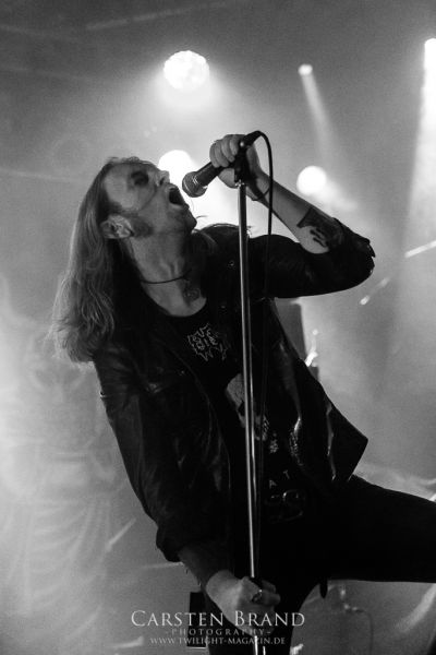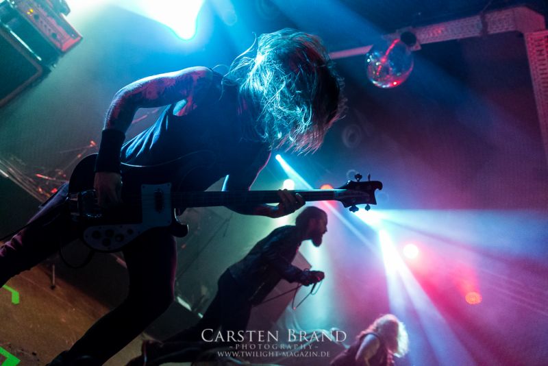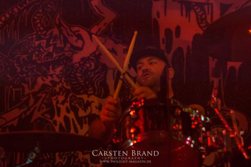 Der Konzertabend beginnt verkehrsbedingt mit einer Punktlandung zum Intro von DEATHRITE. Die Sachsen, die ich auf keinen Fall verpassen wollte, empfehlen sich auf dieser Tour nach der kürzlichen Veröffentlichung ihres jüngsten Werkes "Nightmares Reign" für höhere Weihen und verlassen sich dabei vollständig auf das Material von eben jenem Geniestreich. Eine durchaus risikofreudige Entscheidung, erschließt sich doch der ranzige, faulige Rock ´N´Roll-beeinflusste Death Metal nicht unbedingt beim ersten Hören. Mit dem einen oder anderen gradlinigem Song aus der Death-/Crust-Grind-Ära der eigenen Historie hätte man es sich sicher deutlich einfacher machen können, das Publikum der sich langsam füllenden Location auf die Seite zu ziehen. Aber Deathrite erfinden sich halt immer wieder neu und haben folglich auch kaum Probleme, mit dem neuen Material zu früher Stunde in Hannover zu bestehen. Mit neuem Bassmann, der sein Instrument ordentlich und schön knarzig pumpen lässt und einem zweiten Gitarristen führt die Band den Death `N´Roll auf den "Left Hand Path" zurück und kreiert eine abgrundtief-morbide Todesmetall-Atmosphäre, wobei die Musik selbst mittlerweile wesentlich vielschichtiger und facettenreicher ist als es die Wurzeln des Quintetts sind. Die zweite Gitarre ist zweifelsohne eine Bereicherung. Insbesondere bei den schrägen Leads und Soli harmonieren und ergänzen sich Andy und Tom sehr gut, auch wenn die Klampfen gemeinsam deutlich mehr hätten sägen müssen. Tony ist zwar keine klassische Rampensau aber trotzdem ein unheimlich charismatischer Frontmann, der von seinem kräftigen Organ und seinen dezenten Gesten lebt, während Beff an den Trommeln das Fundament für den halsbrecherischen Deathrite-Groove legt. Auch wenn mir die Jungs auf dem Underground Remains Open Air im Sommer konstellationsbedingt wesentlich besser gefallen haben, so zieht man sich in der Opener-Position beachtlich bis amtlich aus der Affäre und provoziert sogar einige Zugabenforderungen. Und neues Album hin oder her: "Where Evil Arises" wäre zum Schluss Pflicht gewesen.