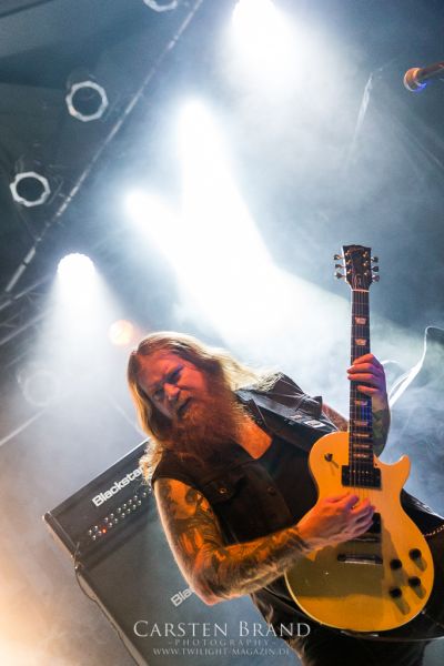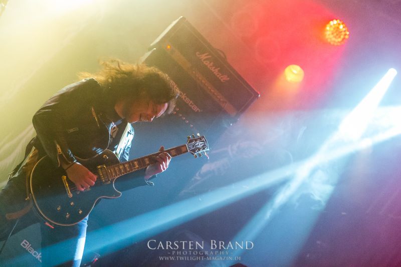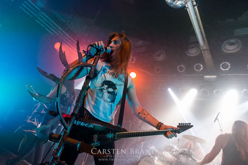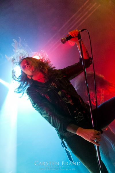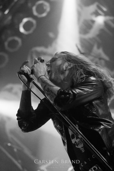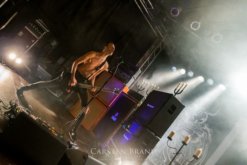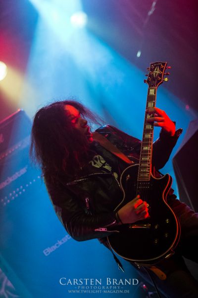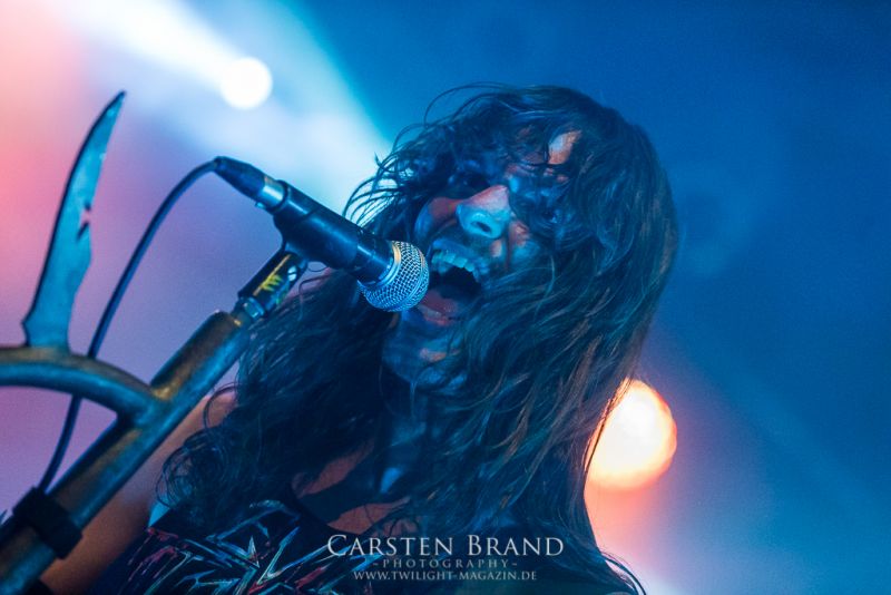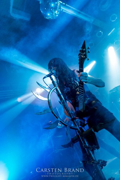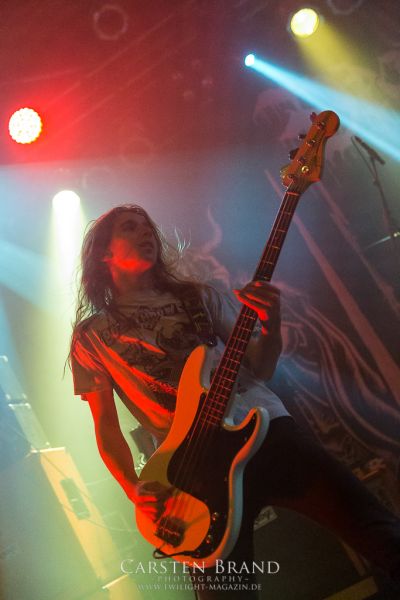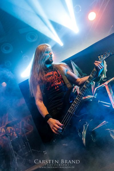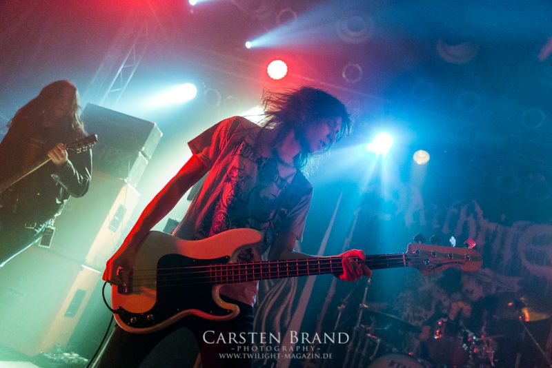 Der Konzertabend beginnt verkehrsbedingt mit einer Punktlandung zum Intro von DEATHRITE. Die Sachsen, die ich auf keinen Fall verpassen wollte, empfehlen sich auf dieser Tour nach der kürzlichen Veröffentlichung ihres jüngsten Werkes "Nightmares Reign" für höhere Weihen und verlassen sich dabei vollständig auf das Material von eben jenem Geniestreich. Eine durchaus risikofreudige Entscheidung, erschließt sich doch der ranzige, faulige Rock ´N´Roll-beeinflusste Death Metal nicht unbedingt beim ersten Hören. Mit dem einen oder anderen gradlinigem Song aus der Death-/Crust-Grind-Ära der eigenen Historie hätte man es sich sicher deutlich einfacher machen können, das Publikum der sich langsam füllenden Location auf die Seite zu ziehen. Aber Deathrite erfinden sich halt immer wieder neu und haben folglich auch kaum Probleme, mit dem neuen Material zu früher Stunde in Hannover zu bestehen. Mit neuem Bassmann, der sein Instrument ordentlich und schön knarzig pumpen lässt und einem zweiten Gitarristen führt die Band den Death `N´Roll auf den "Left Hand Path" zurück und kreiert eine abgrundtief-morbide Todesmetall-Atmosphäre, wobei die Musik selbst mittlerweile wesentlich vielschichtiger und facettenreicher ist als es die Wurzeln des Quintetts sind. Die zweite Gitarre ist zweifelsohne eine Bereicherung. Insbesondere bei den schrägen Leads und Soli harmonieren und ergänzen sich Andy und Tom sehr gut, auch wenn die Klampfen gemeinsam deutlich mehr hätten sägen müssen. Tony ist zwar keine klassische Rampensau aber trotzdem ein unheimlich charismatischer Frontmann, der von seinem kräftigen Organ und seinen dezenten Gesten lebt, während Beff an den Trommeln das Fundament für den halsbrecherischen Deathrite-Groove legt. Auch wenn mir die Jungs auf dem Underground Remains Open Air im Sommer konstellationsbedingt wesentlich besser gefallen haben, so zieht man sich in der Opener-Position beachtlich bis amtlich aus der Affäre und provoziert sogar einige Zugabenforderungen. Und neues Album hin oder her: "Where Evil Arises" wäre zum Schluss Pflicht gewesen.