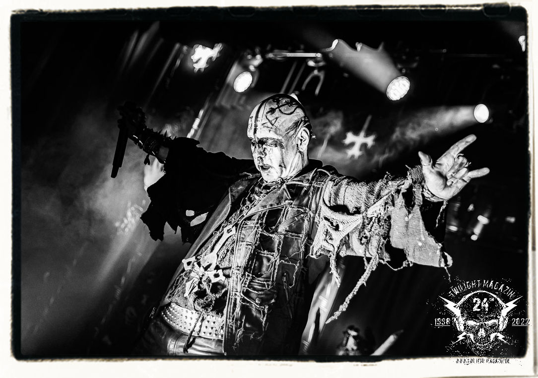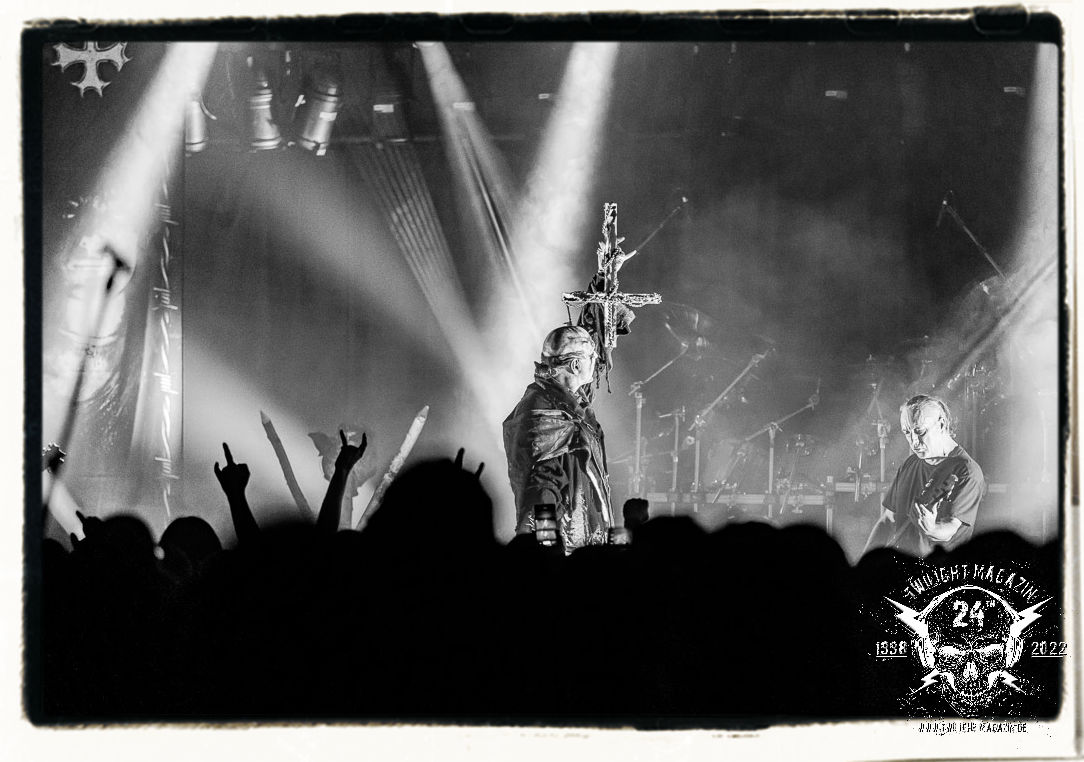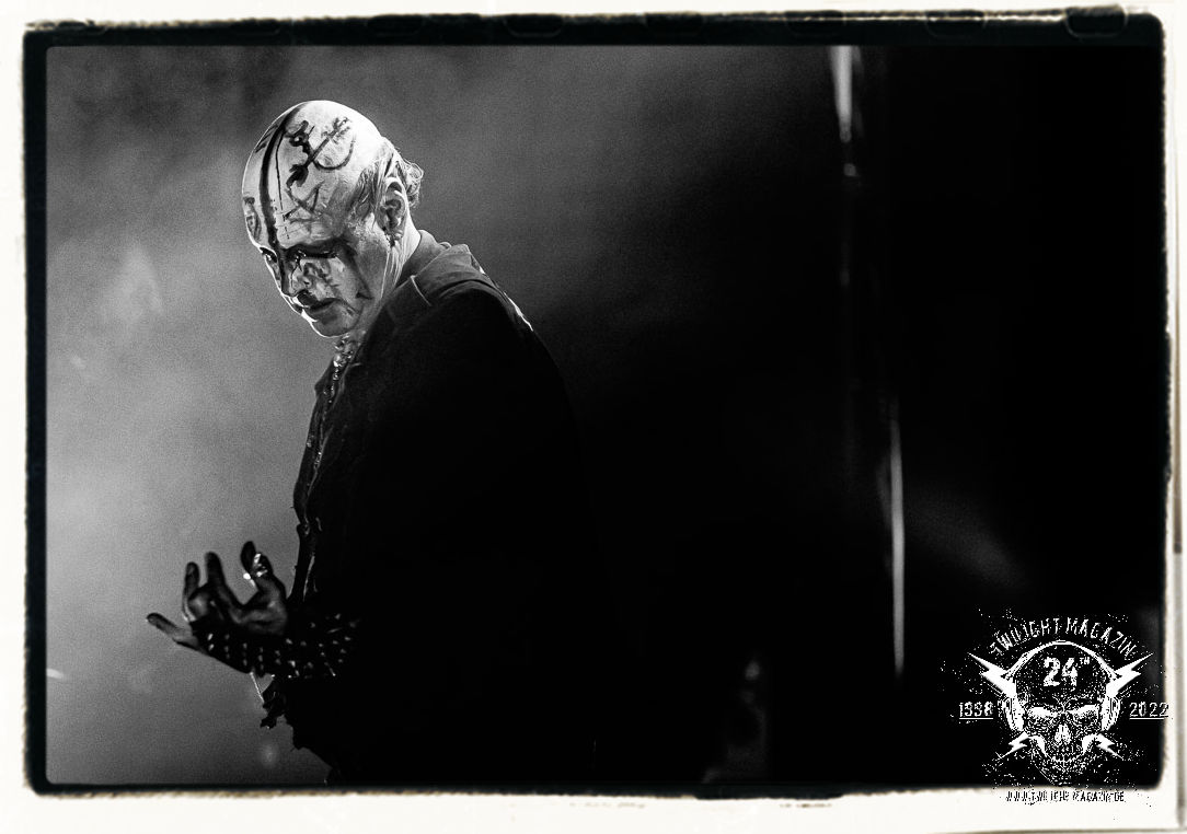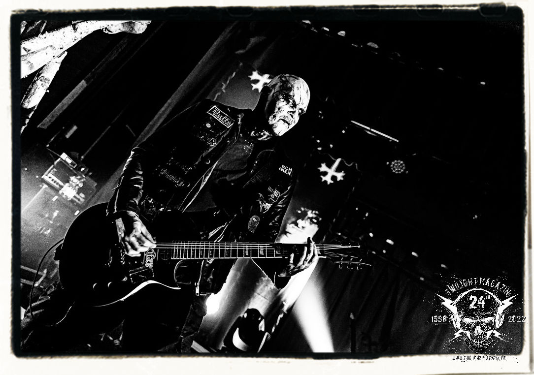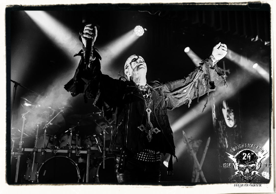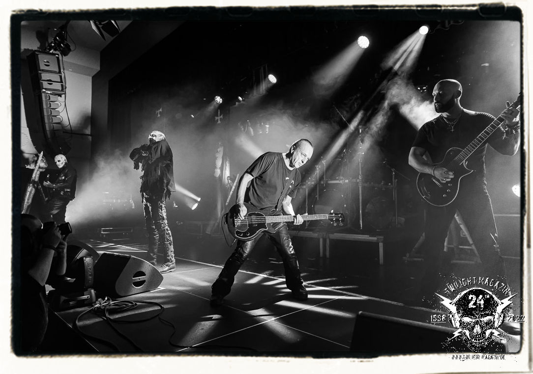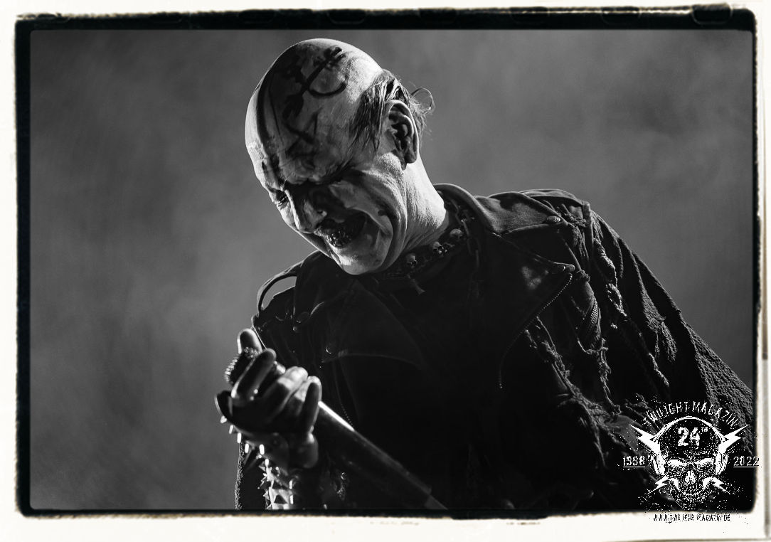 Die einstimmenden Klangkollagen gipfeln schließlich im Percussion-Intro "Silvester Anfang", welches nicht nur die "Deathcrush"-EP von 1987, sondern auch den Beginn des Konzertes einleitet. Endlich betreten Hellhammer, Necrobutcher, die beiden Gitarristen Teloch und Ghul sowie schließlich Sänger Attila Csihar die Bühne. Die Frage nach der Setlist stellt sich zunächst nicht. "Deathcrush", "Necrolust", "Funeral Fog", "Freezing Moon", bei dem die ursprüngliche "When it´s cold, when it´s dark..."-Ansage von Dead eingespielt wird, "Carnage", "Buried By Time And Dust", "Pagan Fears", "Chainsaw Gutsfuck" und schließlich das finale "Pure Fucking Armageddon" entsprechen den Songs, die MAYHEM im November 1990 mit Øystein Aarseth und Per Yngwe Ohlin alias Euronymous und Dead im Eiskeller zu Leipzig spielten. Bassist Necrobutcher lässt es sich nicht nehmen, seine ebenfalls auf dem Live-Album konservierte und seinerzeit der Irritation über die verhaltenen Publikums-Reaktionen geschuldete "Are you dead?"-Ansage noch einmal zu zelebrieren, um danach "Carnage" anzukündigen. Darüber hinaus verzichten MAYHEM glücklicherweise auf überflüssigen Firlefanz, sondern lassen die Musik sprechen. Und so zeichnen sie ein historisches Konzert und den Weg einer Band nach, die in den späten Achtzigern aus dem Death Metal - Underground kam und in der Entwicklung der Protagonisten und Musik schließlich im Black Metal Maßstäbe setzte. "Live in Leipzig" ist aus meiner Sicht auch gerade deshalb so bedeutend, weil es MAYHEM ungefiltert an der Schwelle zwischen den noch deutlich vom extremen Metal der Achtziger geprägten Frühphase in der Entwicklung zu dem Ausdruck zeigt, der schließlich mit dem 1994 veröffentlichten Meilenstein "De Mysteriis Dom Sathanas" nach dem Tod von Euronymous 1993 gipfelte und eine Ära der Band beendete. Natürlich ist das Format 2022 ein anderes und die Band um die verbliebene Rythmus-Sektion Hellhammber/Necrobutcher gewisserweise eine andere. Doch MAYHEM zelebrieren ihr Erbe tatsächlich würdevoll. Die Show ist nicht so chaotisch und abgefuckt, wie auf dem Party.San, was jedoch einer Doku zum Gig geschuldet sein könnte, die zum Revival parallel gedreht wird, und ich würde auch nicht ausschließen wollen dass auch dieser Abend in Leipzig seinen Weg auf einen Tonträger finden wird. Hellhammer ist wie meistens in der Dunkelheit bzw. im dezenten Licht hinter seinem Schlagzeug kaum zu sehen, dafür ist seine Präsenz in beeindruckender Weise zu hören. Attila, seit "De Mysteriis Dom Sathanas" über "Ordo ad Chao" (2007) bis heute wie sein Vorgänger Dead und Nachfolger Maniac untrennbar mit MAYHEM verbunden, beschränkt sich auf sein Organ und seine Fähigkeiten als Hohepriester blasphemischer Gesten und Symbolik. Die beiden Gitarristen Teloch und Ghul sind mittlerweile schon rund zehn Jahre dabei und verkörpern die Fähigkeit der Band, sich immer wieder neu zu erfinden. Sie sorgen für einen dichten Gitarrenteppich. Dabei treten sie nach außen ziemlich gegensätzlich in Erscheinung, der Norweger Teloch mit Corpsepaint wirkt extrem grimmig, die Les Paul-Adaption lässig tief hängend, der Brite Ghul ungeschminkt, durchtrainiert, die Gitarre dabei unter der Brust. Posieren können sie jedoch beide. Und Necrobutcher ist Necrobutcher, zuständig für Bass, Wein und "Kommunikation" mit dem Publikum.