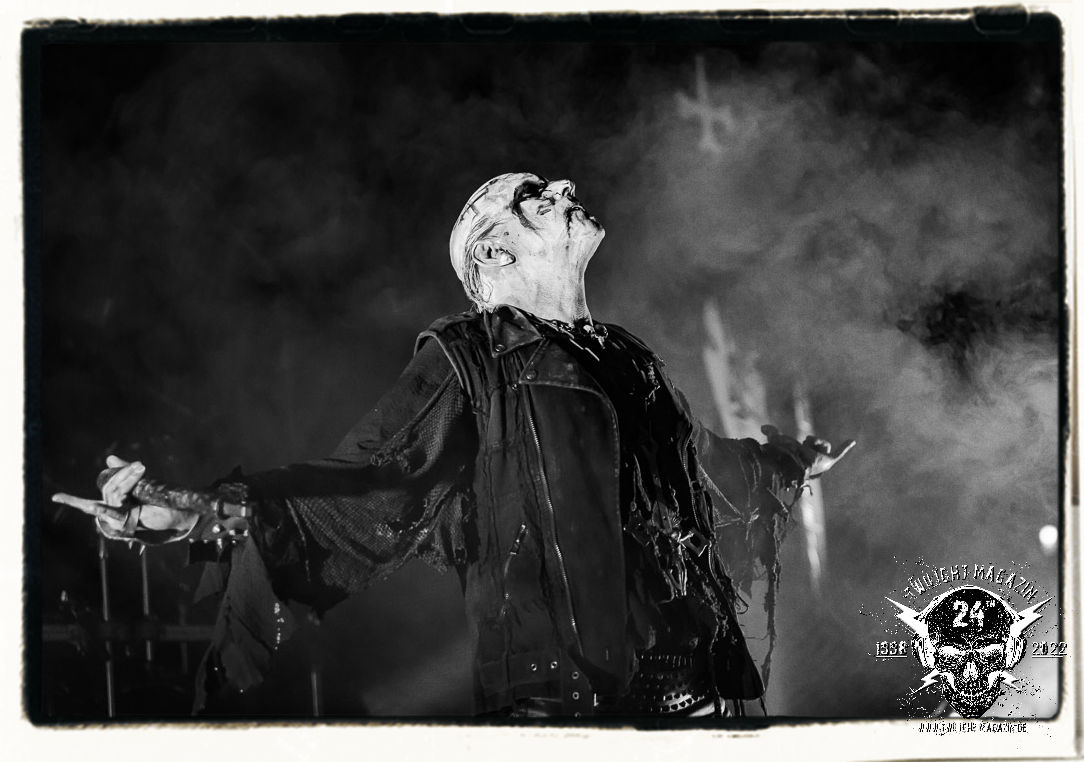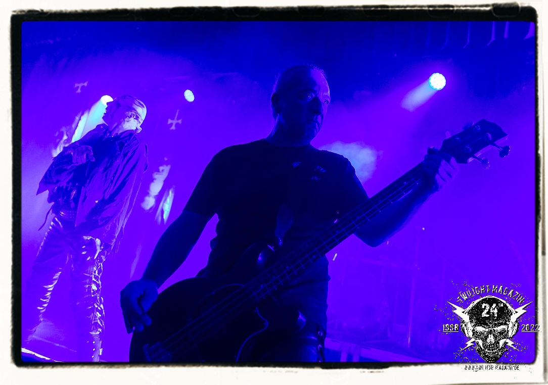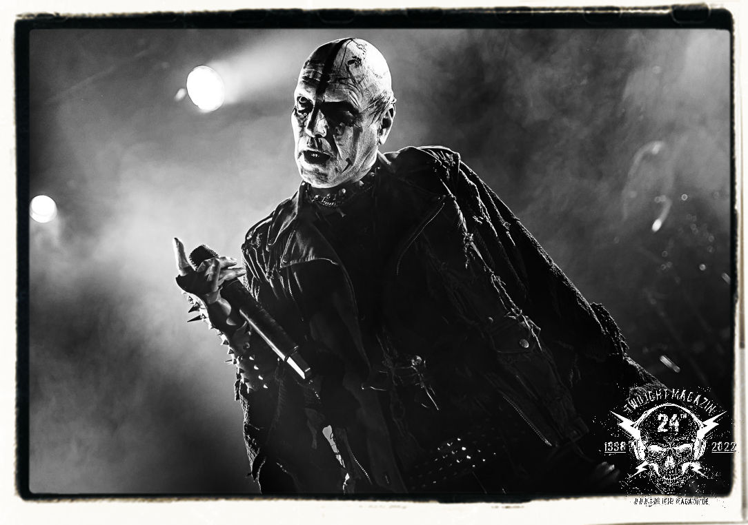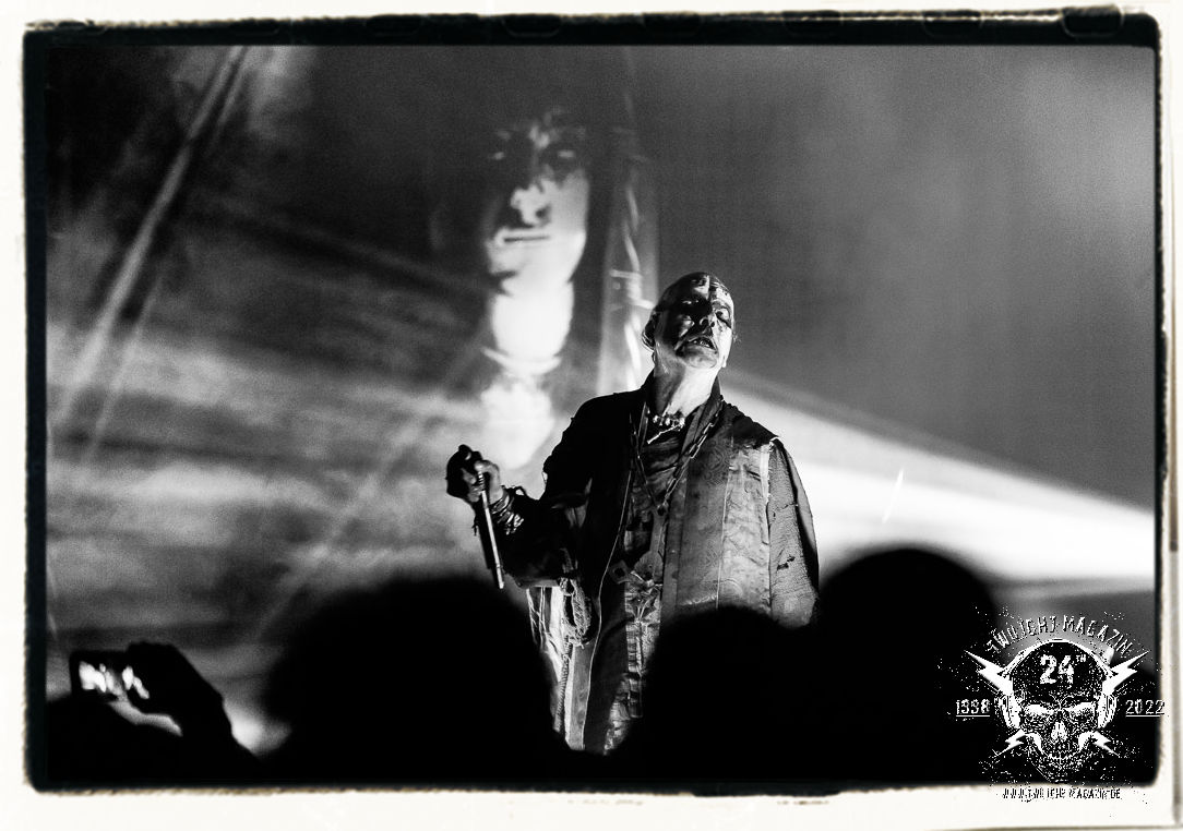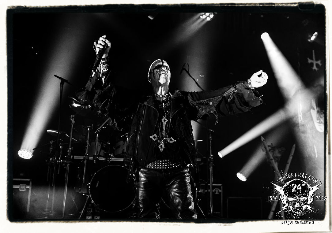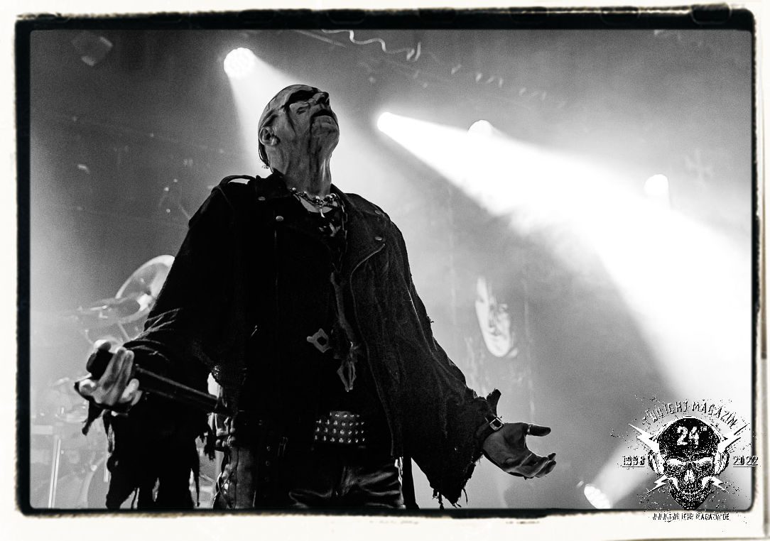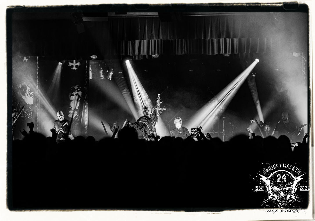 Die einstimmenden Klangkollagen gipfeln schließlich im Percussion-Intro "Silvester Anfang", welches nicht nur die "Deathcrush"-EP von 1987, sondern auch den Beginn des Konzertes einleitet. Endlich betreten Hellhammer, Necrobutcher, die beiden Gitarristen Teloch und Ghul sowie schließlich Sänger Attila Csihar die Bühne. Die Frage nach der Setlist stellt sich zunächst nicht. "Deathcrush", "Necrolust", "Funeral Fog", "Freezing Moon", bei dem die ursprüngliche "When it´s cold, when it´s dark..."-Ansage von Dead eingespielt wird, "Carnage", "Buried By Time And Dust", "Pagan Fears", "Chainsaw Gutsfuck" und schließlich das finale "Pure Fucking Armageddon" entsprechen den Songs, die MAYHEM im November 1990 mit Øystein Aarseth und Per Yngwe Ohlin alias Euronymous und Dead im Eiskeller zu Leipzig spielten. Bassist Necrobutcher lässt es sich nicht nehmen, seine ebenfalls auf dem Live-Album konservierte und seinerzeit der Irritation über die verhaltenen Publikums-Reaktionen geschuldete "Are you dead?"-Ansage noch einmal zu zelebrieren, um danach "Carnage" anzukündigen. Darüber hinaus verzichten MAYHEM glücklicherweise auf überflüssigen Firlefanz, sondern lassen die Musik sprechen. Und so zeichnen sie ein historisches Konzert und den Weg einer Band nach, die in den späten Achtzigern aus dem Death Metal - Underground kam und in der Entwicklung der Protagonisten und Musik schließlich im Black Metal Maßstäbe setzte. "Live in Leipzig" ist aus meiner Sicht auch gerade deshalb so bedeutend, weil es MAYHEM ungefiltert an der Schwelle zwischen den noch deutlich vom extremen Metal der Achtziger geprägten Frühphase in der Entwicklung zu dem Ausdruck zeigt, der schließlich mit dem 1994 veröffentlichten Meilenstein "De Mysteriis Dom Sathanas" nach dem Tod von Euronymous 1993 gipfelte und eine Ära der Band beendete. Natürlich ist das Format 2022 ein anderes und die Band um die verbliebene Rythmus-Sektion Hellhammber/Necrobutcher gewisserweise eine andere. Doch MAYHEM zelebrieren ihr Erbe tatsächlich würdevoll. Die Show ist nicht so chaotisch und abgefuckt, wie auf dem Party.San, was jedoch einer Doku zum Gig geschuldet sein könnte, die zum Revival parallel gedreht wird, und ich würde auch nicht ausschließen wollen dass auch dieser Abend in Leipzig seinen Weg auf einen Tonträger finden wird. Hellhammer ist wie meistens in der Dunkelheit bzw. im dezenten Licht hinter seinem Schlagzeug kaum zu sehen, dafür ist seine Präsenz in beeindruckender Weise zu hören. Attila, seit "De Mysteriis Dom Sathanas" über "Ordo ad Chao" (2007) bis heute wie sein Vorgänger Dead und Nachfolger Maniac untrennbar mit MAYHEM verbunden, beschränkt sich auf sein Organ und seine Fähigkeiten als Hohepriester blasphemischer Gesten und Symbolik. Die beiden Gitarristen Teloch und Ghul sind mittlerweile schon rund zehn Jahre dabei und verkörpern die Fähigkeit der Band, sich immer wieder neu zu erfinden. Sie sorgen für einen dichten Gitarrenteppich. Dabei treten sie nach außen ziemlich gegensätzlich in Erscheinung, der Norweger Teloch mit Corpsepaint wirkt extrem grimmig, die Les Paul-Adaption lässig tief hängend, der Brite Ghul ungeschminkt, durchtrainiert, die Gitarre dabei unter der Brust. Posieren können sie jedoch beide. Und Necrobutcher ist Necrobutcher, zuständig für Bass, Wein und "Kommunikation" mit dem Publikum.