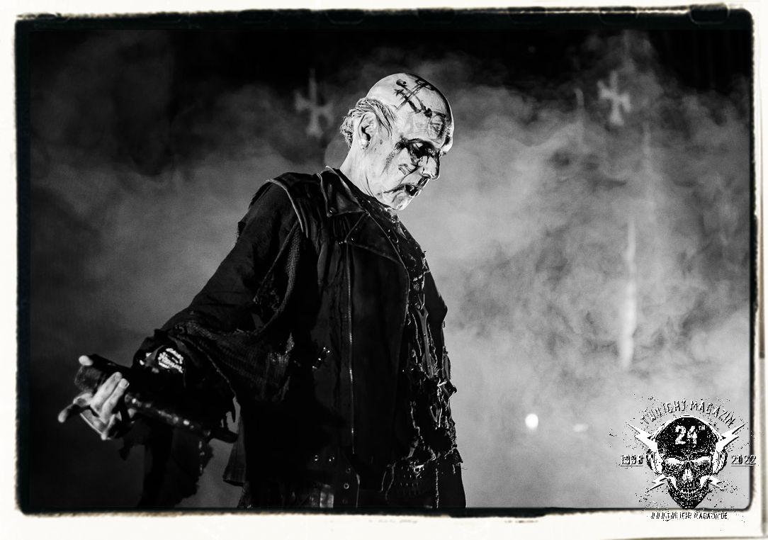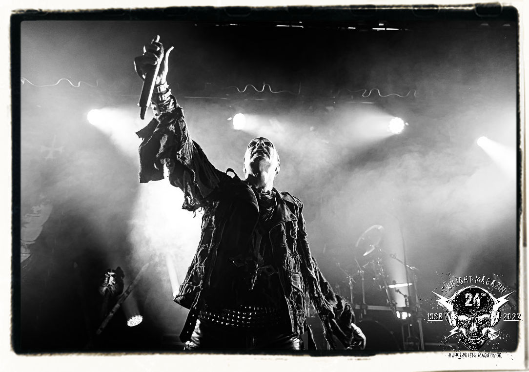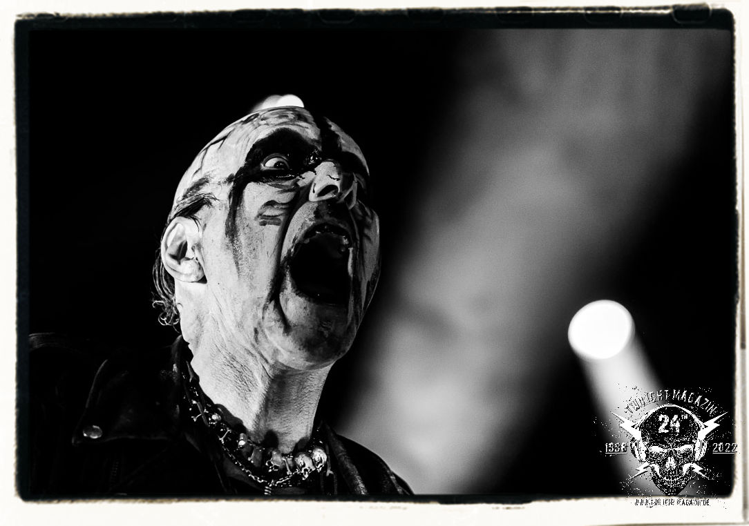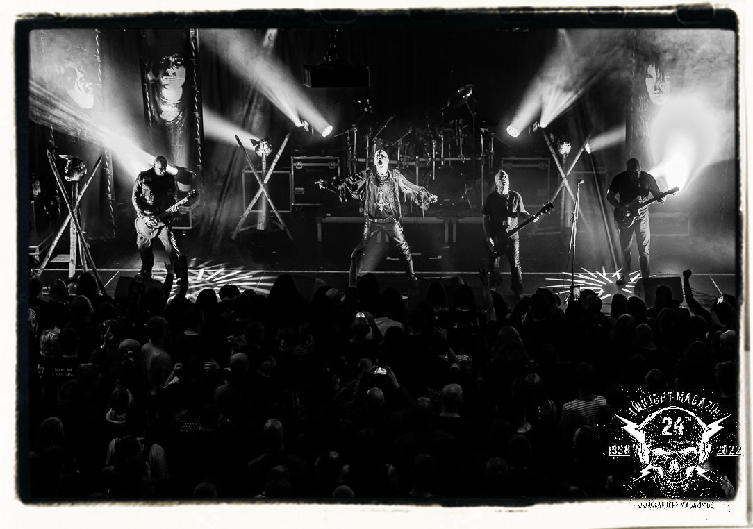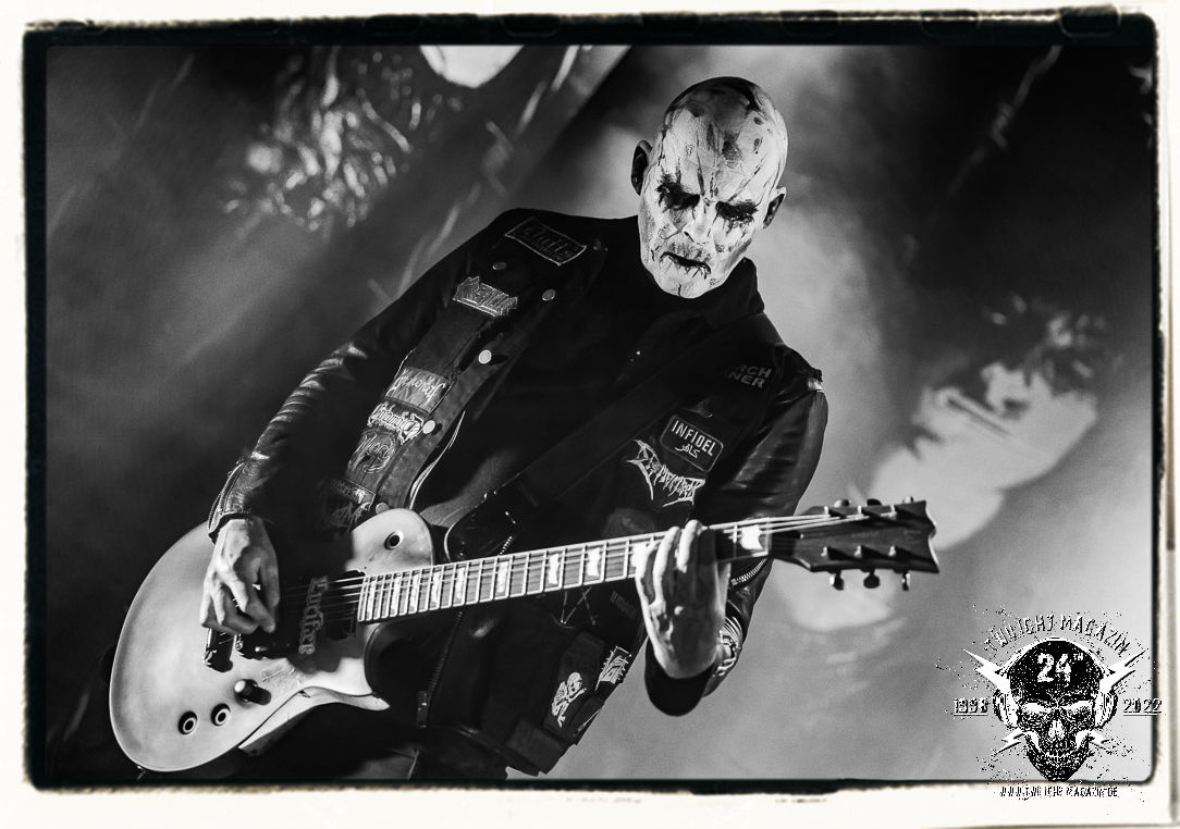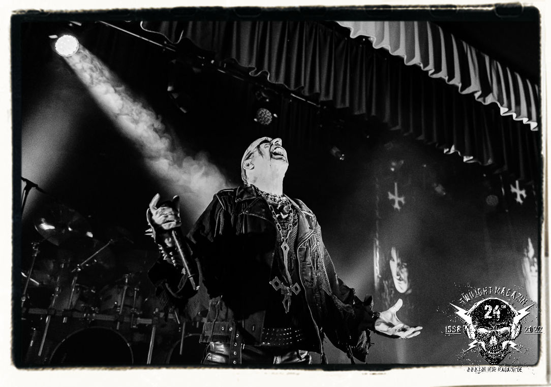 Die einstimmenden Klangkollagen gipfeln schließlich im Percussion-Intro "Silvester Anfang", welches nicht nur die "Deathcrush"-EP von 1987, sondern auch den Beginn des Konzertes einleitet. Endlich betreten Hellhammer, Necrobutcher, die beiden Gitarristen Teloch und Ghul sowie schließlich Sänger Attila Csihar die Bühne. Die Frage nach der Setlist stellt sich zunächst nicht. "Deathcrush", "Necrolust", "Funeral Fog", "Freezing Moon", bei dem die ursprüngliche "When it´s cold, when it´s dark..."-Ansage von Dead eingespielt wird, "Carnage", "Buried By Time And Dust", "Pagan Fears", "Chainsaw Gutsfuck" und schließlich das finale "Pure Fucking Armageddon" entsprechen den Songs, die MAYHEM im November 1990 mit Øystein Aarseth und Per Yngwe Ohlin alias Euronymous und Dead im Eiskeller zu Leipzig spielten. Bassist Necrobutcher lässt es sich nicht nehmen, seine ebenfalls auf dem Live-Album konservierte und seinerzeit der Irritation über die verhaltenen Publikums-Reaktionen geschuldete "Are you dead?"-Ansage noch einmal zu zelebrieren, um danach "Carnage" anzukündigen. Darüber hinaus verzichten MAYHEM glücklicherweise auf überflüssigen Firlefanz, sondern lassen die Musik sprechen. Und so zeichnen sie ein historisches Konzert und den Weg einer Band nach, die in den späten Achtzigern aus dem Death Metal - Underground kam und in der Entwicklung der Protagonisten und Musik schließlich im Black Metal Maßstäbe setzte. "Live in Leipzig" ist aus meiner Sicht auch gerade deshalb so bedeutend, weil es MAYHEM ungefiltert an der Schwelle zwischen den noch deutlich vom extremen Metal der Achtziger geprägten Frühphase in der Entwicklung zu dem Ausdruck zeigt, der schließlich mit dem 1994 veröffentlichten Meilenstein "De Mysteriis Dom Sathanas" nach dem Tod von Euronymous 1993 gipfelte und eine Ära der Band beendete. Natürlich ist das Format 2022 ein anderes und die Band um die verbliebene Rythmus-Sektion Hellhammber/Necrobutcher gewisserweise eine andere. Doch MAYHEM zelebrieren ihr Erbe tatsächlich würdevoll. Die Show ist nicht so chaotisch und abgefuckt, wie auf dem Party.San, was jedoch einer Doku zum Gig geschuldet sein könnte, die zum Revival parallel gedreht wird, und ich würde auch nicht ausschließen wollen dass auch dieser Abend in Leipzig seinen Weg auf einen Tonträger finden wird. Hellhammer ist wie meistens in der Dunkelheit bzw. im dezenten Licht hinter seinem Schlagzeug kaum zu sehen, dafür ist seine Präsenz in beeindruckender Weise zu hören. Attila, seit "De Mysteriis Dom Sathanas" über "Ordo ad Chao" (2007) bis heute wie sein Vorgänger Dead und Nachfolger Maniac untrennbar mit MAYHEM verbunden, beschränkt sich auf sein Organ und seine Fähigkeiten als Hohepriester blasphemischer Gesten und Symbolik. Die beiden Gitarristen Teloch und Ghul sind mittlerweile schon rund zehn Jahre dabei und verkörpern die Fähigkeit der Band, sich immer wieder neu zu erfinden. Sie sorgen für einen dichten Gitarrenteppich. Dabei treten sie nach außen ziemlich gegensätzlich in Erscheinung, der Norweger Teloch mit Corpsepaint wirkt extrem grimmig, die Les Paul-Adaption lässig tief hängend, der Brite Ghul ungeschminkt, durchtrainiert, die Gitarre dabei unter der Brust. Posieren können sie jedoch beide. Und Necrobutcher ist Necrobutcher, zuständig für Bass, Wein und "Kommunikation" mit dem Publikum.