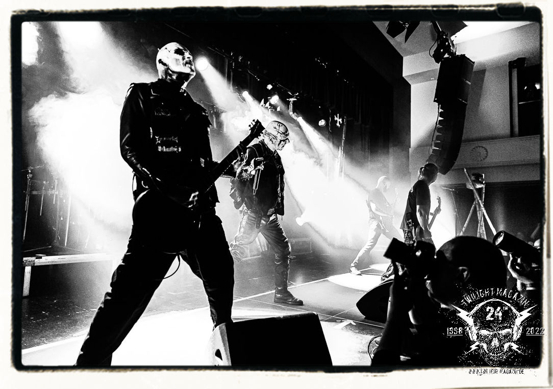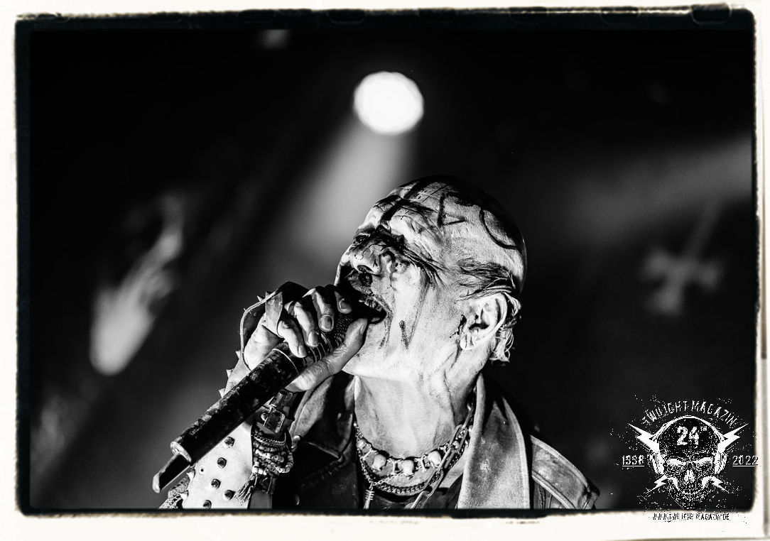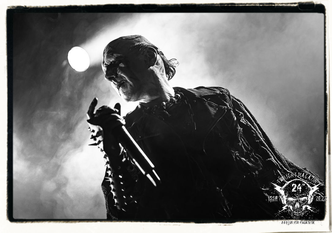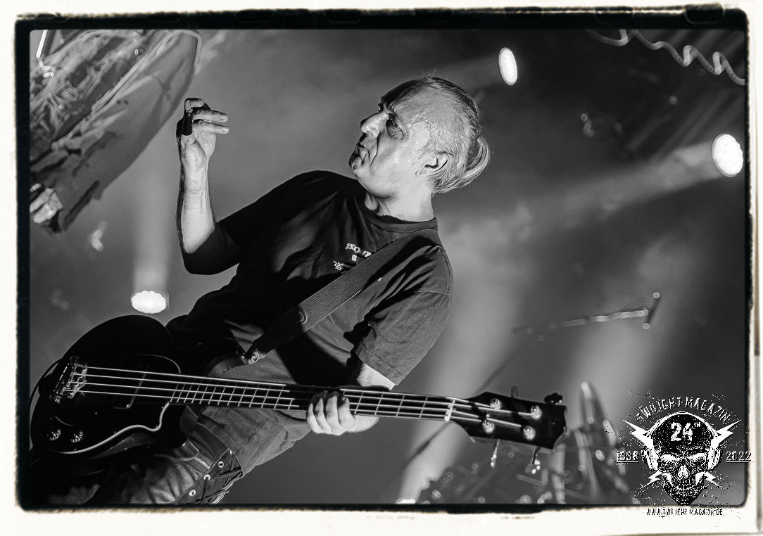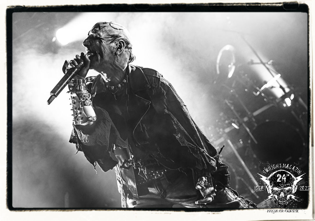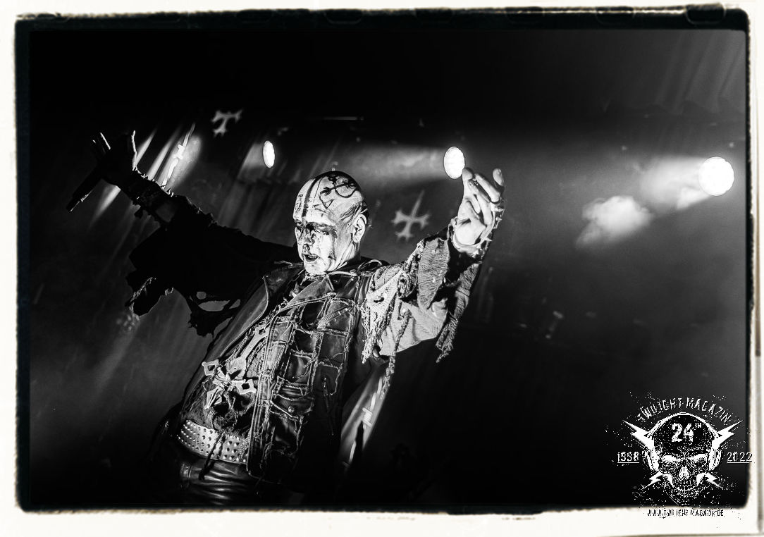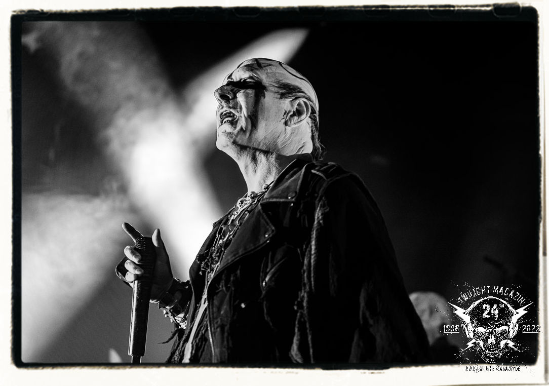 Die einstimmenden Klangkollagen gipfeln schließlich im Percussion-Intro "Silvester Anfang", welches nicht nur die "Deathcrush"-EP von 1987, sondern auch den Beginn des Konzertes einleitet. Endlich betreten Hellhammer, Necrobutcher, die beiden Gitarristen Teloch und Ghul sowie schließlich Sänger Attila Csihar die Bühne. Die Frage nach der Setlist stellt sich zunächst nicht. "Deathcrush", "Necrolust", "Funeral Fog", "Freezing Moon", bei dem die ursprüngliche "When it´s cold, when it´s dark..."-Ansage von Dead eingespielt wird, "Carnage", "Buried By Time And Dust", "Pagan Fears", "Chainsaw Gutsfuck" und schließlich das finale "Pure Fucking Armageddon" entsprechen den Songs, die MAYHEM im November 1990 mit Øystein Aarseth und Per Yngwe Ohlin alias Euronymous und Dead im Eiskeller zu Leipzig spielten. Bassist Necrobutcher lässt es sich nicht nehmen, seine ebenfalls auf dem Live-Album konservierte und seinerzeit der Irritation über die verhaltenen Publikums-Reaktionen geschuldete "Are you dead?"-Ansage noch einmal zu zelebrieren, um danach "Carnage" anzukündigen. Darüber hinaus verzichten MAYHEM glücklicherweise auf überflüssigen Firlefanz, sondern lassen die Musik sprechen. Und so zeichnen sie ein historisches Konzert und den Weg einer Band nach, die in den späten Achtzigern aus dem Death Metal - Underground kam und in der Entwicklung der Protagonisten und Musik schließlich im Black Metal Maßstäbe setzte. "Live in Leipzig" ist aus meiner Sicht auch gerade deshalb so bedeutend, weil es MAYHEM ungefiltert an der Schwelle zwischen den noch deutlich vom extremen Metal der Achtziger geprägten Frühphase in der Entwicklung zu dem Ausdruck zeigt, der schließlich mit dem 1994 veröffentlichten Meilenstein "De Mysteriis Dom Sathanas" nach dem Tod von Euronymous 1993 gipfelte und eine Ära der Band beendete. Natürlich ist das Format 2022 ein anderes und die Band um die verbliebene Rythmus-Sektion Hellhammber/Necrobutcher gewisserweise eine andere. Doch MAYHEM zelebrieren ihr Erbe tatsächlich würdevoll. Die Show ist nicht so chaotisch und abgefuckt, wie auf dem Party.San, was jedoch einer Doku zum Gig geschuldet sein könnte, die zum Revival parallel gedreht wird, und ich würde auch nicht ausschließen wollen dass auch dieser Abend in Leipzig seinen Weg auf einen Tonträger finden wird. Hellhammer ist wie meistens in der Dunkelheit bzw. im dezenten Licht hinter seinem Schlagzeug kaum zu sehen, dafür ist seine Präsenz in beeindruckender Weise zu hören. Attila, seit "De Mysteriis Dom Sathanas" über "Ordo ad Chao" (2007) bis heute wie sein Vorgänger Dead und Nachfolger Maniac untrennbar mit MAYHEM verbunden, beschränkt sich auf sein Organ und seine Fähigkeiten als Hohepriester blasphemischer Gesten und Symbolik. Die beiden Gitarristen Teloch und Ghul sind mittlerweile schon rund zehn Jahre dabei und verkörpern die Fähigkeit der Band, sich immer wieder neu zu erfinden. Sie sorgen für einen dichten Gitarrenteppich. Dabei treten sie nach außen ziemlich gegensätzlich in Erscheinung, der Norweger Teloch mit Corpsepaint wirkt extrem grimmig, die Les Paul-Adaption lässig tief hängend, der Brite Ghul ungeschminkt, durchtrainiert, die Gitarre dabei unter der Brust. Posieren können sie jedoch beide. Und Necrobutcher ist Necrobutcher, zuständig für Bass, Wein und "Kommunikation" mit dem Publikum.