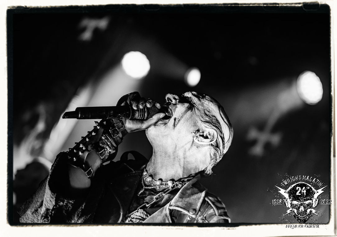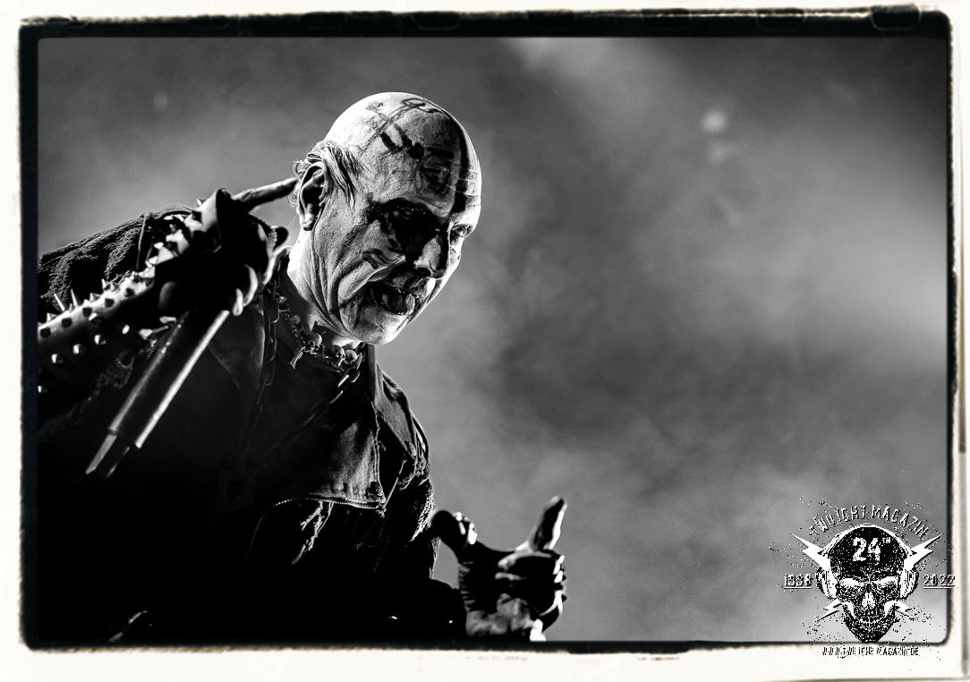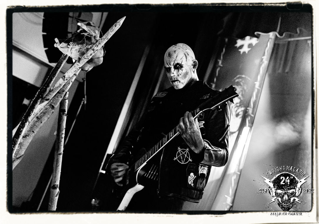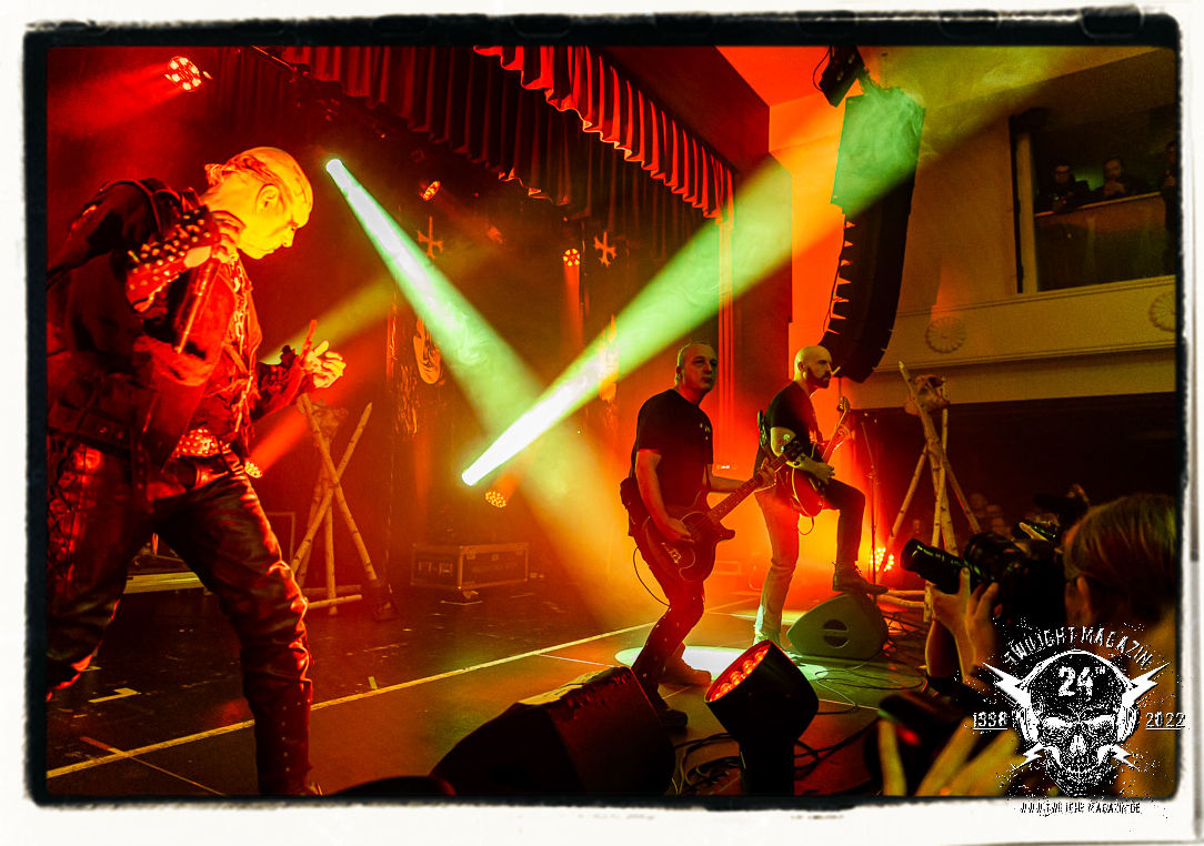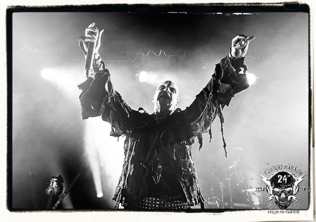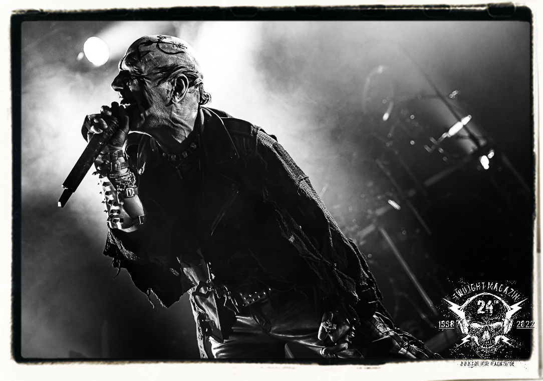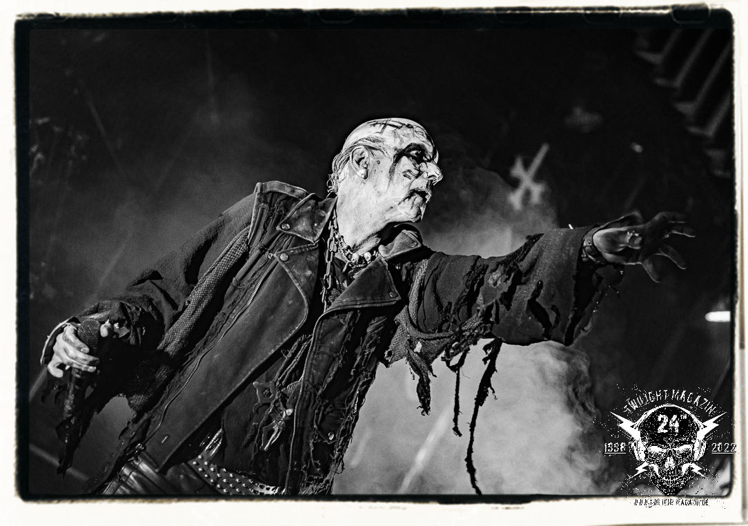 Die einstimmenden Klangkollagen gipfeln schließlich im Percussion-Intro "Silvester Anfang", welches nicht nur die "Deathcrush"-EP von 1987, sondern auch den Beginn des Konzertes einleitet. Endlich betreten Hellhammer, Necrobutcher, die beiden Gitarristen Teloch und Ghul sowie schließlich Sänger Attila Csihar die Bühne. Die Frage nach der Setlist stellt sich zunächst nicht. "Deathcrush", "Necrolust", "Funeral Fog", "Freezing Moon", bei dem die ursprüngliche "When it´s cold, when it´s dark..."-Ansage von Dead eingespielt wird, "Carnage", "Buried By Time And Dust", "Pagan Fears", "Chainsaw Gutsfuck" und schließlich das finale "Pure Fucking Armageddon" entsprechen den Songs, die MAYHEM im November 1990 mit Øystein Aarseth und Per Yngwe Ohlin alias Euronymous und Dead im Eiskeller zu Leipzig spielten. Bassist Necrobutcher lässt es sich nicht nehmen, seine ebenfalls auf dem Live-Album konservierte und seinerzeit der Irritation über die verhaltenen Publikums-Reaktionen geschuldete "Are you dead?"-Ansage noch einmal zu zelebrieren, um danach "Carnage" anzukündigen. Darüber hinaus verzichten MAYHEM glücklicherweise auf überflüssigen Firlefanz, sondern lassen die Musik sprechen. Und so zeichnen sie ein historisches Konzert und den Weg einer Band nach, die in den späten Achtzigern aus dem Death Metal - Underground kam und in der Entwicklung der Protagonisten und Musik schließlich im Black Metal Maßstäbe setzte. "Live in Leipzig" ist aus meiner Sicht auch gerade deshalb so bedeutend, weil es MAYHEM ungefiltert an der Schwelle zwischen den noch deutlich vom extremen Metal der Achtziger geprägten Frühphase in der Entwicklung zu dem Ausdruck zeigt, der schließlich mit dem 1994 veröffentlichten Meilenstein "De Mysteriis Dom Sathanas" nach dem Tod von Euronymous 1993 gipfelte und eine Ära der Band beendete. Natürlich ist das Format 2022 ein anderes und die Band um die verbliebene Rythmus-Sektion Hellhammber/Necrobutcher gewisserweise eine andere. Doch MAYHEM zelebrieren ihr Erbe tatsächlich würdevoll. Die Show ist nicht so chaotisch und abgefuckt, wie auf dem Party.San, was jedoch einer Doku zum Gig geschuldet sein könnte, die zum Revival parallel gedreht wird, und ich würde auch nicht ausschließen wollen dass auch dieser Abend in Leipzig seinen Weg auf einen Tonträger finden wird. Hellhammer ist wie meistens in der Dunkelheit bzw. im dezenten Licht hinter seinem Schlagzeug kaum zu sehen, dafür ist seine Präsenz in beeindruckender Weise zu hören. Attila, seit "De Mysteriis Dom Sathanas" über "Ordo ad Chao" (2007) bis heute wie sein Vorgänger Dead und Nachfolger Maniac untrennbar mit MAYHEM verbunden, beschränkt sich auf sein Organ und seine Fähigkeiten als Hohepriester blasphemischer Gesten und Symbolik. Die beiden Gitarristen Teloch und Ghul sind mittlerweile schon rund zehn Jahre dabei und verkörpern die Fähigkeit der Band, sich immer wieder neu zu erfinden. Sie sorgen für einen dichten Gitarrenteppich. Dabei treten sie nach außen ziemlich gegensätzlich in Erscheinung, der Norweger Teloch mit Corpsepaint wirkt extrem grimmig, die Les Paul-Adaption lässig tief hängend, der Brite Ghul ungeschminkt, durchtrainiert, die Gitarre dabei unter der Brust. Posieren können sie jedoch beide. Und Necrobutcher ist Necrobutcher, zuständig für Bass, Wein und "Kommunikation" mit dem Publikum.