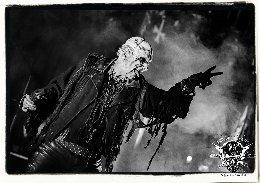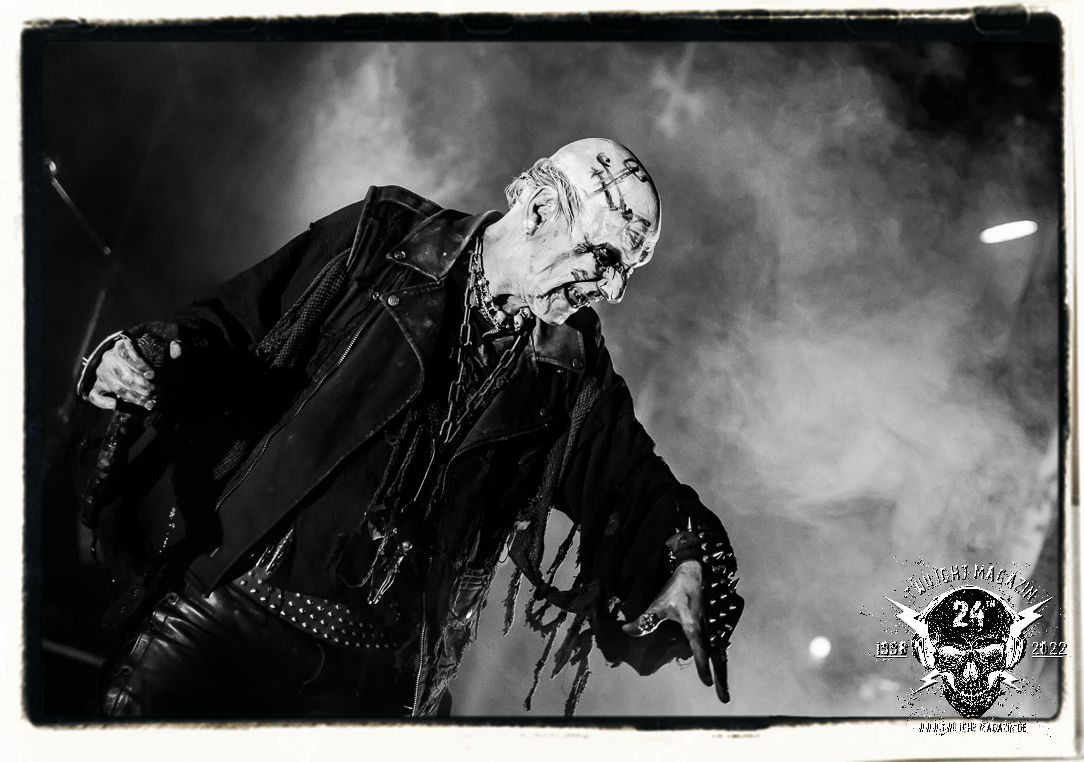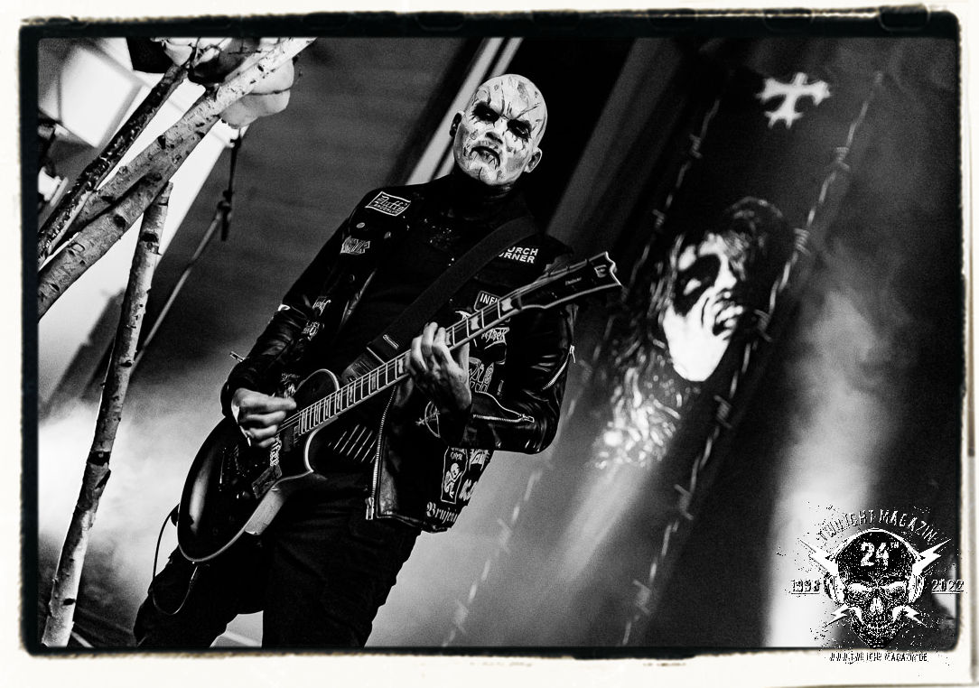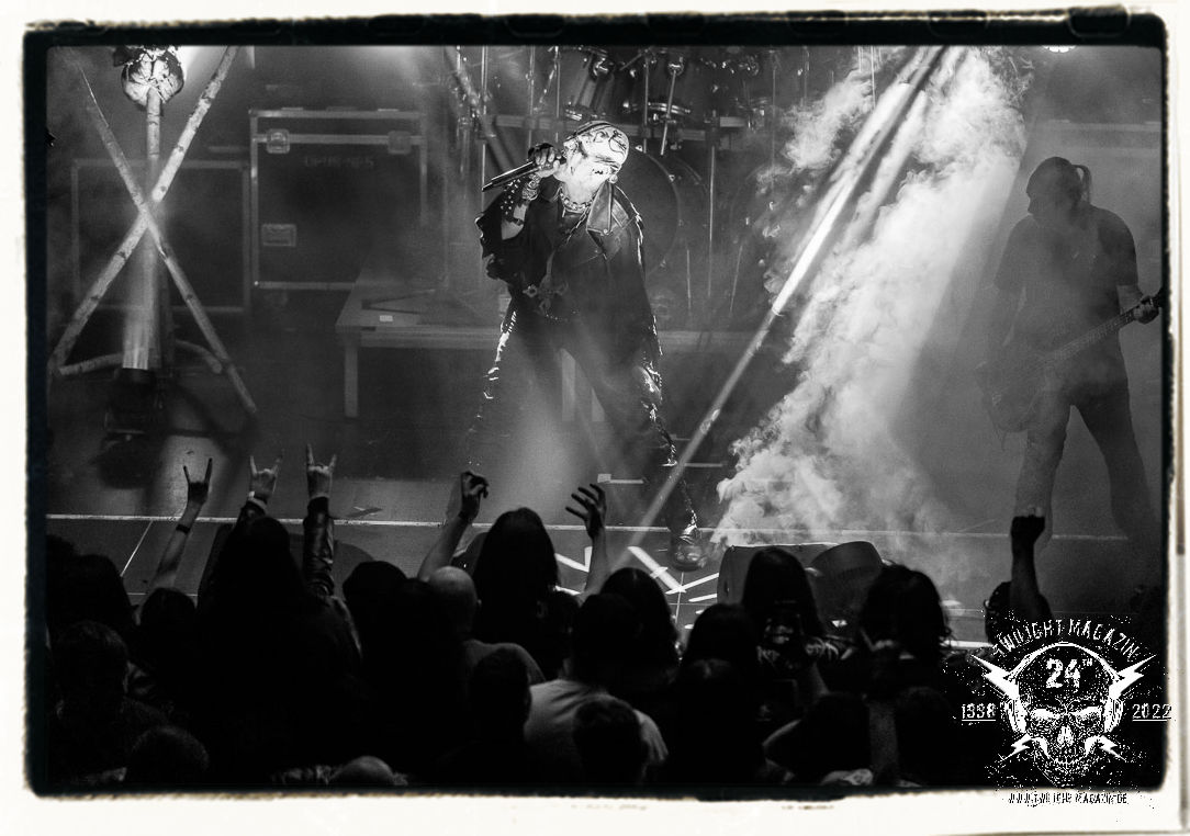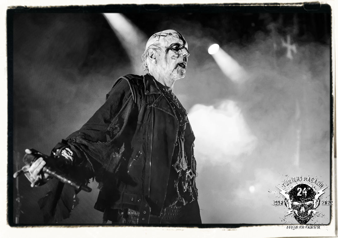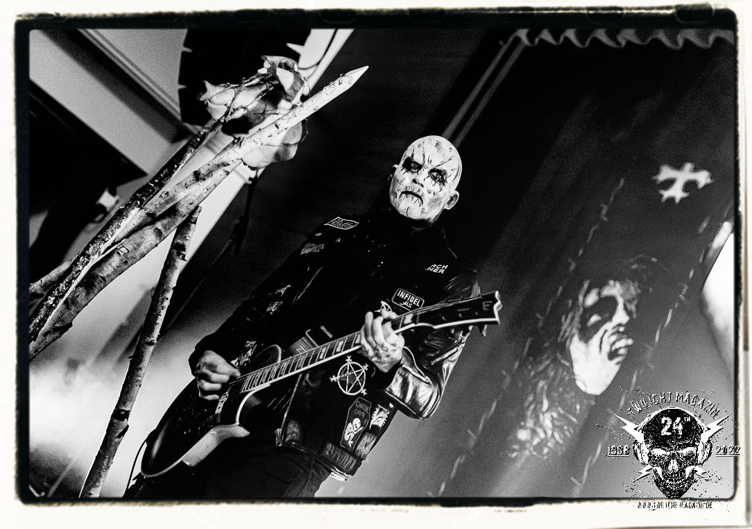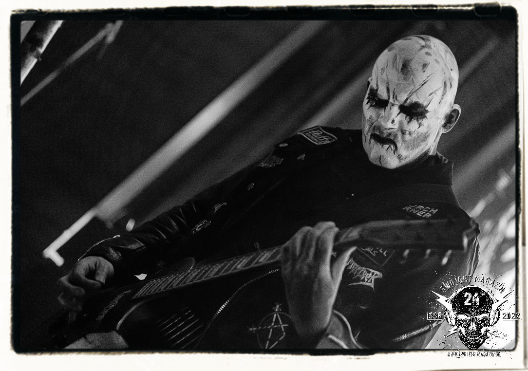 Die einstimmenden Klangkollagen gipfeln schließlich im Percussion-Intro "Silvester Anfang", welches nicht nur die "Deathcrush"-EP von 1987, sondern auch den Beginn des Konzertes einleitet. Endlich betreten Hellhammer, Necrobutcher, die beiden Gitarristen Teloch und Ghul sowie schließlich Sänger Attila Csihar die Bühne. Die Frage nach der Setlist stellt sich zunächst nicht. "Deathcrush", "Necrolust", "Funeral Fog", "Freezing Moon", bei dem die ursprüngliche "When it´s cold, when it´s dark..."-Ansage von Dead eingespielt wird, "Carnage", "Buried By Time And Dust", "Pagan Fears", "Chainsaw Gutsfuck" und schließlich das finale "Pure Fucking Armageddon" entsprechen den Songs, die MAYHEM im November 1990 mit Øystein Aarseth und Per Yngwe Ohlin alias Euronymous und Dead im Eiskeller zu Leipzig spielten. Bassist Necrobutcher lässt es sich nicht nehmen, seine ebenfalls auf dem Live-Album konservierte und seinerzeit der Irritation über die verhaltenen Publikums-Reaktionen geschuldete "Are you dead?"-Ansage noch einmal zu zelebrieren, um danach "Carnage" anzukündigen. Darüber hinaus verzichten MAYHEM glücklicherweise auf überflüssigen Firlefanz, sondern lassen die Musik sprechen. Und so zeichnen sie ein historisches Konzert und den Weg einer Band nach, die in den späten Achtzigern aus dem Death Metal - Underground kam und in der Entwicklung der Protagonisten und Musik schließlich im Black Metal Maßstäbe setzte. "Live in Leipzig" ist aus meiner Sicht auch gerade deshalb so bedeutend, weil es MAYHEM ungefiltert an der Schwelle zwischen den noch deutlich vom extremen Metal der Achtziger geprägten Frühphase in der Entwicklung zu dem Ausdruck zeigt, der schließlich mit dem 1994 veröffentlichten Meilenstein "De Mysteriis Dom Sathanas" nach dem Tod von Euronymous 1993 gipfelte und eine Ära der Band beendete. Natürlich ist das Format 2022 ein anderes und die Band um die verbliebene Rythmus-Sektion Hellhammber/Necrobutcher gewisserweise eine andere. Doch MAYHEM zelebrieren ihr Erbe tatsächlich würdevoll. Die Show ist nicht so chaotisch und abgefuckt, wie auf dem Party.San, was jedoch einer Doku zum Gig geschuldet sein könnte, die zum Revival parallel gedreht wird, und ich würde auch nicht ausschließen wollen dass auch dieser Abend in Leipzig seinen Weg auf einen Tonträger finden wird. Hellhammer ist wie meistens in der Dunkelheit bzw. im dezenten Licht hinter seinem Schlagzeug kaum zu sehen, dafür ist seine Präsenz in beeindruckender Weise zu hören. Attila, seit "De Mysteriis Dom Sathanas" über "Ordo ad Chao" (2007) bis heute wie sein Vorgänger Dead und Nachfolger Maniac untrennbar mit MAYHEM verbunden, beschränkt sich auf sein Organ und seine Fähigkeiten als Hohepriester blasphemischer Gesten und Symbolik. Die beiden Gitarristen Teloch und Ghul sind mittlerweile schon rund zehn Jahre dabei und verkörpern die Fähigkeit der Band, sich immer wieder neu zu erfinden. Sie sorgen für einen dichten Gitarrenteppich. Dabei treten sie nach außen ziemlich gegensätzlich in Erscheinung, der Norweger Teloch mit Corpsepaint wirkt extrem grimmig, die Les Paul-Adaption lässig tief hängend, der Brite Ghul ungeschminkt, durchtrainiert, die Gitarre dabei unter der Brust. Posieren können sie jedoch beide. Und Necrobutcher ist Necrobutcher, zuständig für Bass, Wein und "Kommunikation" mit dem Publikum.