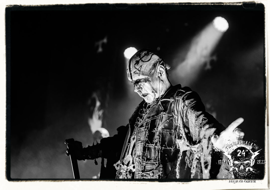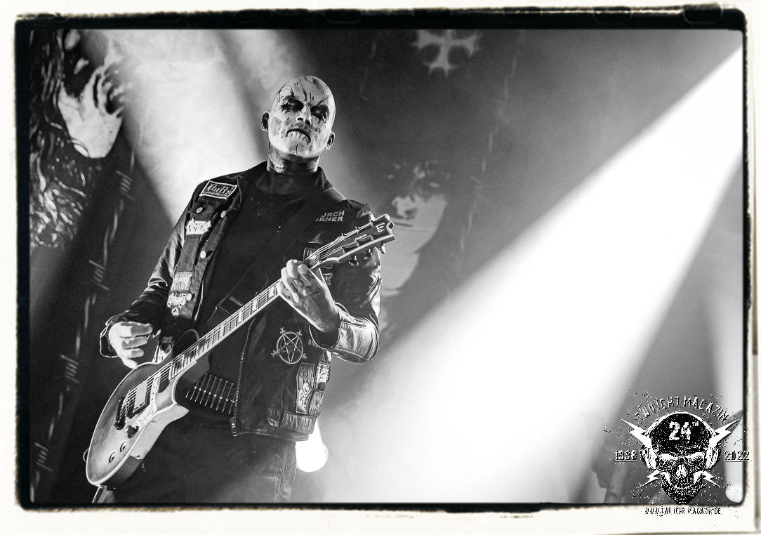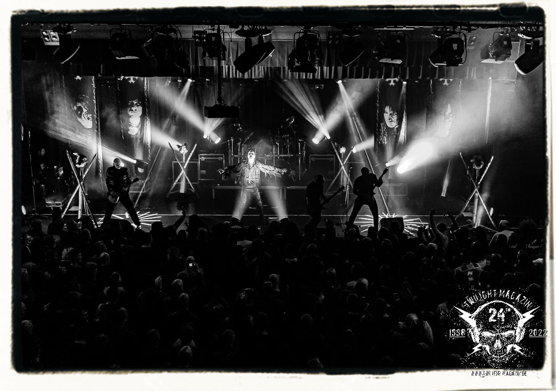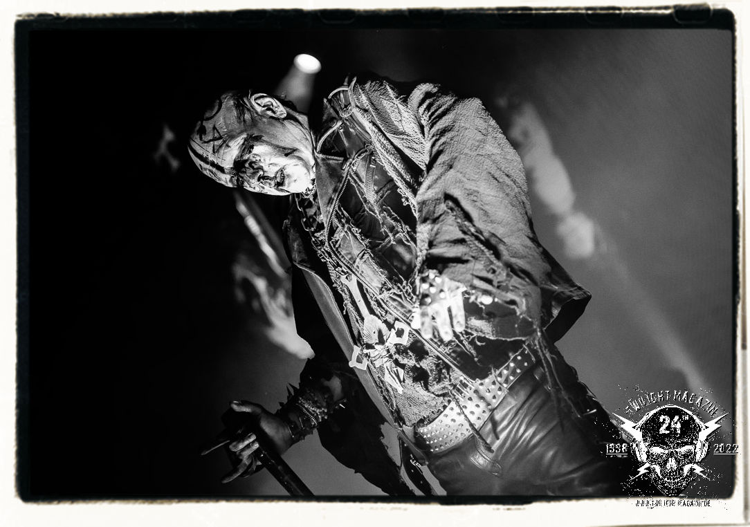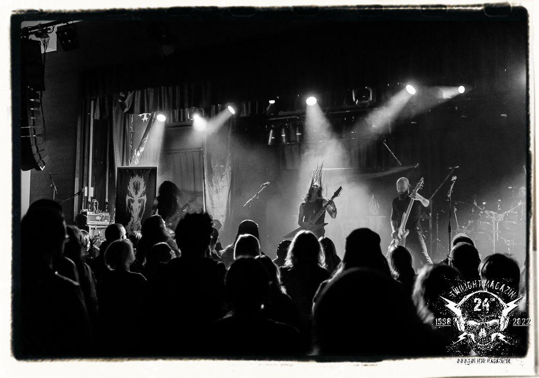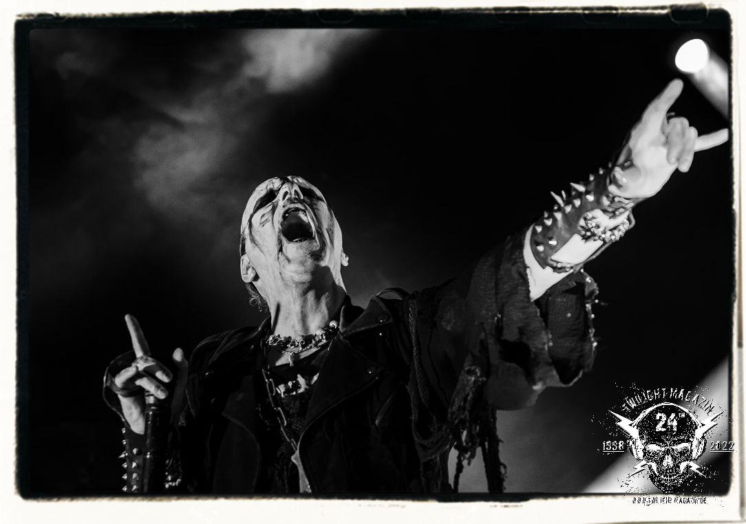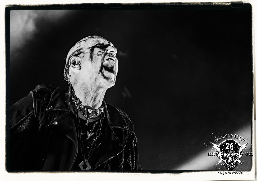 Die einstimmenden Klangkollagen gipfeln schließlich im Percussion-Intro "Silvester Anfang", welches nicht nur die "Deathcrush"-EP von 1987, sondern auch den Beginn des Konzertes einleitet. Endlich betreten Hellhammer, Necrobutcher, die beiden Gitarristen Teloch und Ghul sowie schließlich Sänger Attila Csihar die Bühne. Die Frage nach der Setlist stellt sich zunächst nicht. "Deathcrush", "Necrolust", "Funeral Fog", "Freezing Moon", bei dem die ursprüngliche "When it´s cold, when it´s dark..."-Ansage von Dead eingespielt wird, "Carnage", "Buried By Time And Dust", "Pagan Fears", "Chainsaw Gutsfuck" und schließlich das finale "Pure Fucking Armageddon" entsprechen den Songs, die MAYHEM im November 1990 mit Øystein Aarseth und Per Yngwe Ohlin alias Euronymous und Dead im Eiskeller zu Leipzig spielten. Bassist Necrobutcher lässt es sich nicht nehmen, seine ebenfalls auf dem Live-Album konservierte und seinerzeit der Irritation über die verhaltenen Publikums-Reaktionen geschuldete "Are you dead?"-Ansage noch einmal zu zelebrieren, um danach "Carnage" anzukündigen. Darüber hinaus verzichten MAYHEM glücklicherweise auf überflüssigen Firlefanz, sondern lassen die Musik sprechen. Und so zeichnen sie ein historisches Konzert und den Weg einer Band nach, die in den späten Achtzigern aus dem Death Metal - Underground kam und in der Entwicklung der Protagonisten und Musik schließlich im Black Metal Maßstäbe setzte. "Live in Leipzig" ist aus meiner Sicht auch gerade deshalb so bedeutend, weil es MAYHEM ungefiltert an der Schwelle zwischen den noch deutlich vom extremen Metal der Achtziger geprägten Frühphase in der Entwicklung zu dem Ausdruck zeigt, der schließlich mit dem 1994 veröffentlichten Meilenstein "De Mysteriis Dom Sathanas" nach dem Tod von Euronymous 1993 gipfelte und eine Ära der Band beendete. Natürlich ist das Format 2022 ein anderes und die Band um die verbliebene Rythmus-Sektion Hellhammber/Necrobutcher gewisserweise eine andere. Doch MAYHEM zelebrieren ihr Erbe tatsächlich würdevoll. Die Show ist nicht so chaotisch und abgefuckt, wie auf dem Party.San, was jedoch einer Doku zum Gig geschuldet sein könnte, die zum Revival parallel gedreht wird, und ich würde auch nicht ausschließen wollen dass auch dieser Abend in Leipzig seinen Weg auf einen Tonträger finden wird. Hellhammer ist wie meistens in der Dunkelheit bzw. im dezenten Licht hinter seinem Schlagzeug kaum zu sehen, dafür ist seine Präsenz in beeindruckender Weise zu hören. Attila, seit "De Mysteriis Dom Sathanas" über "Ordo ad Chao" (2007) bis heute wie sein Vorgänger Dead und Nachfolger Maniac untrennbar mit MAYHEM verbunden, beschränkt sich auf sein Organ und seine Fähigkeiten als Hohepriester blasphemischer Gesten und Symbolik. Die beiden Gitarristen Teloch und Ghul sind mittlerweile schon rund zehn Jahre dabei und verkörpern die Fähigkeit der Band, sich immer wieder neu zu erfinden. Sie sorgen für einen dichten Gitarrenteppich. Dabei treten sie nach außen ziemlich gegensätzlich in Erscheinung, der Norweger Teloch mit Corpsepaint wirkt extrem grimmig, die Les Paul-Adaption lässig tief hängend, der Brite Ghul ungeschminkt, durchtrainiert, die Gitarre dabei unter der Brust. Posieren können sie jedoch beide. Und Necrobutcher ist Necrobutcher, zuständig für Bass, Wein und "Kommunikation" mit dem Publikum.