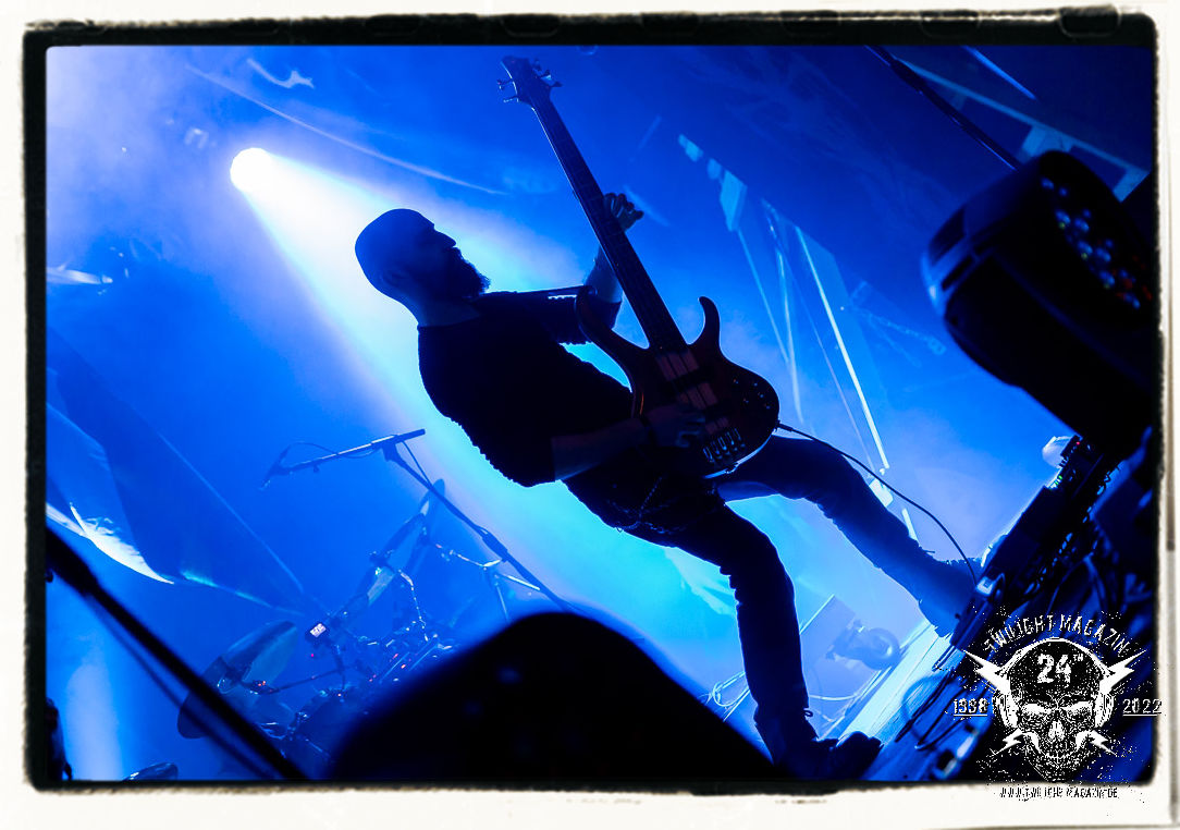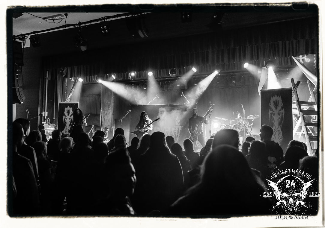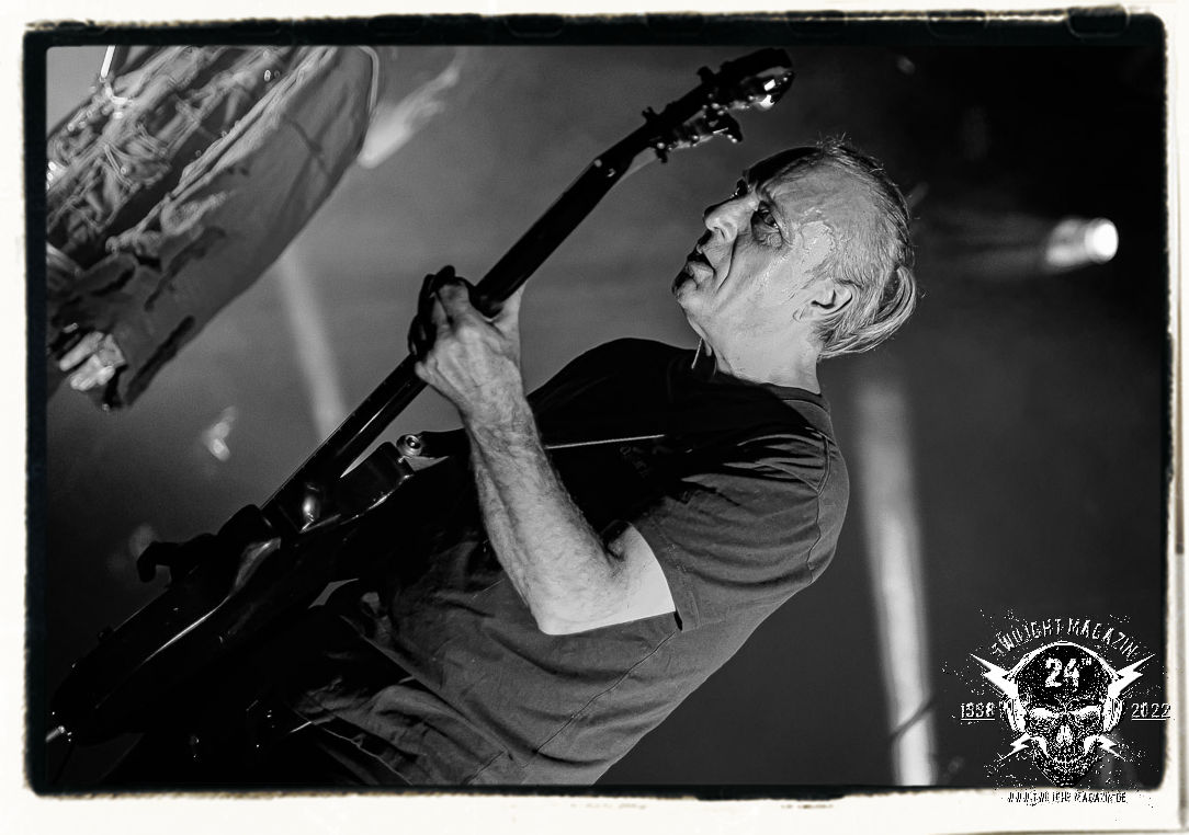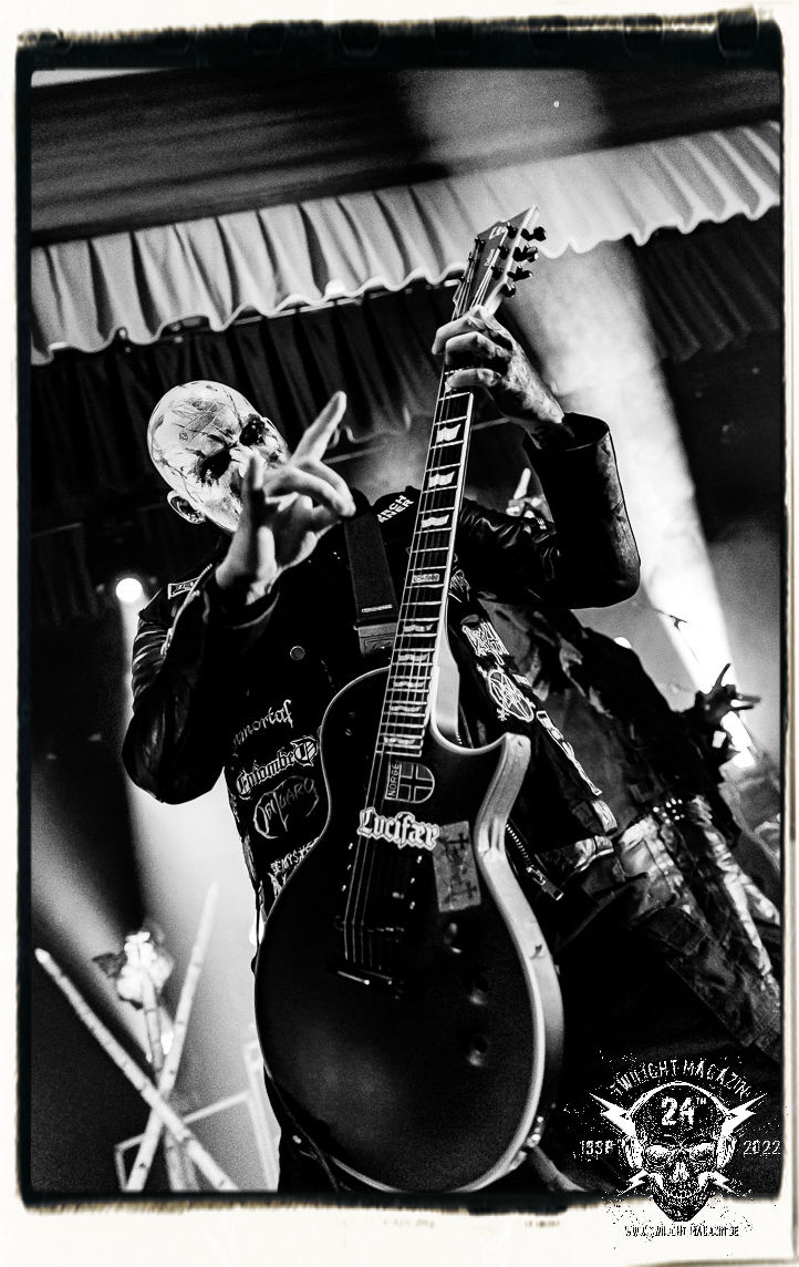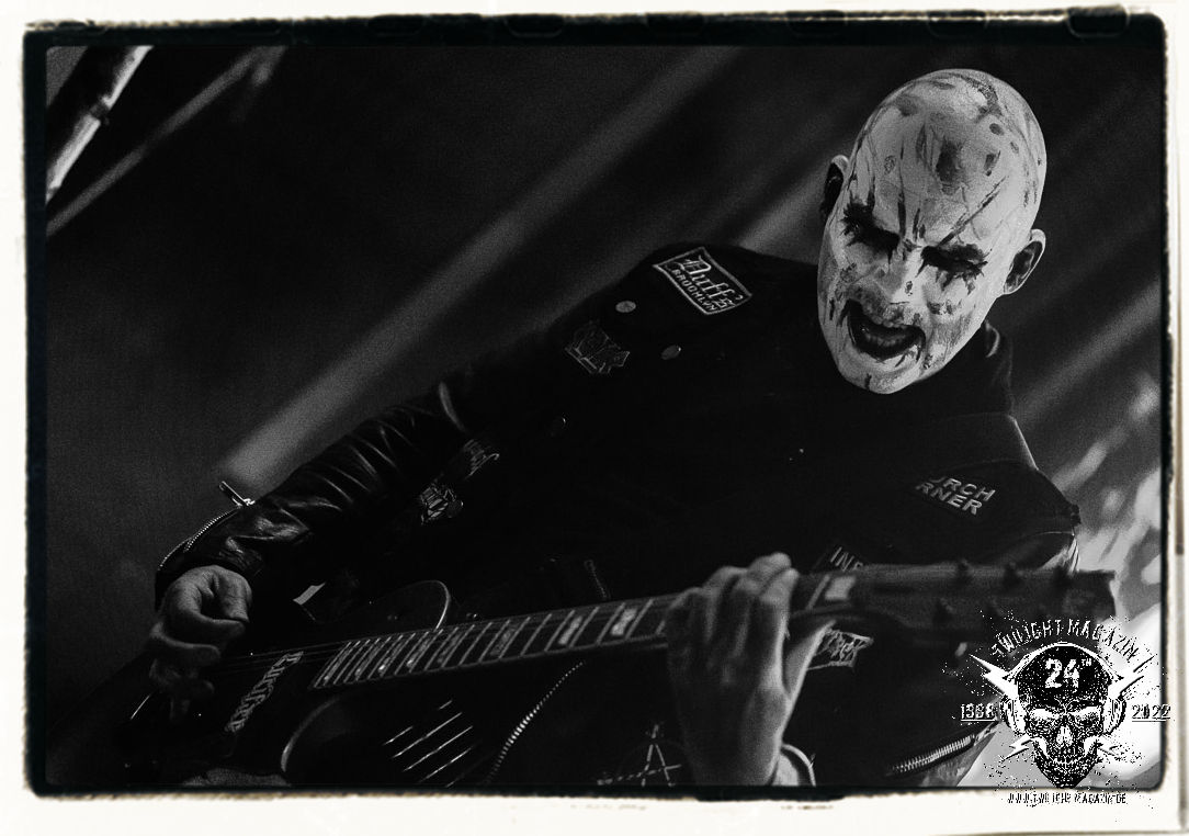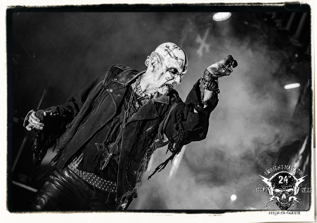 Die einstimmenden Klangkollagen gipfeln schließlich im Percussion-Intro "Silvester Anfang", welches nicht nur die "Deathcrush"-EP von 1987, sondern auch den Beginn des Konzertes einleitet. Endlich betreten Hellhammer, Necrobutcher, die beiden Gitarristen Teloch und Ghul sowie schließlich Sänger Attila Csihar die Bühne. Die Frage nach der Setlist stellt sich zunächst nicht. "Deathcrush", "Necrolust", "Funeral Fog", "Freezing Moon", bei dem die ursprüngliche "When it´s cold, when it´s dark..."-Ansage von Dead eingespielt wird, "Carnage", "Buried By Time And Dust", "Pagan Fears", "Chainsaw Gutsfuck" und schließlich das finale "Pure Fucking Armageddon" entsprechen den Songs, die MAYHEM im November 1990 mit Øystein Aarseth und Per Yngwe Ohlin alias Euronymous und Dead im Eiskeller zu Leipzig spielten. Bassist Necrobutcher lässt es sich nicht nehmen, seine ebenfalls auf dem Live-Album konservierte und seinerzeit der Irritation über die verhaltenen Publikums-Reaktionen geschuldete "Are you dead?"-Ansage noch einmal zu zelebrieren, um danach "Carnage" anzukündigen. Darüber hinaus verzichten MAYHEM glücklicherweise auf überflüssigen Firlefanz, sondern lassen die Musik sprechen. Und so zeichnen sie ein historisches Konzert und den Weg einer Band nach, die in den späten Achtzigern aus dem Death Metal - Underground kam und in der Entwicklung der Protagonisten und Musik schließlich im Black Metal Maßstäbe setzte. "Live in Leipzig" ist aus meiner Sicht auch gerade deshalb so bedeutend, weil es MAYHEM ungefiltert an der Schwelle zwischen den noch deutlich vom extremen Metal der Achtziger geprägten Frühphase in der Entwicklung zu dem Ausdruck zeigt, der schließlich mit dem 1994 veröffentlichten Meilenstein "De Mysteriis Dom Sathanas" nach dem Tod von Euronymous 1993 gipfelte und eine Ära der Band beendete. Natürlich ist das Format 2022 ein anderes und die Band um die verbliebene Rythmus-Sektion Hellhammber/Necrobutcher gewisserweise eine andere. Doch MAYHEM zelebrieren ihr Erbe tatsächlich würdevoll. Die Show ist nicht so chaotisch und abgefuckt, wie auf dem Party.San, was jedoch einer Doku zum Gig geschuldet sein könnte, die zum Revival parallel gedreht wird, und ich würde auch nicht ausschließen wollen dass auch dieser Abend in Leipzig seinen Weg auf einen Tonträger finden wird. Hellhammer ist wie meistens in der Dunkelheit bzw. im dezenten Licht hinter seinem Schlagzeug kaum zu sehen, dafür ist seine Präsenz in beeindruckender Weise zu hören. Attila, seit "De Mysteriis Dom Sathanas" über "Ordo ad Chao" (2007) bis heute wie sein Vorgänger Dead und Nachfolger Maniac untrennbar mit MAYHEM verbunden, beschränkt sich auf sein Organ und seine Fähigkeiten als Hohepriester blasphemischer Gesten und Symbolik. Die beiden Gitarristen Teloch und Ghul sind mittlerweile schon rund zehn Jahre dabei und verkörpern die Fähigkeit der Band, sich immer wieder neu zu erfinden. Sie sorgen für einen dichten Gitarrenteppich. Dabei treten sie nach außen ziemlich gegensätzlich in Erscheinung, der Norweger Teloch mit Corpsepaint wirkt extrem grimmig, die Les Paul-Adaption lässig tief hängend, der Brite Ghul ungeschminkt, durchtrainiert, die Gitarre dabei unter der Brust. Posieren können sie jedoch beide. Und Necrobutcher ist Necrobutcher, zuständig für Bass, Wein und "Kommunikation" mit dem Publikum.