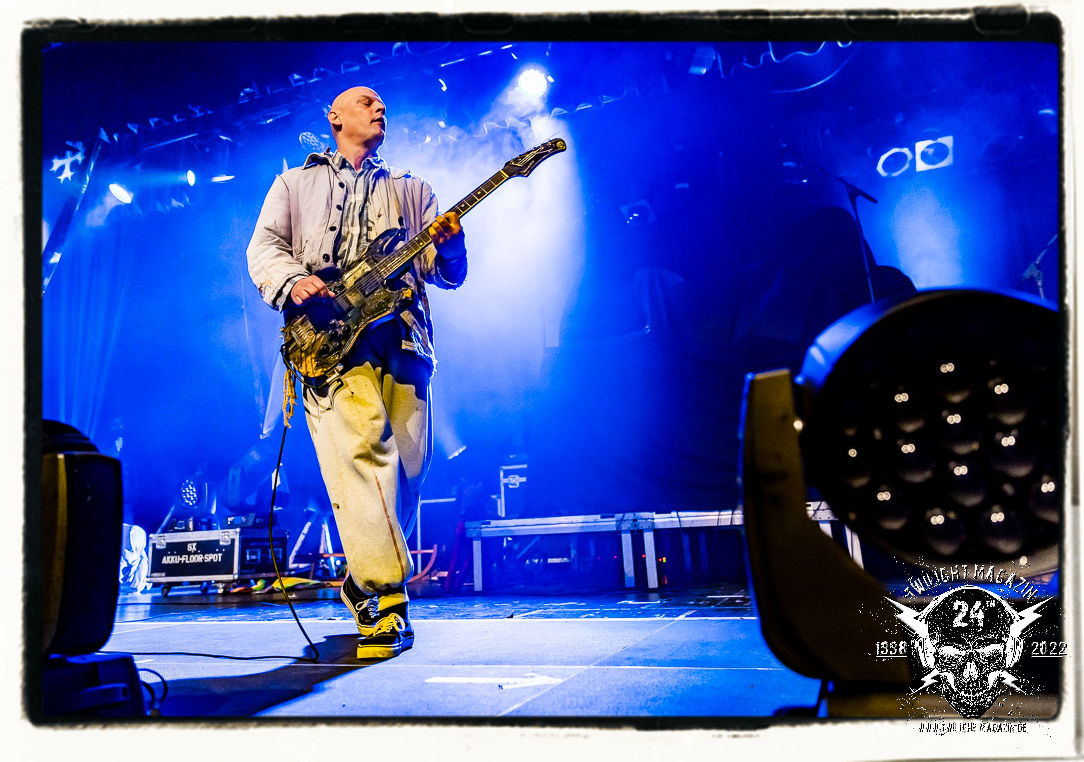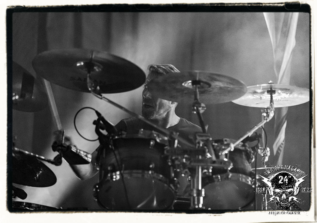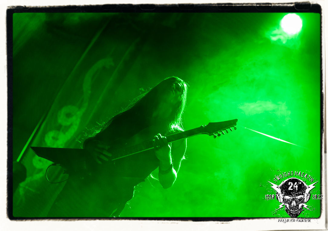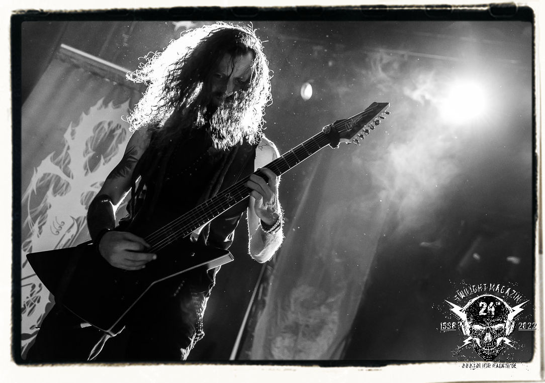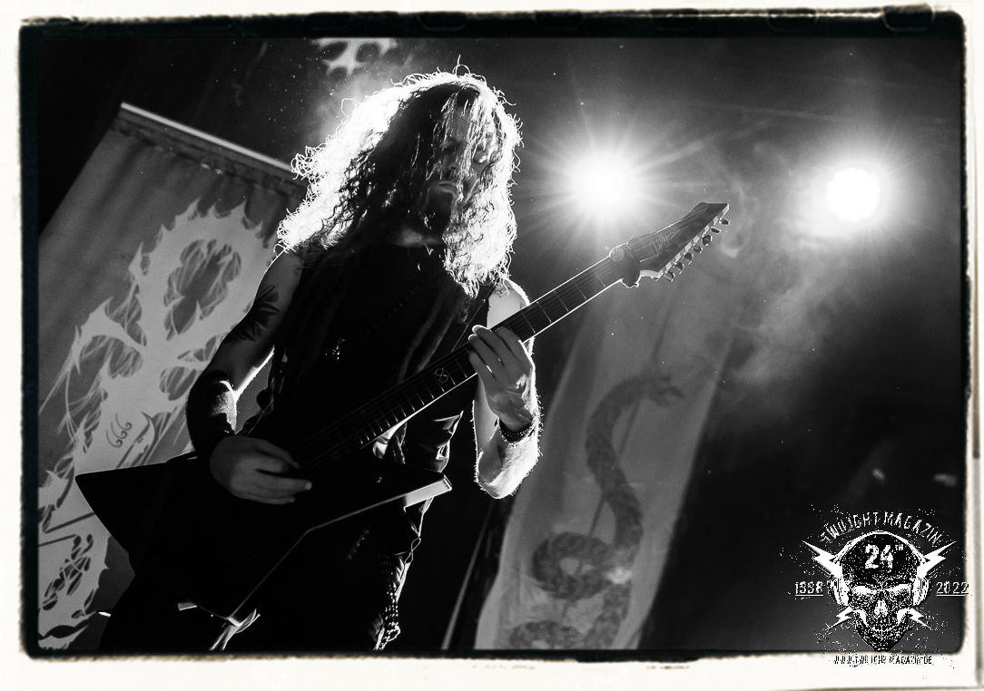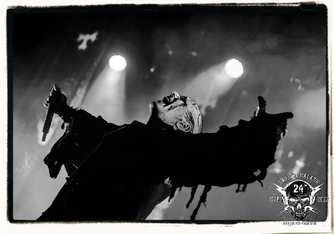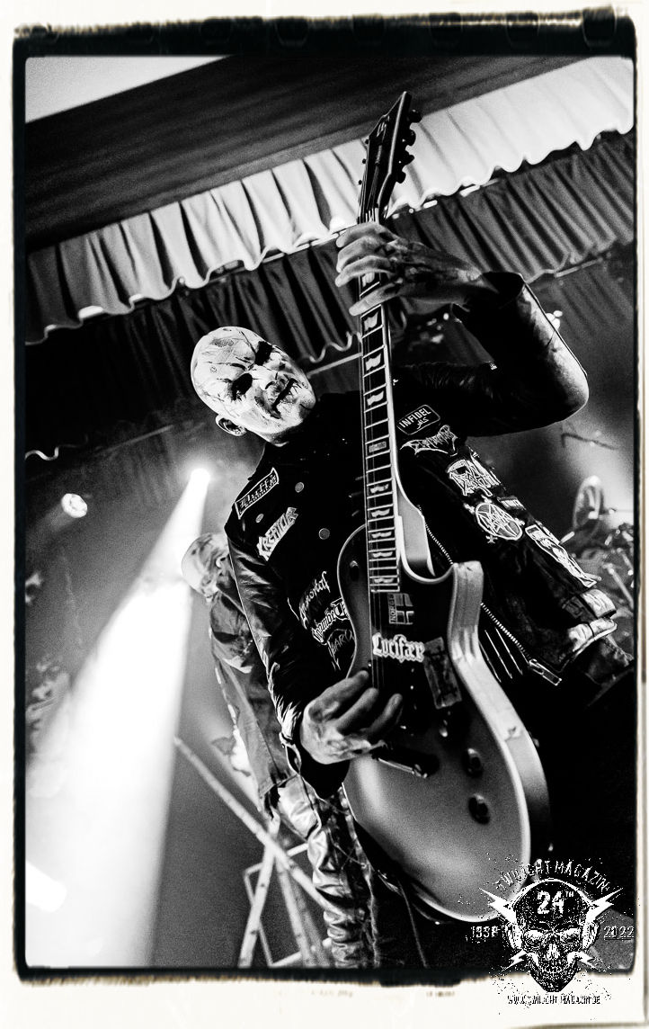 Die einstimmenden Klangkollagen gipfeln schließlich im Percussion-Intro "Silvester Anfang", welches nicht nur die "Deathcrush"-EP von 1987, sondern auch den Beginn des Konzertes einleitet. Endlich betreten Hellhammer, Necrobutcher, die beiden Gitarristen Teloch und Ghul sowie schließlich Sänger Attila Csihar die Bühne. Die Frage nach der Setlist stellt sich zunächst nicht. "Deathcrush", "Necrolust", "Funeral Fog", "Freezing Moon", bei dem die ursprüngliche "When it´s cold, when it´s dark..."-Ansage von Dead eingespielt wird, "Carnage", "Buried By Time And Dust", "Pagan Fears", "Chainsaw Gutsfuck" und schließlich das finale "Pure Fucking Armageddon" entsprechen den Songs, die MAYHEM im November 1990 mit Øystein Aarseth und Per Yngwe Ohlin alias Euronymous und Dead im Eiskeller zu Leipzig spielten. Bassist Necrobutcher lässt es sich nicht nehmen, seine ebenfalls auf dem Live-Album konservierte und seinerzeit der Irritation über die verhaltenen Publikums-Reaktionen geschuldete "Are you dead?"-Ansage noch einmal zu zelebrieren, um danach "Carnage" anzukündigen. Darüber hinaus verzichten MAYHEM glücklicherweise auf überflüssigen Firlefanz, sondern lassen die Musik sprechen. Und so zeichnen sie ein historisches Konzert und den Weg einer Band nach, die in den späten Achtzigern aus dem Death Metal - Underground kam und in der Entwicklung der Protagonisten und Musik schließlich im Black Metal Maßstäbe setzte. "Live in Leipzig" ist aus meiner Sicht auch gerade deshalb so bedeutend, weil es MAYHEM ungefiltert an der Schwelle zwischen den noch deutlich vom extremen Metal der Achtziger geprägten Frühphase in der Entwicklung zu dem Ausdruck zeigt, der schließlich mit dem 1994 veröffentlichten Meilenstein "De Mysteriis Dom Sathanas" nach dem Tod von Euronymous 1993 gipfelte und eine Ära der Band beendete. Natürlich ist das Format 2022 ein anderes und die Band um die verbliebene Rythmus-Sektion Hellhammber/Necrobutcher gewisserweise eine andere. Doch MAYHEM zelebrieren ihr Erbe tatsächlich würdevoll. Die Show ist nicht so chaotisch und abgefuckt, wie auf dem Party.San, was jedoch einer Doku zum Gig geschuldet sein könnte, die zum Revival parallel gedreht wird, und ich würde auch nicht ausschließen wollen dass auch dieser Abend in Leipzig seinen Weg auf einen Tonträger finden wird. Hellhammer ist wie meistens in der Dunkelheit bzw. im dezenten Licht hinter seinem Schlagzeug kaum zu sehen, dafür ist seine Präsenz in beeindruckender Weise zu hören. Attila, seit "De Mysteriis Dom Sathanas" über "Ordo ad Chao" (2007) bis heute wie sein Vorgänger Dead und Nachfolger Maniac untrennbar mit MAYHEM verbunden, beschränkt sich auf sein Organ und seine Fähigkeiten als Hohepriester blasphemischer Gesten und Symbolik. Die beiden Gitarristen Teloch und Ghul sind mittlerweile schon rund zehn Jahre dabei und verkörpern die Fähigkeit der Band, sich immer wieder neu zu erfinden. Sie sorgen für einen dichten Gitarrenteppich. Dabei treten sie nach außen ziemlich gegensätzlich in Erscheinung, der Norweger Teloch mit Corpsepaint wirkt extrem grimmig, die Les Paul-Adaption lässig tief hängend, der Brite Ghul ungeschminkt, durchtrainiert, die Gitarre dabei unter der Brust. Posieren können sie jedoch beide. Und Necrobutcher ist Necrobutcher, zuständig für Bass, Wein und "Kommunikation" mit dem Publikum.