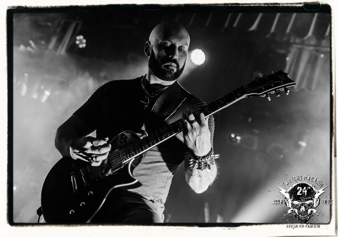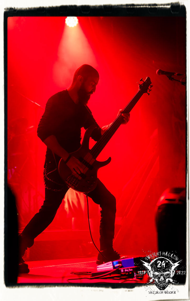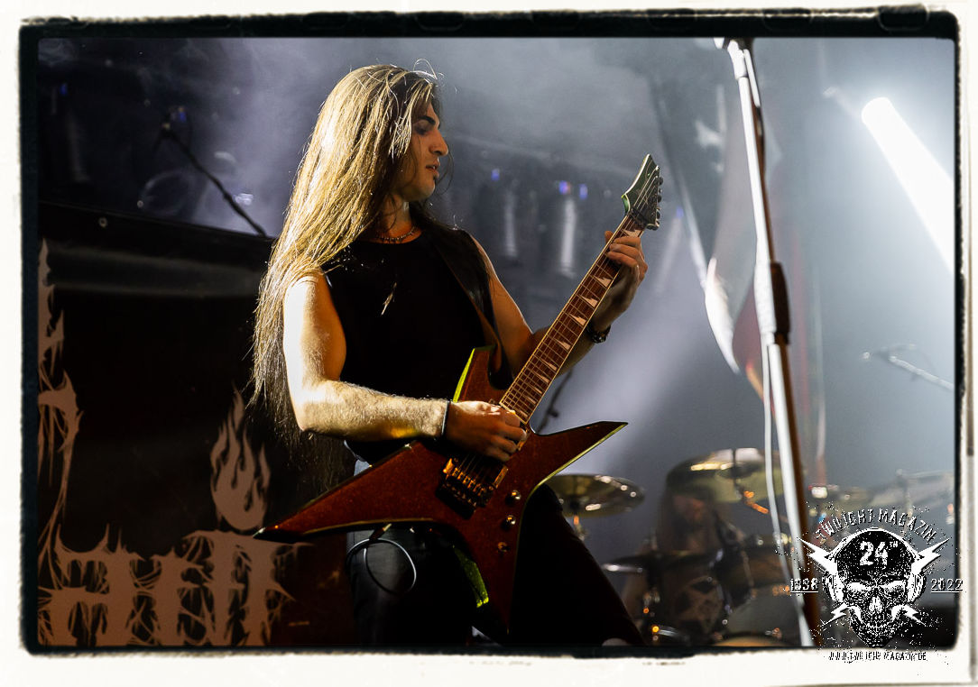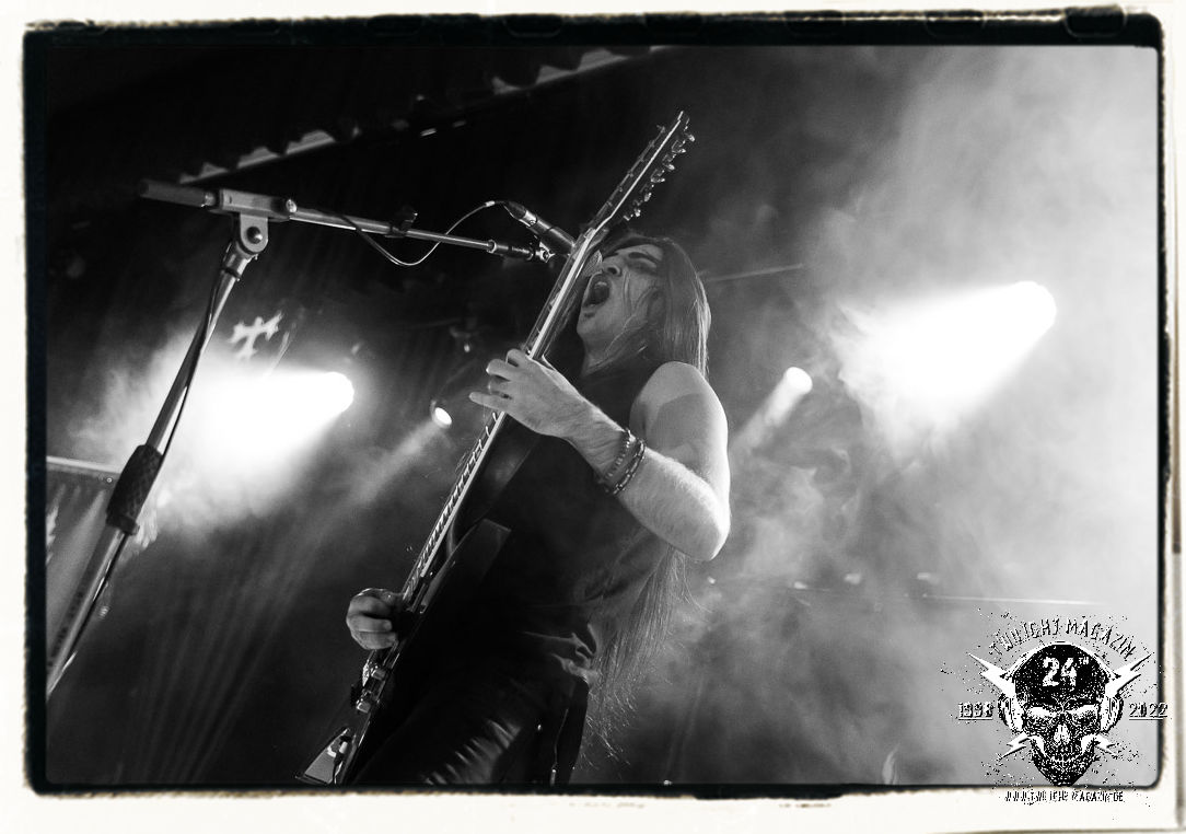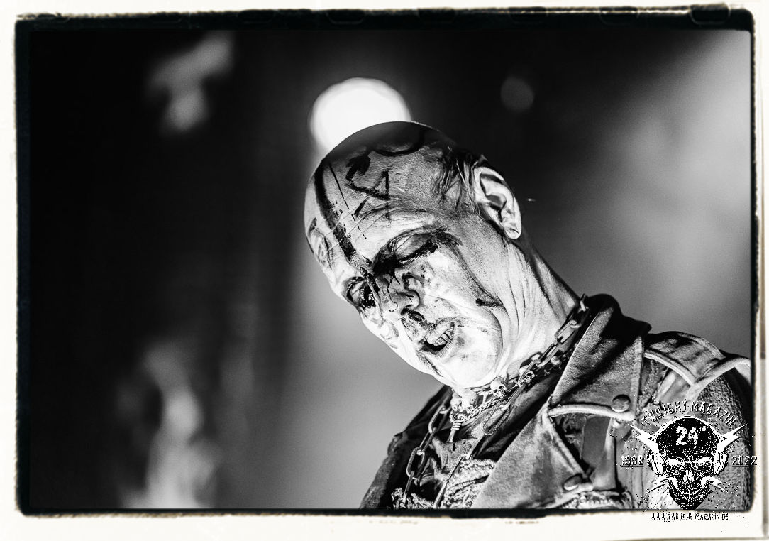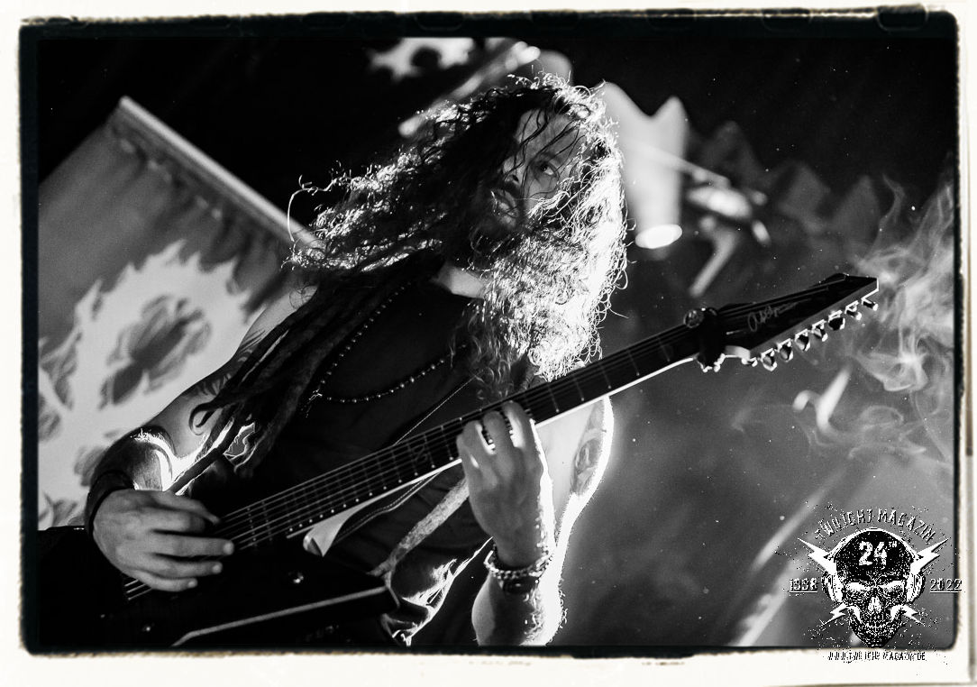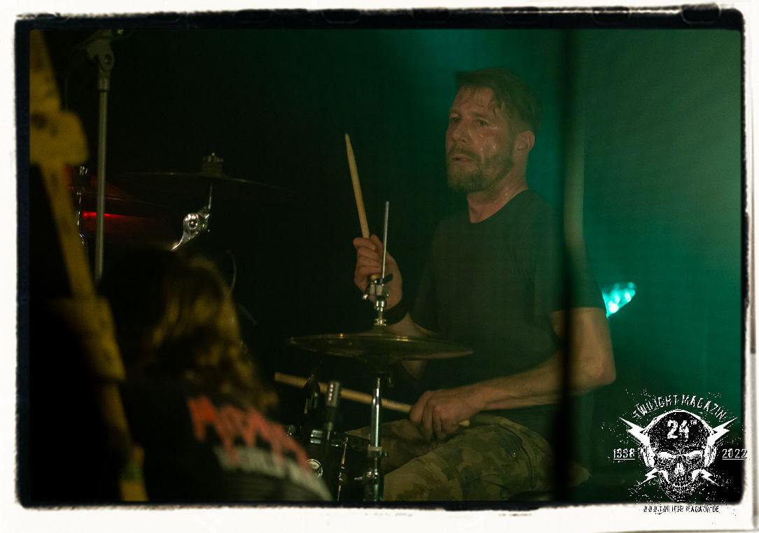 Die einstimmenden Klangkollagen gipfeln schließlich im Percussion-Intro "Silvester Anfang", welches nicht nur die "Deathcrush"-EP von 1987, sondern auch den Beginn des Konzertes einleitet. Endlich betreten Hellhammer, Necrobutcher, die beiden Gitarristen Teloch und Ghul sowie schließlich Sänger Attila Csihar die Bühne. Die Frage nach der Setlist stellt sich zunächst nicht. "Deathcrush", "Necrolust", "Funeral Fog", "Freezing Moon", bei dem die ursprüngliche "When it´s cold, when it´s dark..."-Ansage von Dead eingespielt wird, "Carnage", "Buried By Time And Dust", "Pagan Fears", "Chainsaw Gutsfuck" und schließlich das finale "Pure Fucking Armageddon" entsprechen den Songs, die MAYHEM im November 1990 mit Øystein Aarseth und Per Yngwe Ohlin alias Euronymous und Dead im Eiskeller zu Leipzig spielten. Bassist Necrobutcher lässt es sich nicht nehmen, seine ebenfalls auf dem Live-Album konservierte und seinerzeit der Irritation über die verhaltenen Publikums-Reaktionen geschuldete "Are you dead?"-Ansage noch einmal zu zelebrieren, um danach "Carnage" anzukündigen. Darüber hinaus verzichten MAYHEM glücklicherweise auf überflüssigen Firlefanz, sondern lassen die Musik sprechen. Und so zeichnen sie ein historisches Konzert und den Weg einer Band nach, die in den späten Achtzigern aus dem Death Metal - Underground kam und in der Entwicklung der Protagonisten und Musik schließlich im Black Metal Maßstäbe setzte. "Live in Leipzig" ist aus meiner Sicht auch gerade deshalb so bedeutend, weil es MAYHEM ungefiltert an der Schwelle zwischen den noch deutlich vom extremen Metal der Achtziger geprägten Frühphase in der Entwicklung zu dem Ausdruck zeigt, der schließlich mit dem 1994 veröffentlichten Meilenstein "De Mysteriis Dom Sathanas" nach dem Tod von Euronymous 1993 gipfelte und eine Ära der Band beendete. Natürlich ist das Format 2022 ein anderes und die Band um die verbliebene Rythmus-Sektion Hellhammber/Necrobutcher gewisserweise eine andere. Doch MAYHEM zelebrieren ihr Erbe tatsächlich würdevoll. Die Show ist nicht so chaotisch und abgefuckt, wie auf dem Party.San, was jedoch einer Doku zum Gig geschuldet sein könnte, die zum Revival parallel gedreht wird, und ich würde auch nicht ausschließen wollen dass auch dieser Abend in Leipzig seinen Weg auf einen Tonträger finden wird. Hellhammer ist wie meistens in der Dunkelheit bzw. im dezenten Licht hinter seinem Schlagzeug kaum zu sehen, dafür ist seine Präsenz in beeindruckender Weise zu hören. Attila, seit "De Mysteriis Dom Sathanas" über "Ordo ad Chao" (2007) bis heute wie sein Vorgänger Dead und Nachfolger Maniac untrennbar mit MAYHEM verbunden, beschränkt sich auf sein Organ und seine Fähigkeiten als Hohepriester blasphemischer Gesten und Symbolik. Die beiden Gitarristen Teloch und Ghul sind mittlerweile schon rund zehn Jahre dabei und verkörpern die Fähigkeit der Band, sich immer wieder neu zu erfinden. Sie sorgen für einen dichten Gitarrenteppich. Dabei treten sie nach außen ziemlich gegensätzlich in Erscheinung, der Norweger Teloch mit Corpsepaint wirkt extrem grimmig, die Les Paul-Adaption lässig tief hängend, der Brite Ghul ungeschminkt, durchtrainiert, die Gitarre dabei unter der Brust. Posieren können sie jedoch beide. Und Necrobutcher ist Necrobutcher, zuständig für Bass, Wein und "Kommunikation" mit dem Publikum.