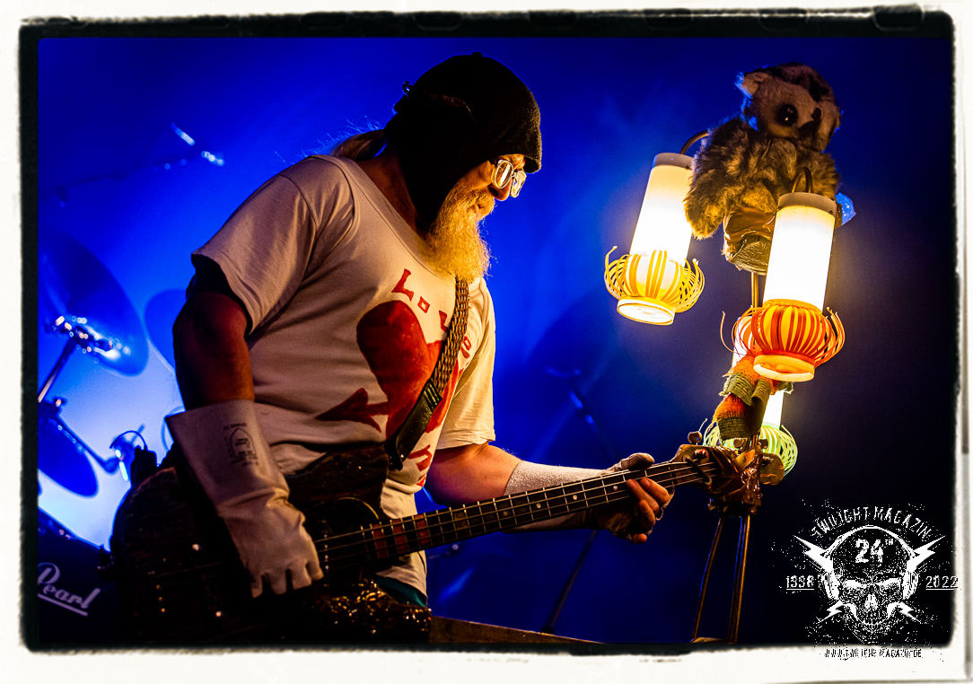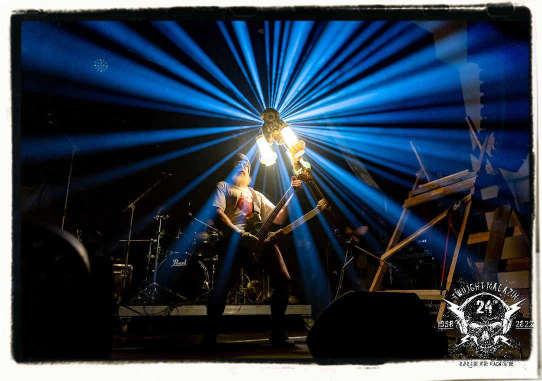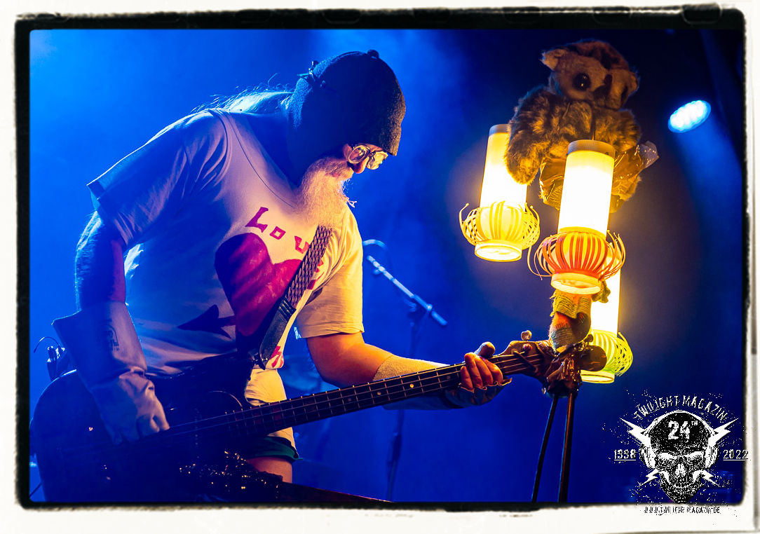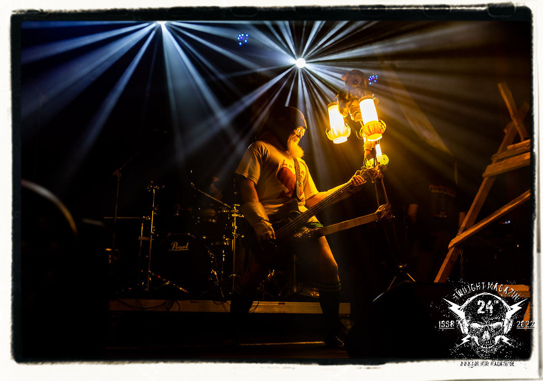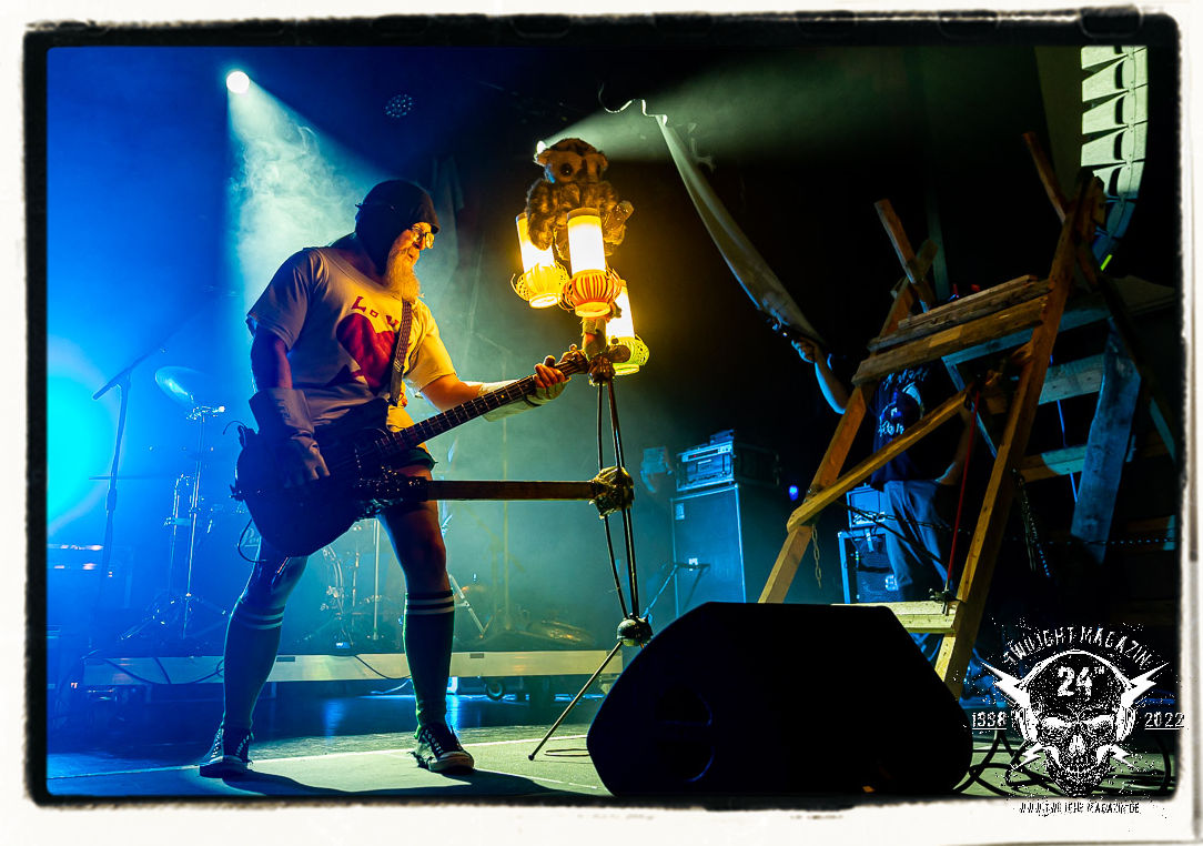 Die Urgesteine von MANOS waren schon am 26.11.1990 Vorband im Eiskeller. Damals normal, würde heute wohl kaum ein Veranstalter auf die Idee kommen, MAYHEM mit MANOS auf einen Einzelgig zu buchen. Allerdings verbindet MANOS mit den Schwarzmetallern MAYHEM ungeachtet vom kommerziellen Erfolg heute nach wie vor Die Anti-Haltung. Während sich diese bei MAYHEM in Form einer musikalischen Breitwand-Inszenierung zeigt, stehen MANOS für eine metallische Grind- und Hardcore-Persiflage, die Klischees einer testosterondominierten Szene ad absurdum führt. Das Ritual von Basser Eule, Gitarrist/Sänger Andrew und Drummer Ratze ist bunt, farbenfroh und lebensbejahend. Konzerte von MANOS dürfen und sollen Freude machen. Das Trio aus Querfurt in Sachsen-Anhalt ist nicht nur, vor allem aber im Osten Deutschlands absoluter Kult, weil sie es schaffen, brutalen Death Metal mit Hardcore, Punk und Grindcore über ihren ureigenen Humor zu verbinden, der trotz des subtilen Slapstiks authentisch, weder gekünstelt, noch albern wirkt. Und MANOS haben es bei ihrem Heimspiel daher auch nicht nötig, sich im historischen Schatten der Norweger zu verbiegen, sondern ziehen ihren Stiefel einfach durch. Einzig auf einen weihnachtlichen Tannenbaum am Bass verzichtet Eule am heutigen Abend. Ansonsten gibt´s das volle Programm inkl. "Ulehule", der Querfurter Bockwurst, "Komm in den Garten", "Biene Maja" oder "Teacher´s Pants" etc. pp. Gerutscht werden darf natürlich auch, denn das Publikum ist ein integraler Bestandteil einer jeden MANOS-Show. Nach rund einer Stunde ist der seriöse Teil des Abends dann auch vorbei. "Wer hat an der Uhr gedreht?", die Querfurter müssen sogar nachsitzen, da sie noch für eine Spontanzugabe auf die Bühne zurückgebrüllt werden.