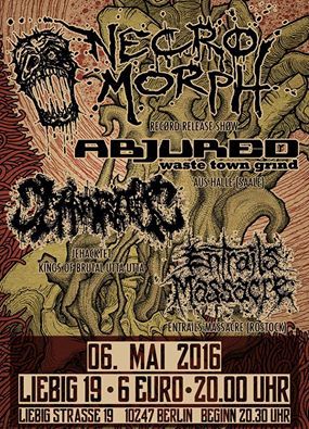 Die Berliner Crust Grinder NECROMORPH laden zur Release Party des am selben Tag erscheinenden Albums ´Under The Flag´. Als ich ankomme, steht schon eine fette Traube von Leuten vor dem Laden. Es scheint, als hätten NECROMORPH es geschafft, die Berliner Szene zusammenzubringen, sogar die, die noch etwas unter den Folgen des gestrigen Herrentags litten. Aber wer kann diesem Billing für den Eintritt von 6 Euro schon widerstehen?
