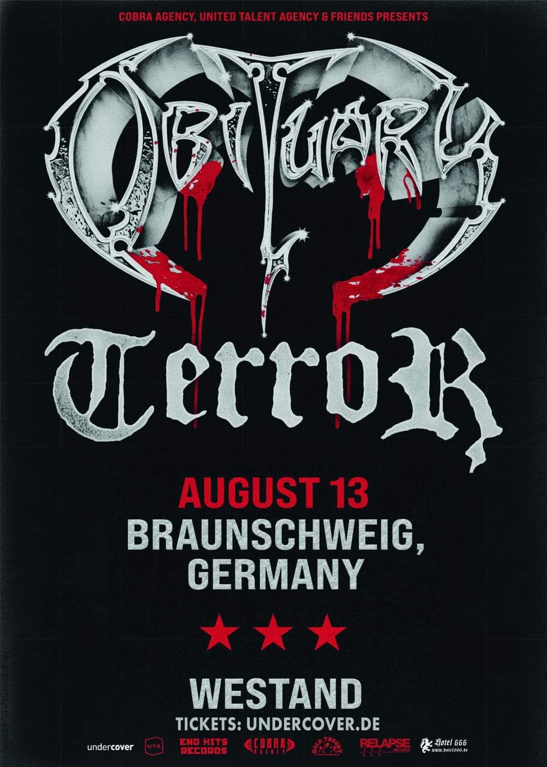 Als Support haben OBITUARY für einige Einzelshows TERROR eingeladen. Ich mag es, wenn die Bands unterschiedliche Stile spielen und eine Schnittmenge ist ja auf jeden Fall da und auch der Bandname passt. Die Abfrage von Sänger Scott Vogel ergibt dann, dass sich doch viele TERROR-Jungfern im Publikum befinden.