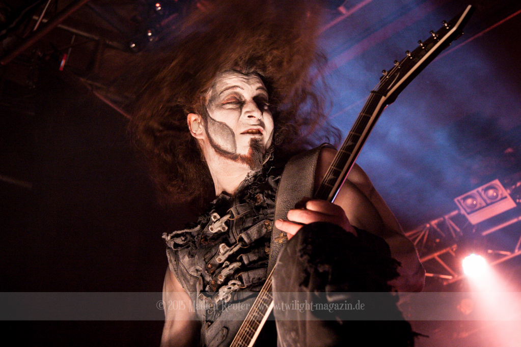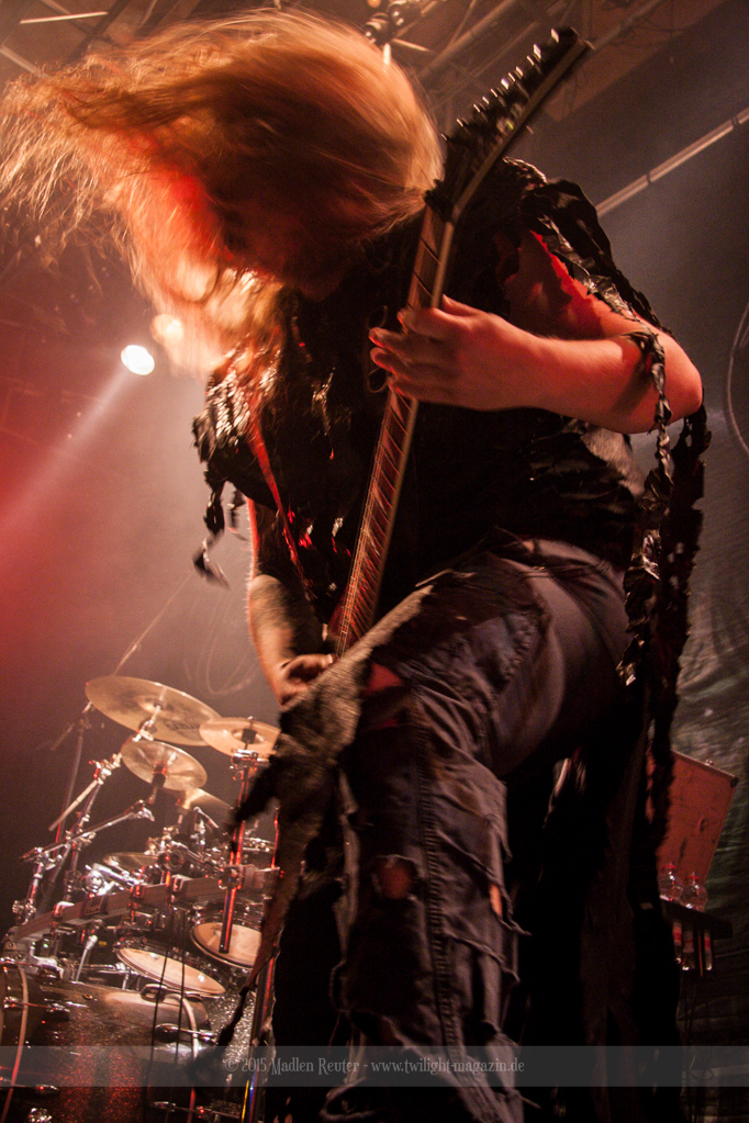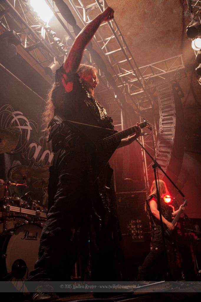 Nach kurzem Umbau wurde es dann Zeit für einen kurzen Ausflug nach Ravenhead. ORDEN OGAN übernahmen das Ruder und heizten den Anwesenden fleißig ein. Neben beeindruckenden Soli, fetten Riffs und brachialen Mitgröhlhymnen bestach die Band auch durch ihren Humor. Sänger Seeb erntet für seine lustigen Ansagen mehrfach Applaus. Auch sonst ist das Publikum fleißig dabei. Zwar brauchen die Besucher meist eine kurze Aufforderung, aber dann läuft es auch wie geschmiert. Die Setlist schien vor allem einen Schwerpunkt auf das neue Album („Ravenhead“, 2015) gesetzt zu haben. Grandios war es „Sorrow Is Your Tale“ live zu erleben, auch wenn mir „To New Shores Of Sadness“ eindeutig gefehlt hatte. Während vor der Bühne die Haare flogen, zockten Tobi und Seeb beeindruckende Soli auf ihren Gitarren. Dieses Teamspiel ist wirklich herrlich mit anzusehen. Und auch an diesem Abend fand sich wieder eine verirrte Seele, die mit lautstarken „Noch Ein Bier“-Rufen Aufmerksamkeit erhaschen wollte. Einzig richtige Reaktion vom Ordensoberhaupt: „Falsche Band man!“. Damit hatte sich die Geschichte für den restlichen Abend erledigt – Vielen Dank!