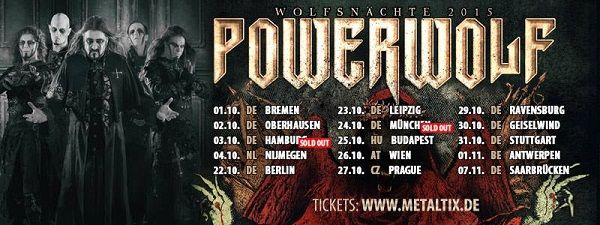 Ungeduldig wurde anschließend die Ankunft der Wölfe erwartet. Durch den schwarzen Vorhang, der die komplette Bühne verdeckte, wurde die Anspannung noch größer. Als eben jener fiel, gab es kein Halten mehr. Schon vom ersten Augenblick an stellen die Powerwölfe klar, wer der Herr im Ring ist. Vor Energie strotzend flitzten sie über die Bühne und zogen alles und jeden, in ihren Bann. Es brauchte kaum eine Aufforderung seitens der Band um eine Reaktion vor der Bühne zu sehen. Die Songs haben eine unglaubliche Kraft, die durch die starke Bühnenpräsenz noch einmal verstärkt wurde. Bei jedem Song flogen unzählige Haare durch den Raum. Nebst dem konstanten Gebange tat sich auch ein Moshpit auf, es wurde umhergesprungen und einfach eine wilde Wolfsnacht zelebriert. Das Aladin wurde kurzerhand in eine subtropische Saunahalle umfunktioniert, in der eine unglaublich geniale Stimmung herrschte – Und das an einem Donnerstag. Alle Achtung! Die beiden Backdrops, und besonders der Wechsel zwischen diesen, waren einfach die reinste Augenweide. Vor allem in Kombination mit der grandiosen Lichtshow blieben keine Wünsche offen. Nicht das man sich daran schon nicht satt sehen konnte, nein, zusätzlich turnten auch noch die Wölfe in dieser genialen Kulisse herum.