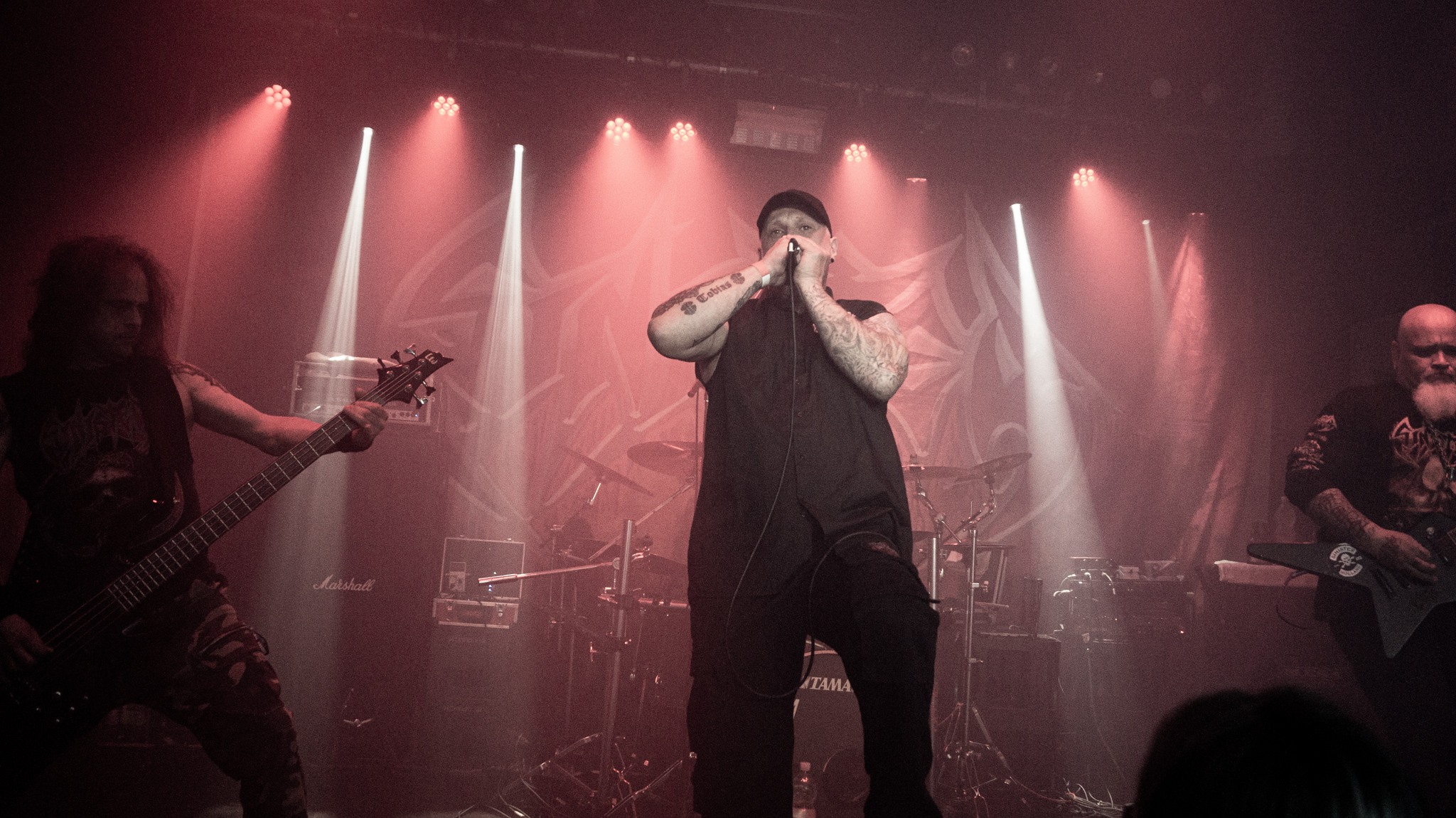 Dann übernehmen SINISTER und meine Erwartungen sind hoch. Ich habe die Jungs das erste Mal vor über 30 Jahren als Support von CANNIBAL CORPSE gesehen und war begeistert. Im Laufe der Jahre haben es die Niederländer auf satte 14 Alben gebracht und sind eine absolute Konstante im niederländischen Death Metal. Bekanntermaßen hat der ehemalige Schlagzeuger Aad Kloosterwaard ja ans Mikro gewechselt. An diesem Abend ist er der Schwachpunkt der Band. Es scheint, als hat der Shouter keine Lust auf diesen Gig. Dagegen ist Max Cavalera hinter dem Mikro eine agile Rampensau. Zwischen den Songs herrscht oft komplette Stille, da ist ein Frontman dann schon gefragt und sollte dem Publikum nicht nur schweigend den Rücken zudrehen. Die zwei kleinen Rauchsäulen am Bühnenrand reißen da auch nichts raus. Und selbst wenn das Publikum bei Klassikern wie ´Sadistic Intent´ Energie freisetzt springt die nicht auf die Band über. Lediglich Gitarrist Walter Tjwa bemüht sich um etwas Bewegung. Der hat es aber auch nicht leicht, denn über weite Strecken fehlt einfach die zweite Klampfe. Der Bass schafft es nicht, die bei Soli entstehenden Lücken zu füllen. Nach einer vom Publikum nur sehr verhalten geforderten Zugabe geht der Gig dann nach nur 60 Minuten zu Ende. Enthusiasmus und Spielfreude gehen anders. Klar gab es gute Songs zu hören, da wäre aber wesentlich mehr drin gewesen. Schade. Um nochmal zu den Tourbuddies CANNIBAL CORPSE zurückzukommen. Die haben zwei Tage später bewiesen, das Spielfreude keine Frage des Alters ist.