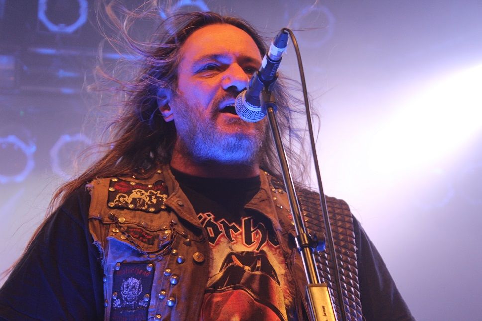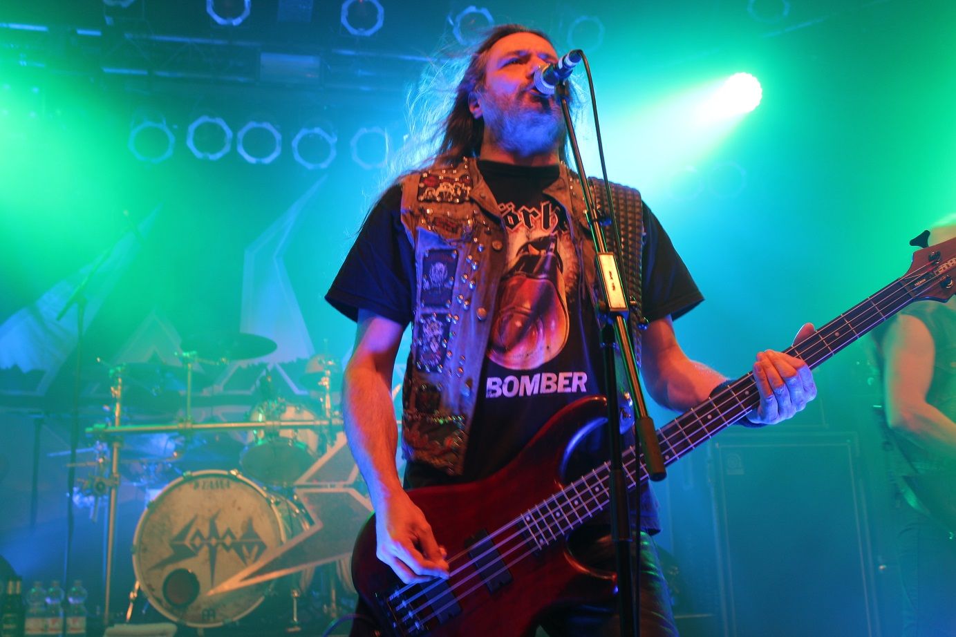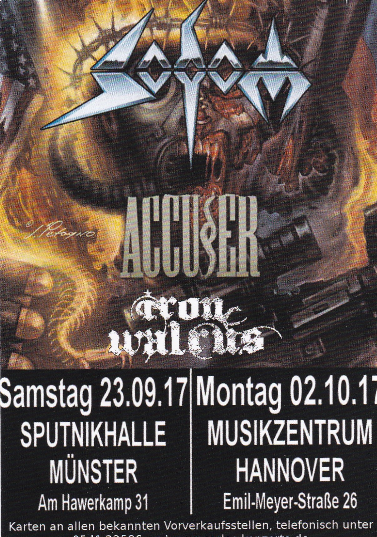 Als SODOM danach das Musikzentrum übernehmen ist es so pickepackevoll, dass Umfallen nicht mehr möglich ist. Hannover hat lange gewartet und empfängt Makka, Bernemann und Tom wie seine verlorenen Söhne. Trotz anfänglicher technischer Probleme hallen dem Trio von Beginn an frenetische wie bedingungslose "Sodom"-Sprechchöre entgegen, was die Band nicht nur ernsthaft zu rühren scheint, sondern auch Tom dazu veranlasst, kurzerhand das Handy zu zücken: "Dat glaubt mir keiner, dass wir hier in Hannover sind!" und zur Feststellung verleitet, dass man zukünftig nicht mehr bis nach Südamerika fliegen müsse, wenn man doch in Hannover die gleiche Atmosphäre habe. Wie dem auch sei. Sodom zahlen doppelt und dreifach zurück, mit Spielfreude, absoluter Hingabe und einem Tom Angelripper, der mit seinem Publikum scherzt, nicht mit Anekdoten geizt aber auch nachdenkliche Töne hinsichtlich der Bluttat von Las Vegas, welche seit dem Nachmittag durch die Medien geistert, anschlägt. Die Stage-Crew hat jede Menge zu tun, nachdem Tom die Bühne für´s Diven freigibt. Das Trio genießt die ihnen entgegen gebrachten Emotionen sichtlich und liefert mit einer Setlist, die länger und länger wird und in dieser Gesamtlänge wohl kaum geplant gewesen sein dürfte, und die neben Standards, viele lange nicht mehr dargebotene Klassiker und aktuelle Songs von "Decision Day" und "Epitome Of Torture" enthält. Hier zeigt sich, dass gerade auch das neue Material im Vergleich zur restlichen Diskografie nach wie vor Relevanz und Qualität hat. Am Ende sind es locker zwei Stunden Sodom, die dieses Konzert zu einem absoluten Favoriten auf das Konzert des Jahres werden lassen. Da fällt es auch gar nicht ins Gewicht, dass heute eigentlich noch ein Interview geplant war, was jedoch leider nicht zustande gekommen ist. Denn ein besseres Statement als diesen Gig gibt es nicht. "Iron Fist" als Hommage an Lemmy, "Nuclear Winter", "Stigmatized", "Caligula", "Sacred Warpath", "Who Is God", "In Retribution", "City Of God", "Outbreak Of Evil", "M 16", "Rolling Thunder", "Blasphemer", "Ausgebombt", "Fuck The Police", "Remember The Fallen", "Bombenhagel", "Agent Orange", "In War And Pieces", "The Saw Is The Law", "Tired And Red" und, und, und... Sodom hätten ewig weiter spielen können.