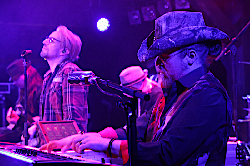 Direkt am Bühnenrand ließen sich um 20 Uhr die amerikanischen Prog-Metaller WITHERFALL nieder und griffen zu den Instrumenten. Die Amis haben passend zum Tour-Motto mit „Vintage“ eine Akustik-EP im Gepäck, so dass der Posten als Anheizer für SONATA ARCTICA hervorragend passte. Mit Ahmad Dubose-Dawson an den Trommeln, Rasseln usw. und Alex Nasla an den Keyboards und dem Background Gesang hatten die Kaliforniern gleich zwei Leute mit an Bord, die ich bislang noch nicht kannte. Allerdings bin ich auch wirklich kein WITHERFALL Experte. Gleich zu Beginn der Show wurde klar, dass das Akustik-Setting auch für professionelle Musiker gewöhnungsbedürftig ist, denn die Atmosphäre ist deutlich intimer, die Kommunikation zwischen Musikern und Publikums unmittelbarer. So schlichen sich selbst bei solch versierten Musikern wie WITHERFALL anfangs einige Unsicherheiten ein. Darüber sahen aber sowohl Fans als auch Musiker mit einem Lächeln hinweg und irgendwann hatte sich die Band dann auch eingegroovt und ließ sich weder vom herben Jever Pils noch von kleinen Abspracheproblemen nicht aus der Ruhe bringen. Im Gegenteil, Anthony Crawford frickelt in atemberaubendem Tempo auf seinem Tieftöner rum und Gitarrist Jake Dreyer flitzte regelrecht über das Griffbett seiner Akustikklampfe. Frontmann Joseph machte nicht nur durch sein samtrotes Jackett auf sich aufmerksam, sondern auch durch stimmliche Ausflüge in höchste Regionen. Spätestens mit „Ode To Despair“ hatte die Band das Publikum auf seiner Seite und Songs wie „I want back down“ von TOM PETTY oder „The Great Awakening“ vom 2017er Debüt der Band wirkten auch im akustischen Gewand perfekt. Vielleicht hätten sich einige der Anwesenden dennoch gewünscht, dass die Jungs „Fade to Black“ zu Ende bringen. Nächstes Mal vielleicht. Nach einer knappen Stunde konnten WITHERFALL jedenfalls zufrieden von der Bühne gehen und das Publikum verabschiedete die sympathischen Amis mit donnerndem Applaus.