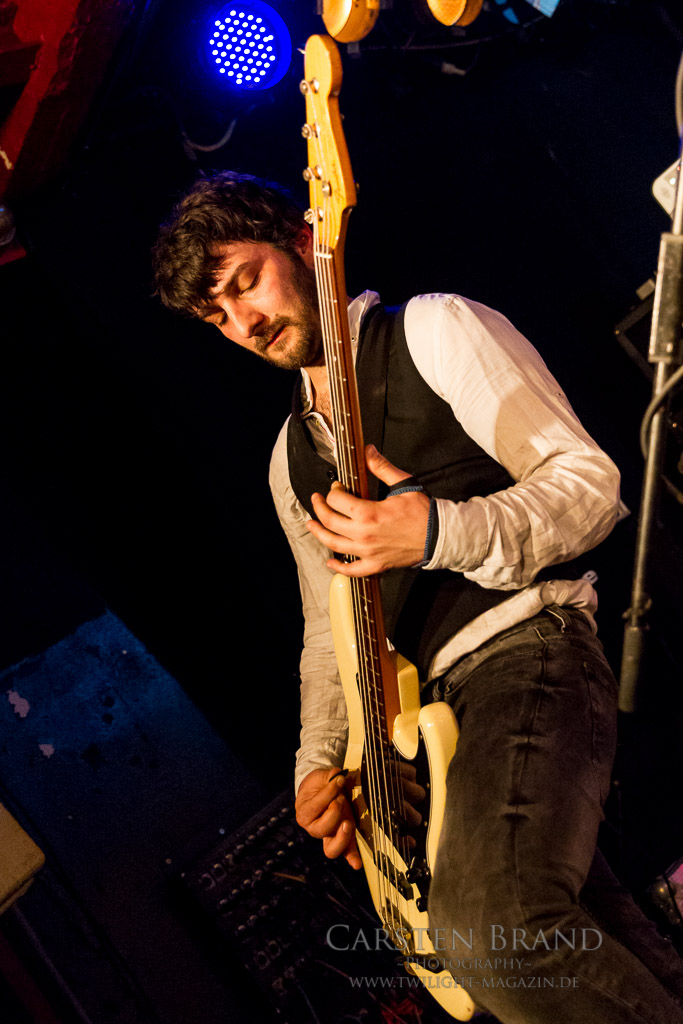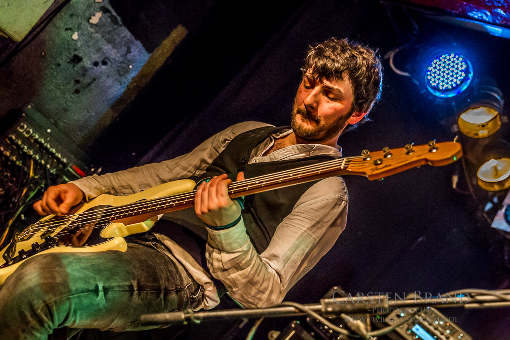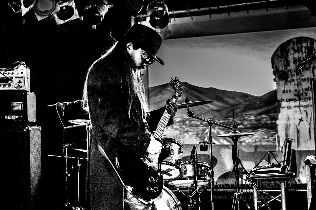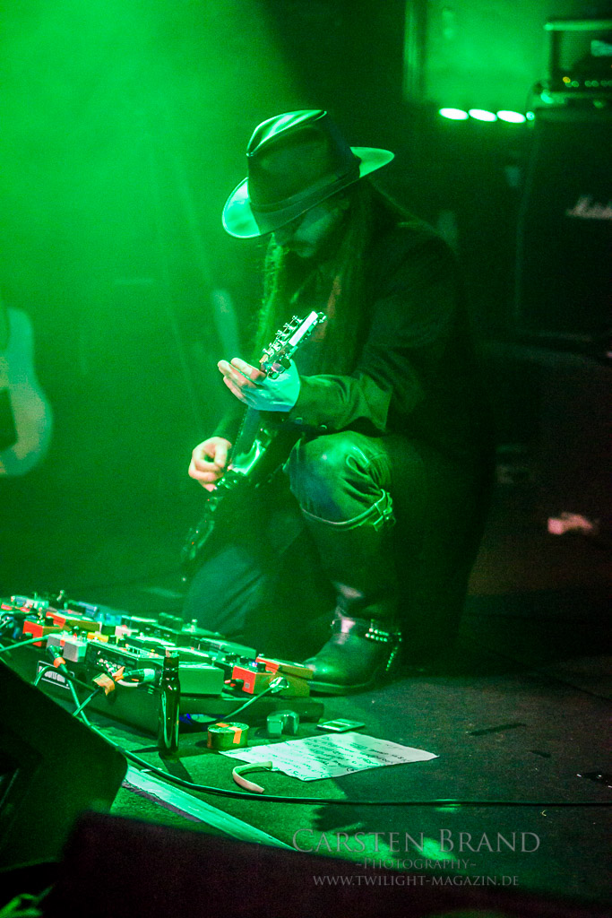 Also auf nach Hamburg. Das Konzert fiel auf einen Sonntag, nicht der beste Tag, um einen vollen Konzertsaal zu erwarten. Dennoch fanden viele Fans den Weg in das kleine Marx. Die erste Vorband war niemand geringerer als Aggalochs Mastermind JOHN HAUGHM. Als Solokünstler betrat er allein mit seiner Gitarre die Bühne. Eine extravagante und sehr spezielle Show. Auf seine experimentelle Gitarrenmusik muss man sich einlassen können. Hinzu kamen in Hamburg wohl technische Probleme, die den Auftritt erschwerten. Jedenfalls war es sehr schwer, dem kompletten Auftritt zu folgen.